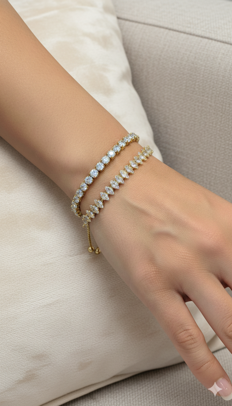 צמיד מקסים ועדין המורכב מרצף זירקונים שקופים עגולים משובצים ושרשרת עדינה. הצמיד בציפוי ישראלי איכותי והיפואלרגני של זהב 24 קראט ובעל סוגר המתכוונן לכל גודל יד ובקצוותיו זירקונים משובצים. הפריט מגיע ארוז למתנה ועם אחריות לשנה. ניתן להוסיף ברכה אישית ופתק החלפה.