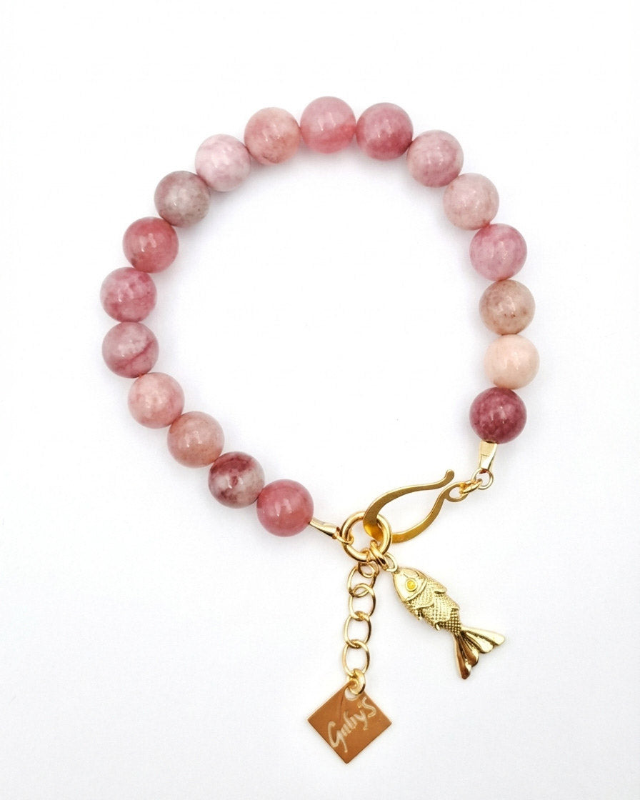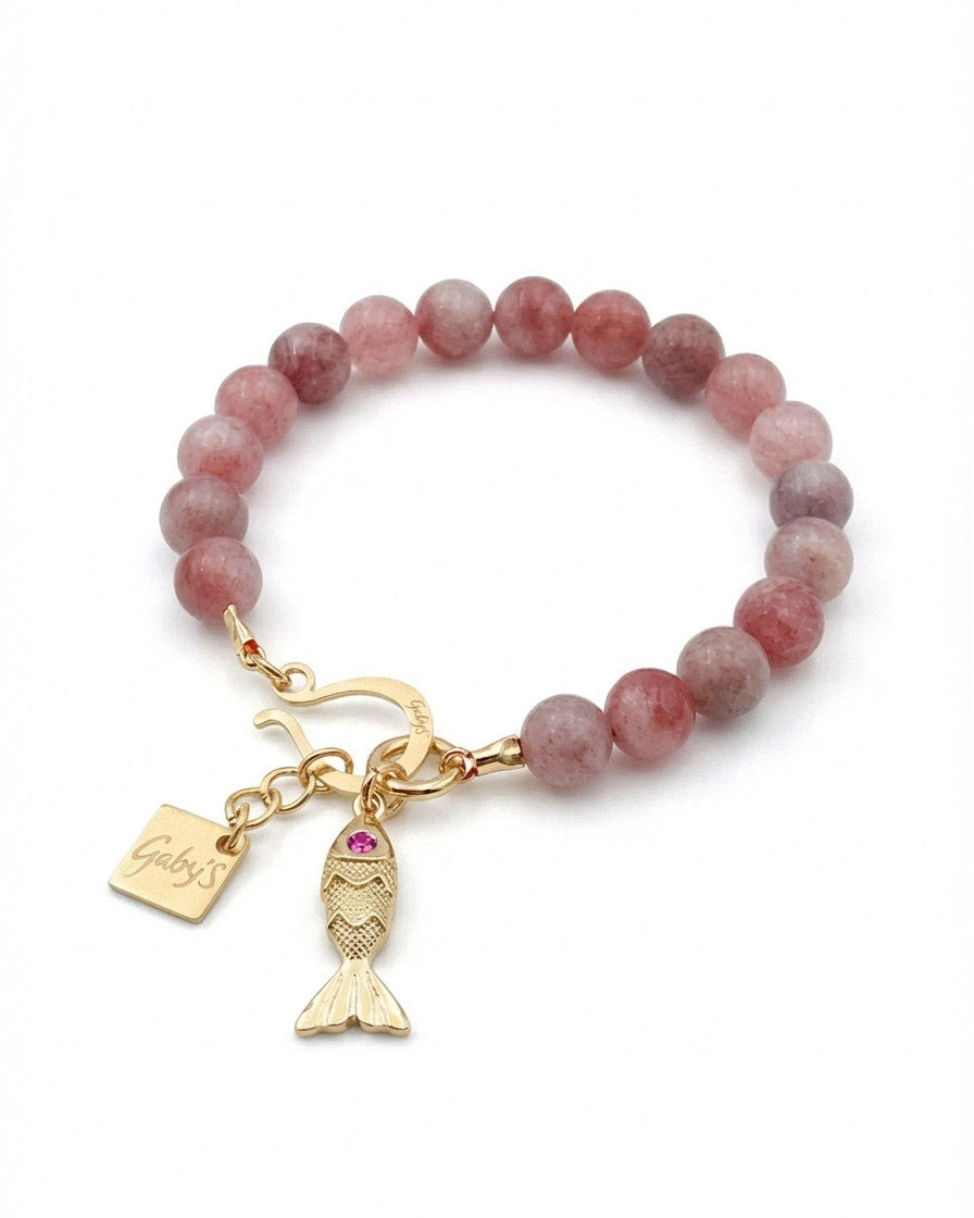 צמיד אבני קוורץ בגווני אדמדם ורוד בהיר ותליון בצורת דג קטן משובץ זירקון ובעל תנועתיות. האלמנטים בצמיד בציפוי ישראלי איכותי של זהב 24 קראט. הפריט מגיע ארוז למתנה ועם אחריות לשנה. ניתן להוסיף ברכה אישית ופתק החלפה.