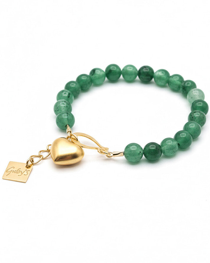 צמיד אבני קוורץ בגווני ירוק ותליון לב בעל נפח. האלמנטים בצמיד בציפוי ישראלי איכותי של זהב 24 קראט. הפריט מגיע ארוז למתנה ועם אחריות לשנה. ניתן להוסיף ברכה אישית ופתק החלפה.