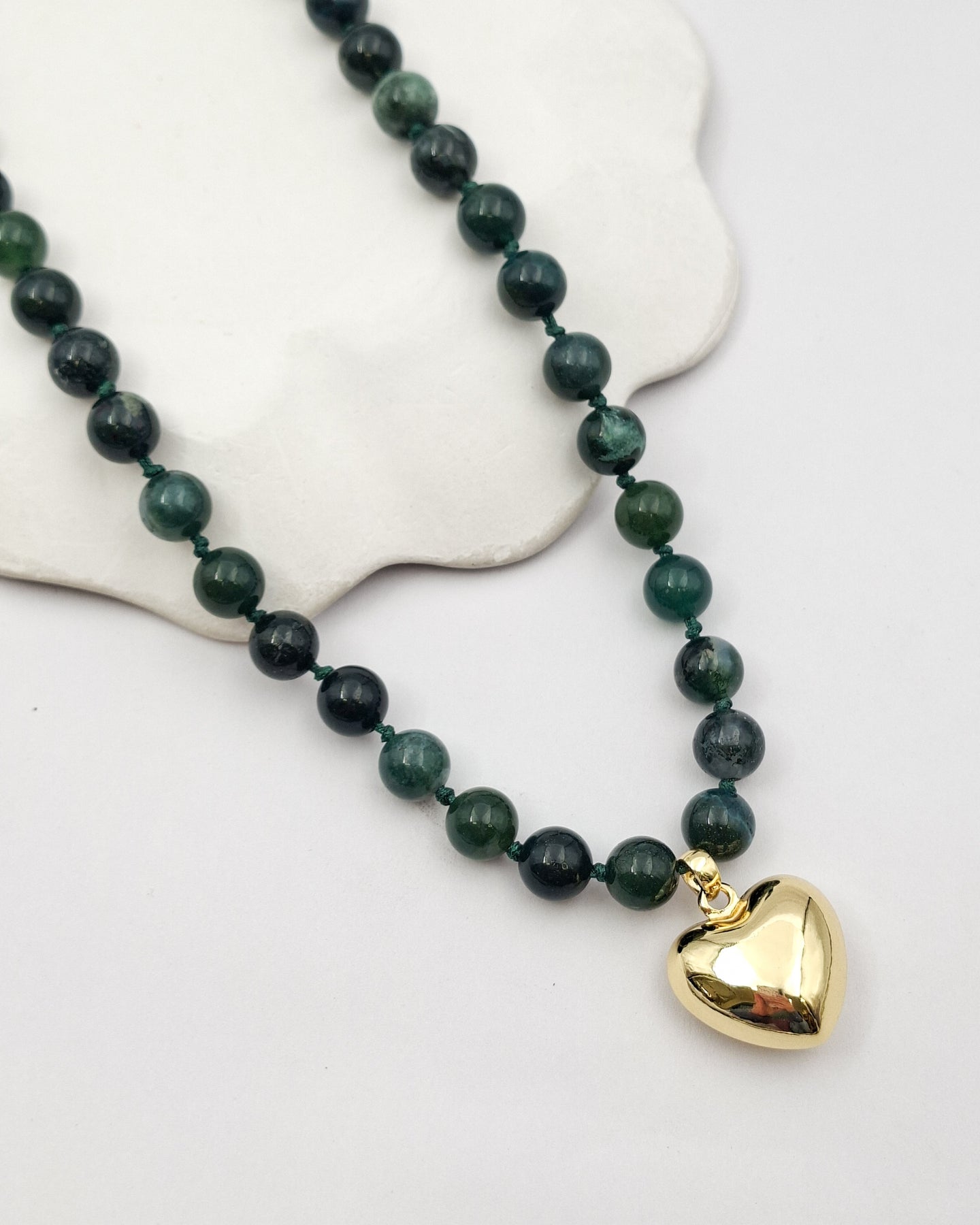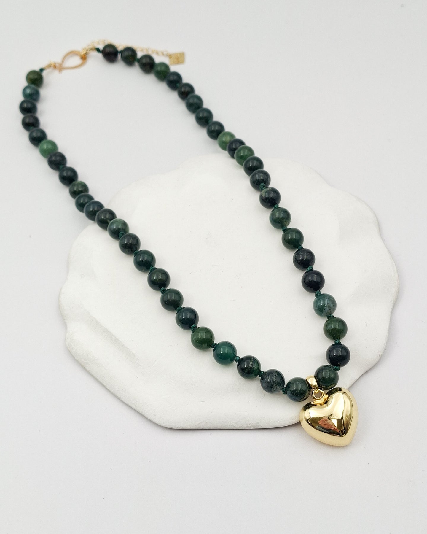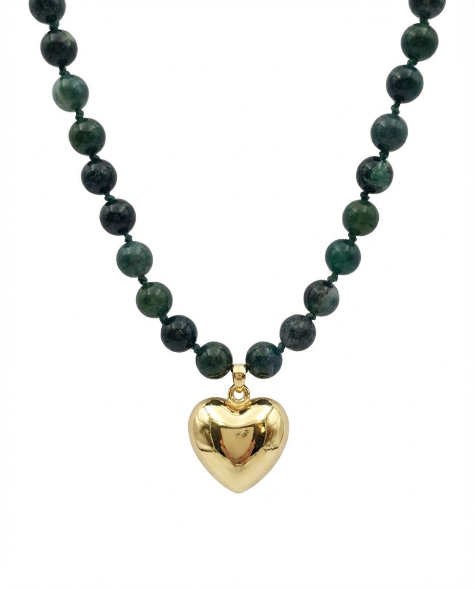 שרשרת קצרה מאבני קוורץ בגווני ירוק עמוק ותליון לב בעל נפח. האלמנטים בשרשרת בציפוי ישראלי איכותי של זהב 24 קראט. הפריט מגיע ארוז למתנה ועם אחריות לשנה. ניתן להוסיף ברכה אישית ופתק החלפה.