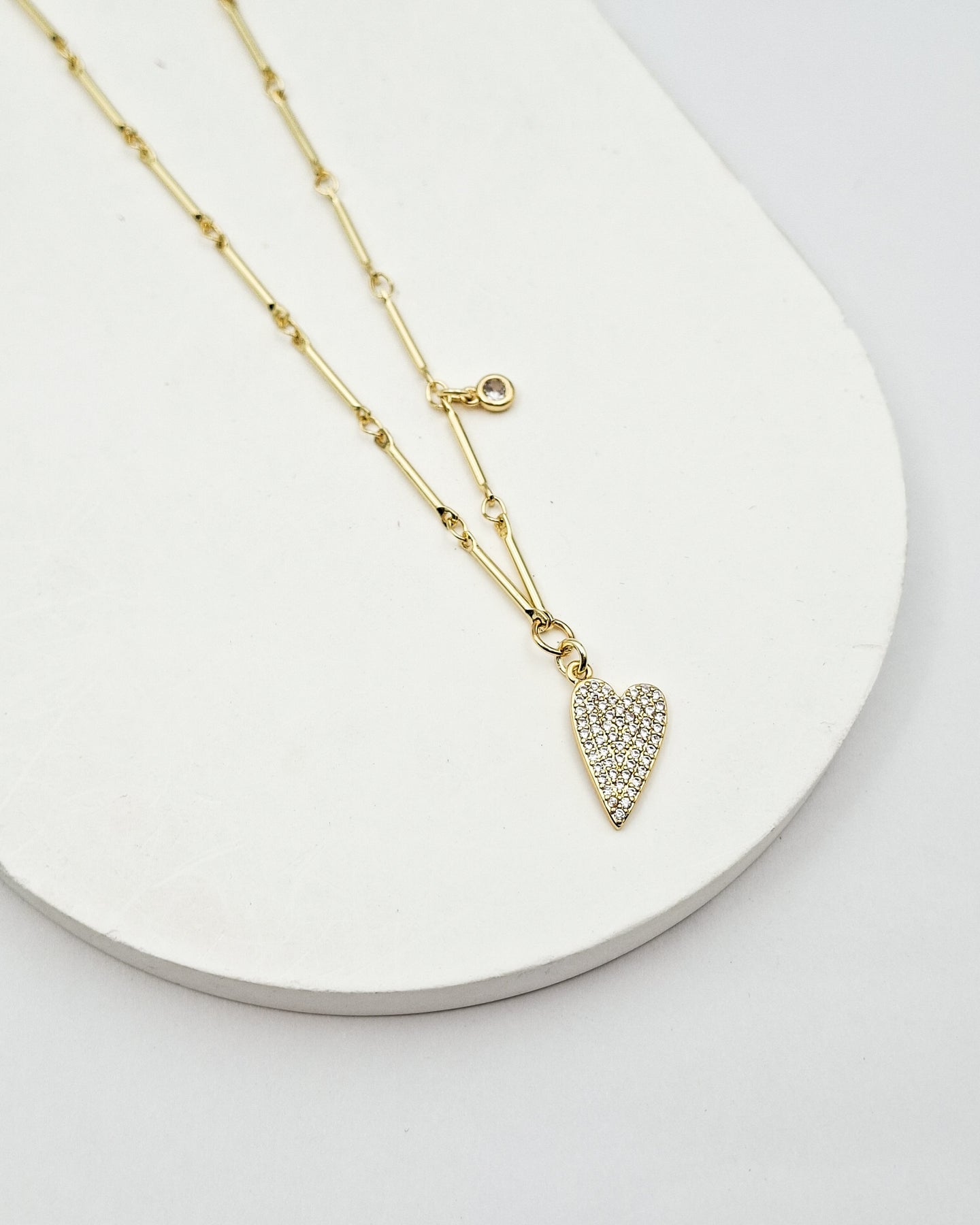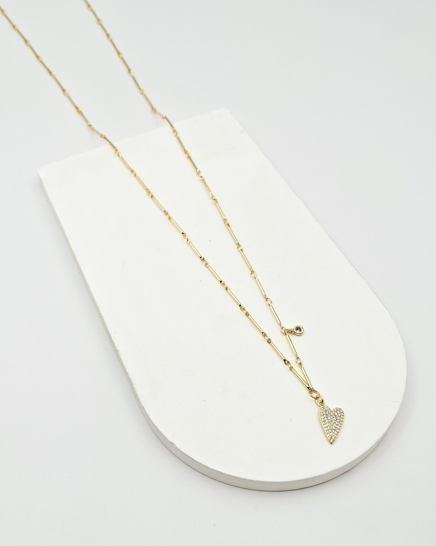 שרשרת ארוכה המורכבת מחוליות מוארכות המחוברות זו לזו בלולאות קטנות עם תליון בצורת לב משובץ זירקונים וזירקון עגול משובץ קטן תלוי. השרשרת בציפוי זהב איכותי והיפואלרגני. הפריט מגיע ארוז למתנה ועם אחריות לשנה. ניתן להוסיף ברכה אישית ופתק החלפה.