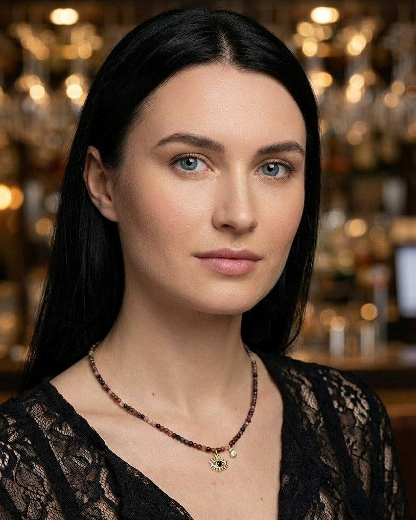 שרשרת קצרה ועדינה מאבנים טבעיות קטנות במבחר גוונים לבחירתך עם תליון בצורת עין משובצת זירקון כחול ותליון נוסף של זירקון עגול. ניתן לענוד לבד או בשילוב שרשראות נוספות למראה שכבות. האלמנטים בשרשרת בציפוי ישראלי איכותי והיפואלרגני של זהב 24 קראט. הפריט מגיע ארוז למתנה ועם אחריות לשנה. ניתן להוסיף ברכה אישית ופתק החלפה.