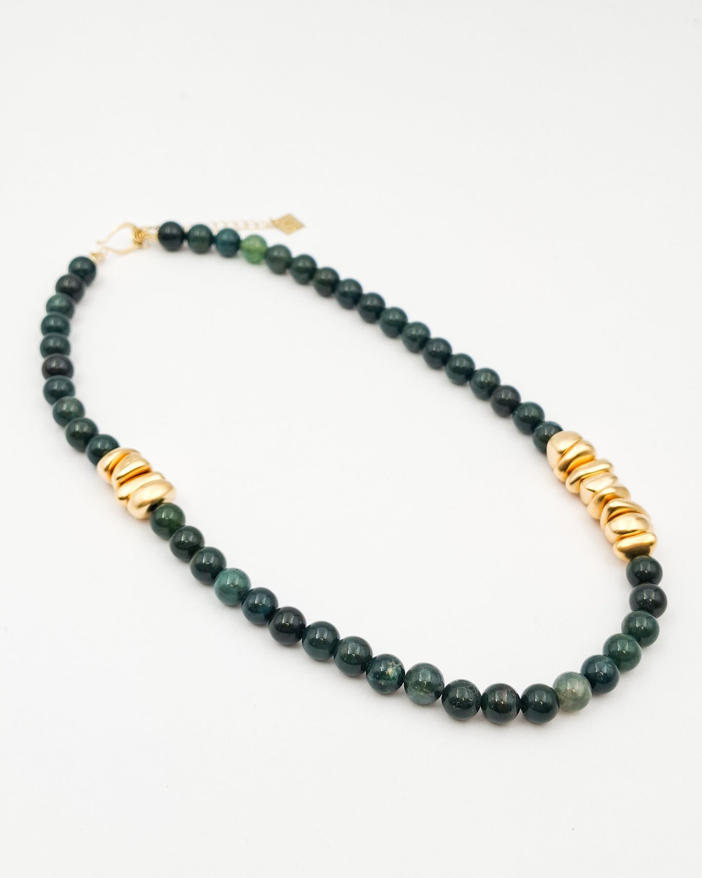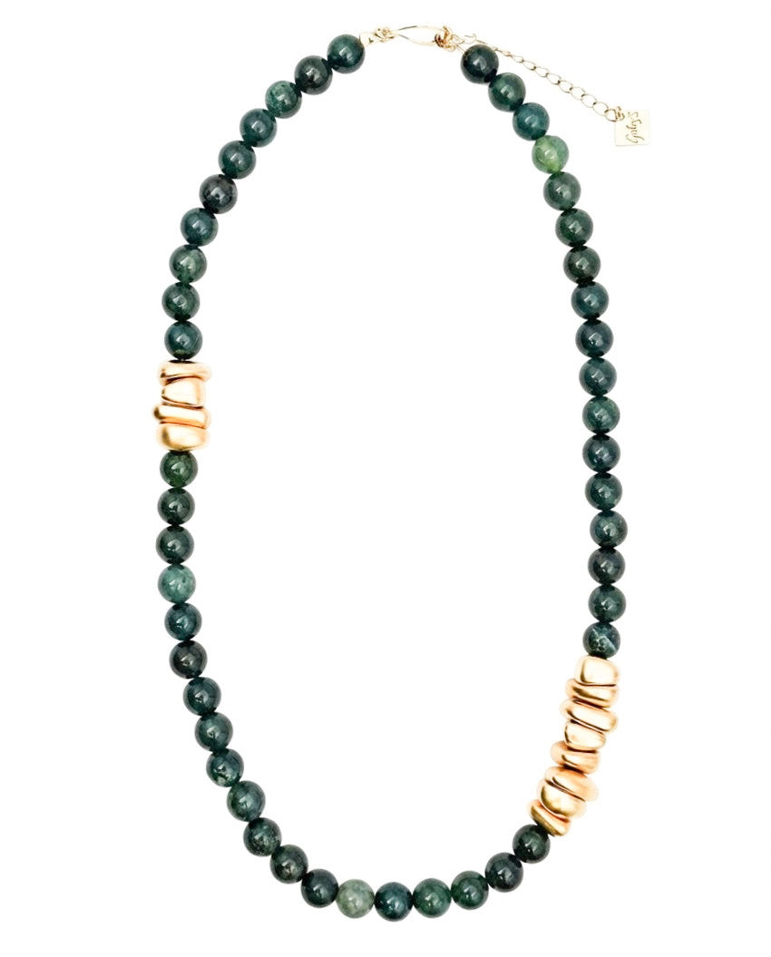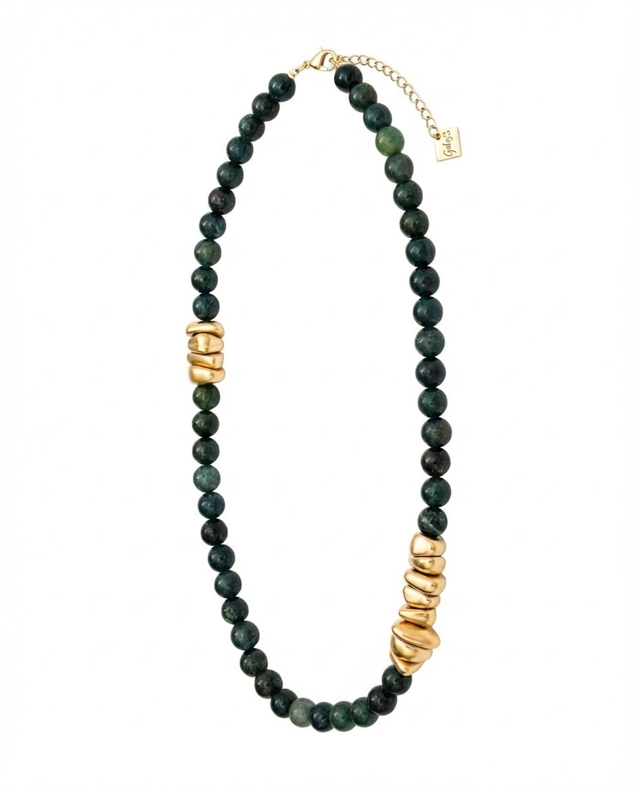 שרשרת עשירה עשויה אבני חן בגווני ירוק כהה בשילוש אלמנטים בציפוי איכותי ישראלי של זהב 24 קראט.