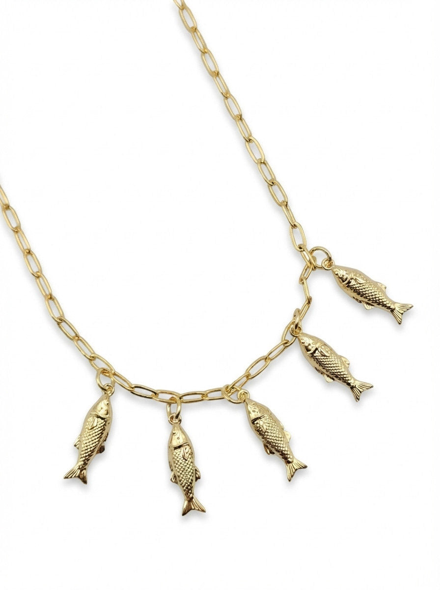 שרשרת קצרה ומהממת בצורת חוליות מלבניות עם חמישה תליונים של דגים קטנים. השרשרת בציפוי ישראלי איכותי של זהב 24 קראט. הפריט מגיע ארוז למתנה ועם אחריות לשנה. ניתן להוסיף ברכה אישית ופתק החלפה.