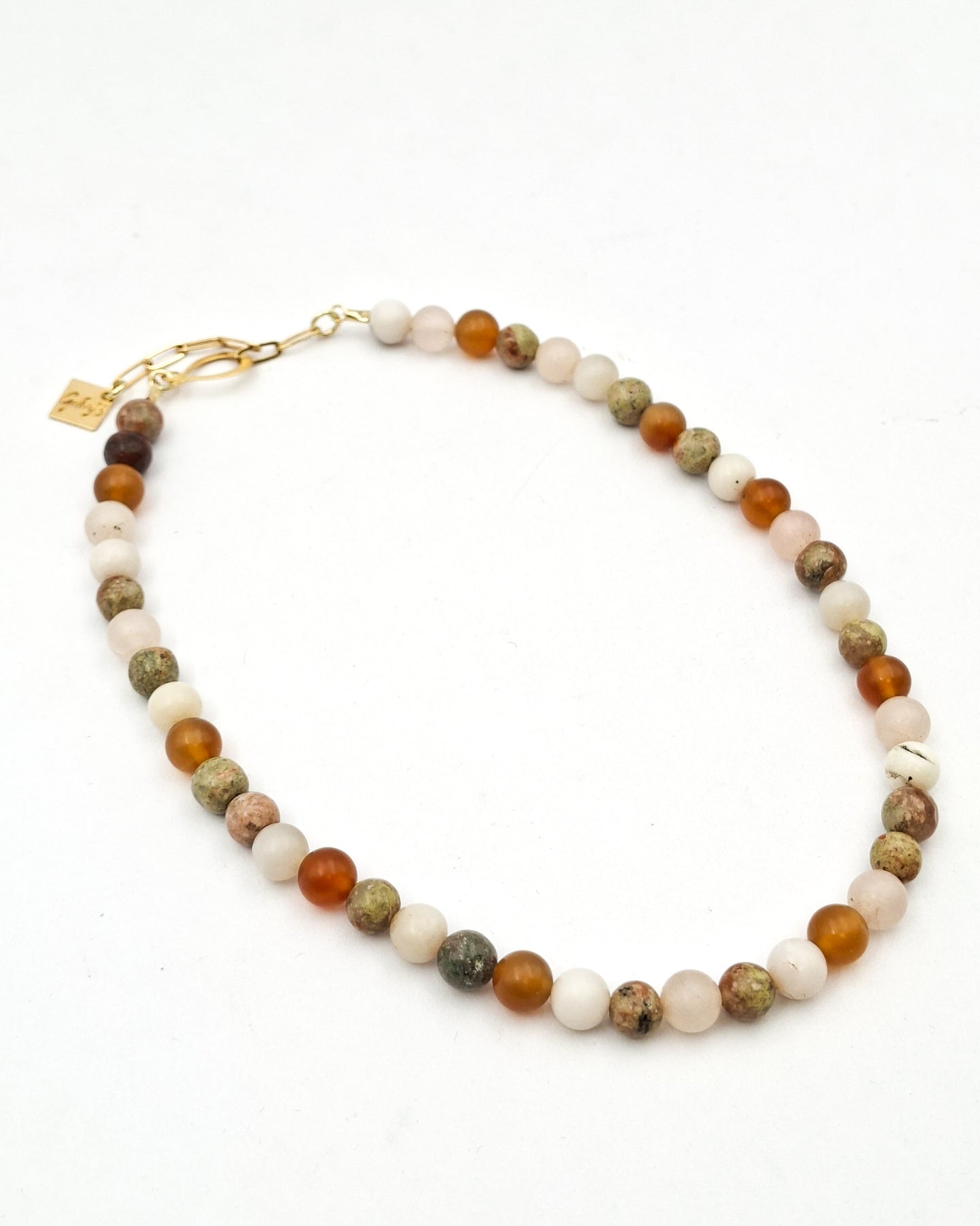שרשרת קצרה מאבני קוורץ במיקס גווני אדמה משתנים. ניתן לענוד לבד או בשילוב שרשראות נוספות למראה שכבות. האלמנטים בשרשרת בציפוי ישראלי איכותי של זהב 24 קראט. הפריט מגיע ארוז למתנה ועם אחריות לשנה. ניתן להוסיף ברכה אישית ופתק החלפה.