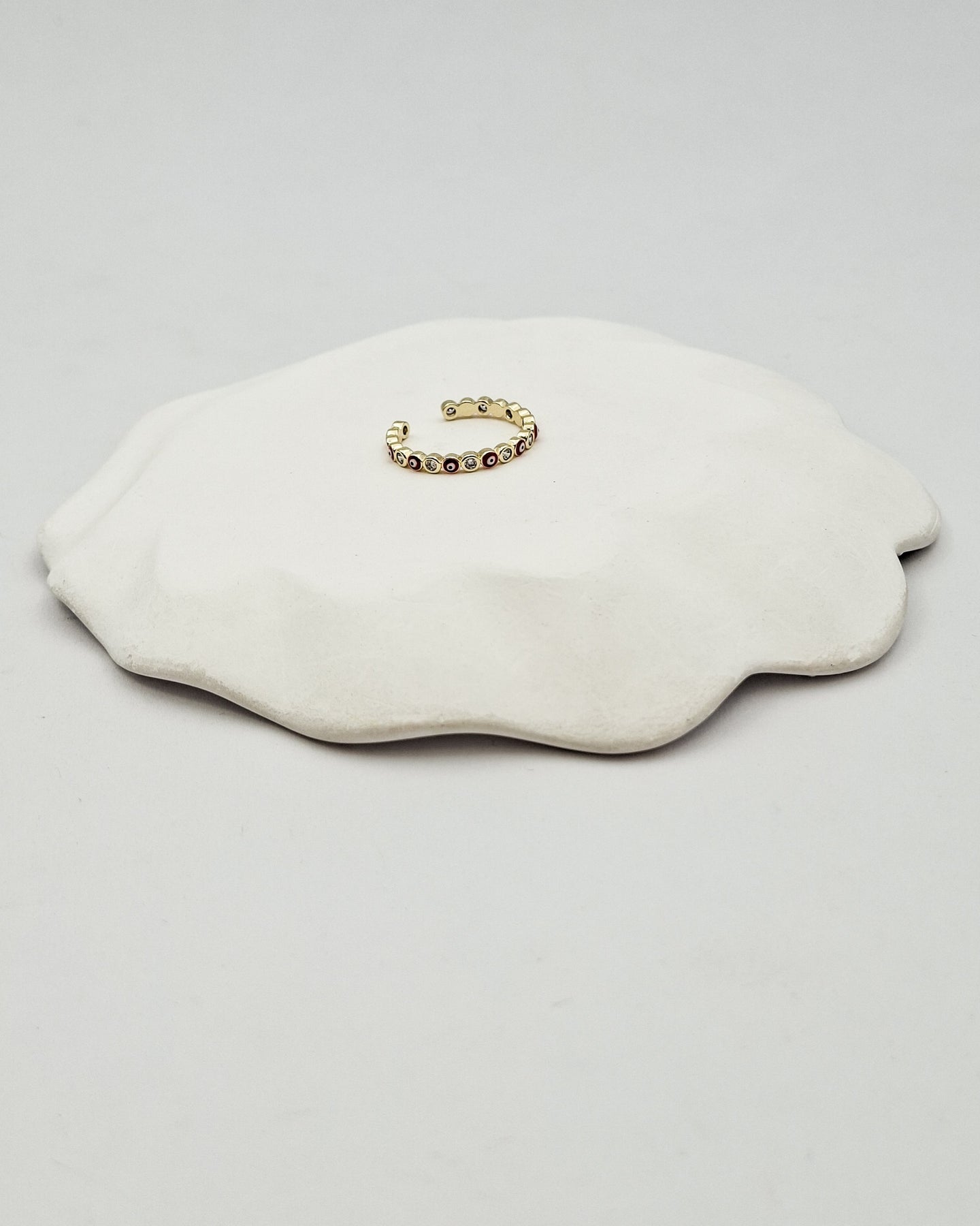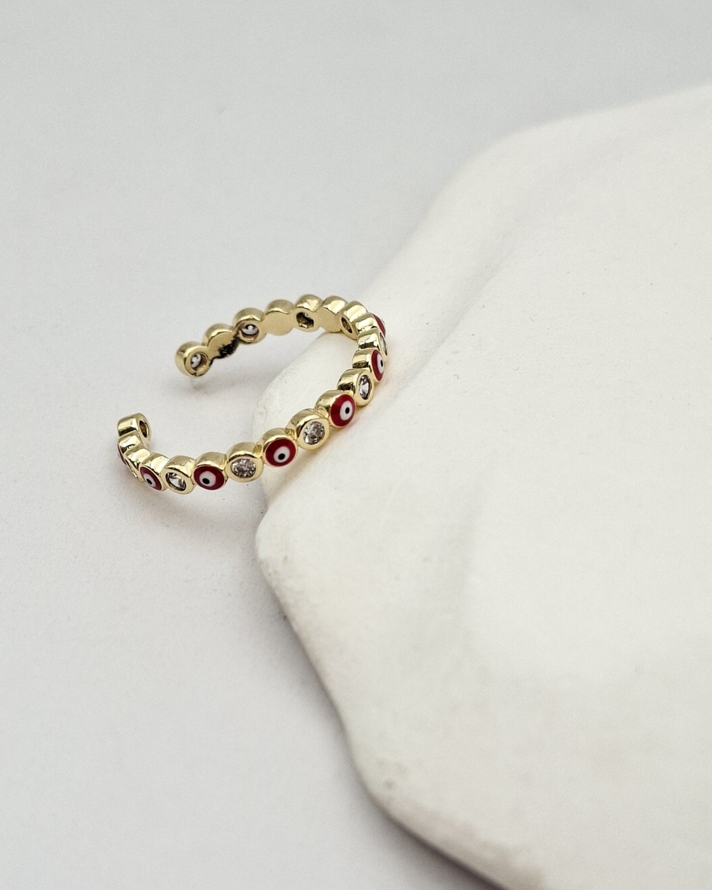 טבעת מקסימה המשלבת זירקונים עגולים קטנים ואלמנטים מאמייל בדוגמת עיניים בגוון אדום ובסיס המתכוונן לכל מידה. הטבעת בציפוי ישראלי איכותי והיפואלרגני של זהב 24 קראט. הפריט מגיע ארוז למתנה ועם אחריות לשנה. ניתן להוסיף ברכה אישית ופתק החלפה.