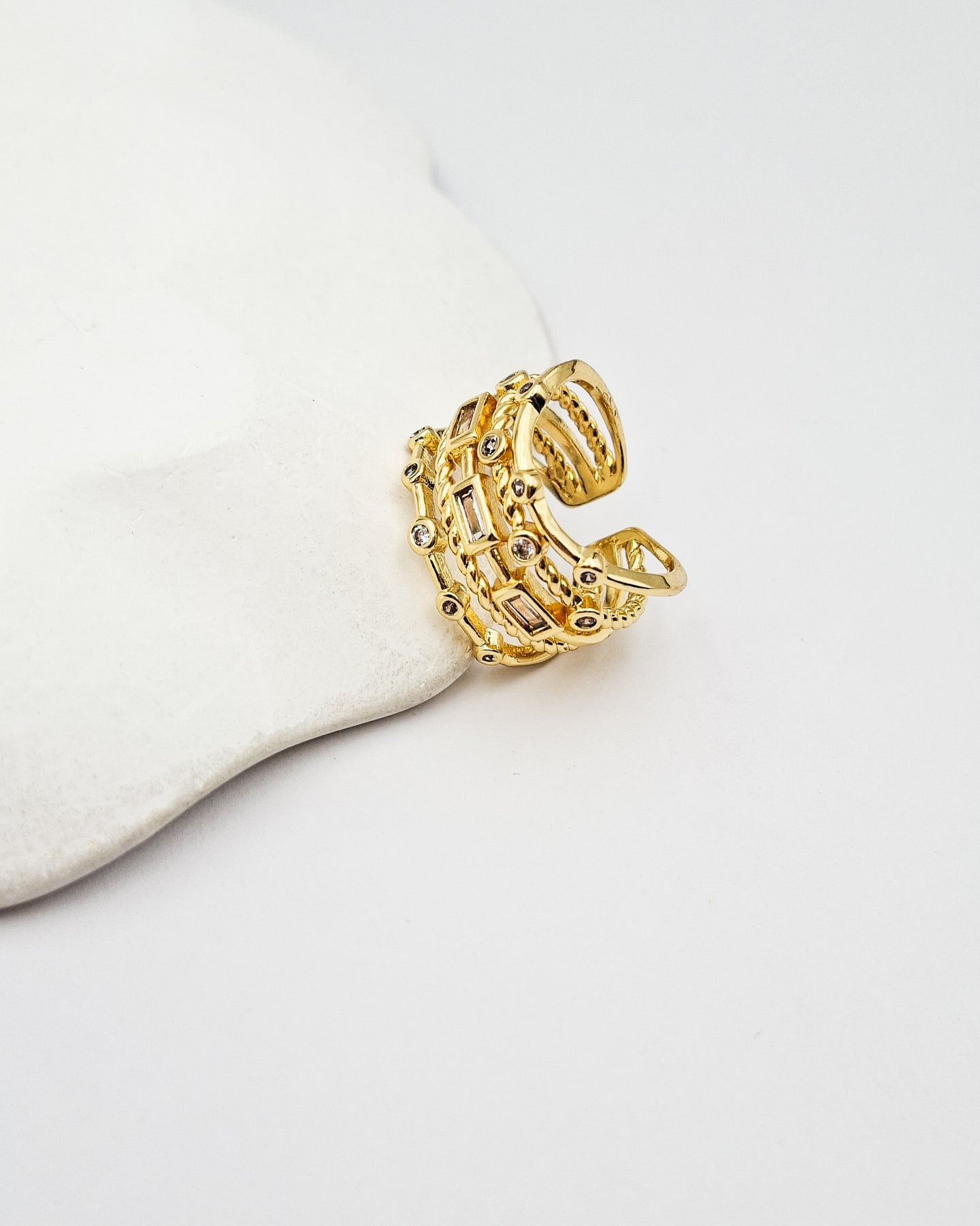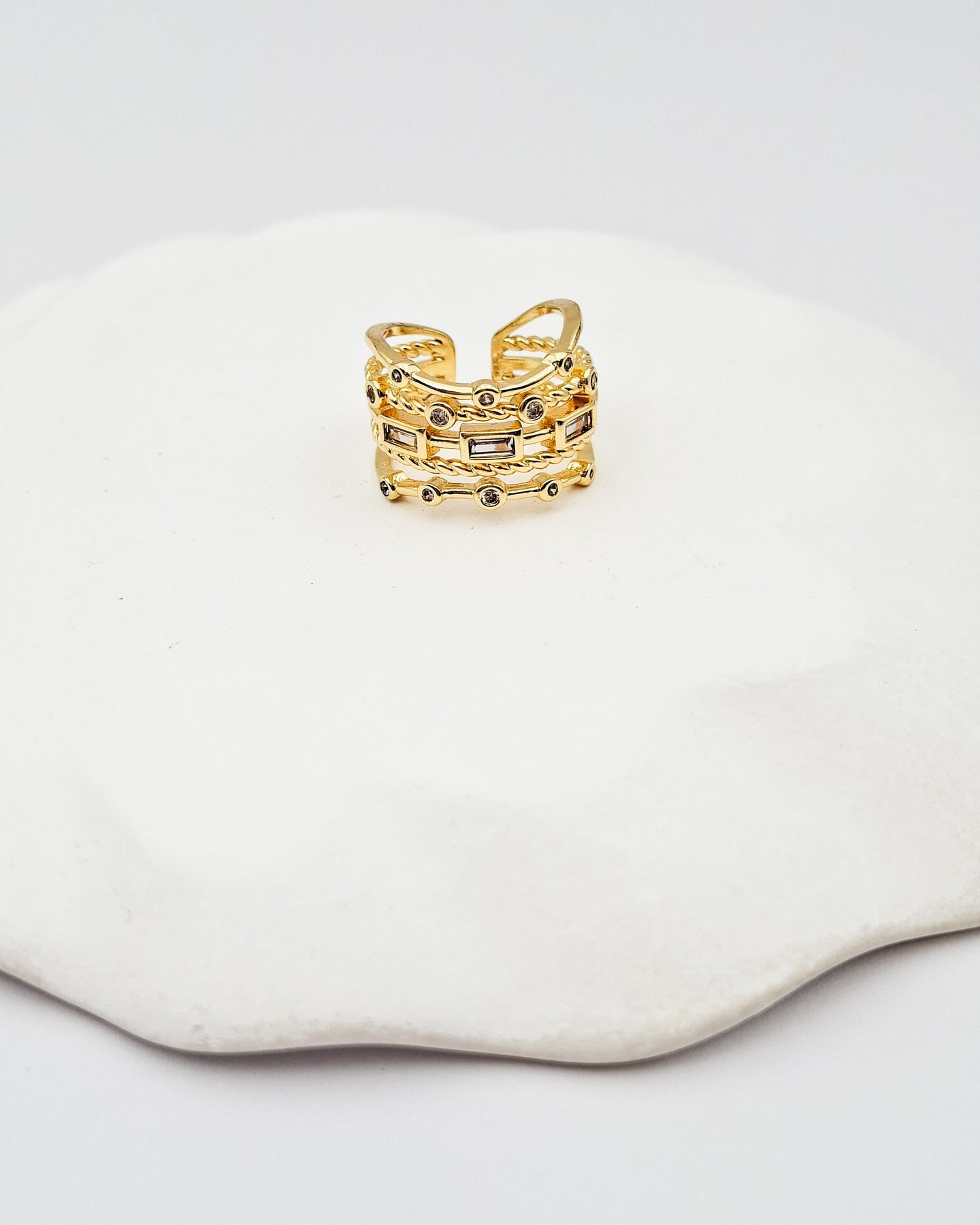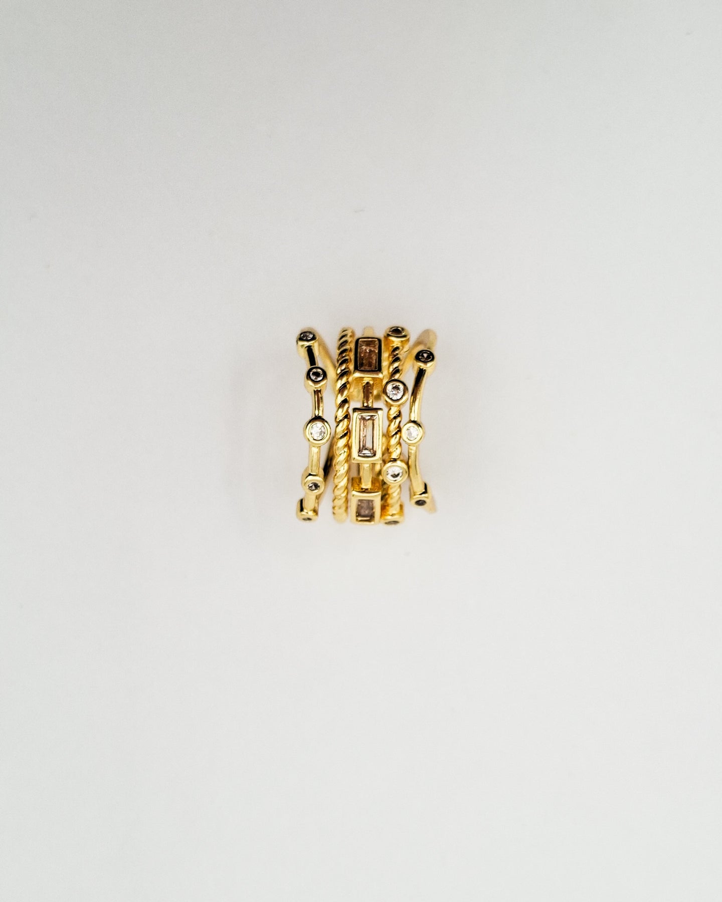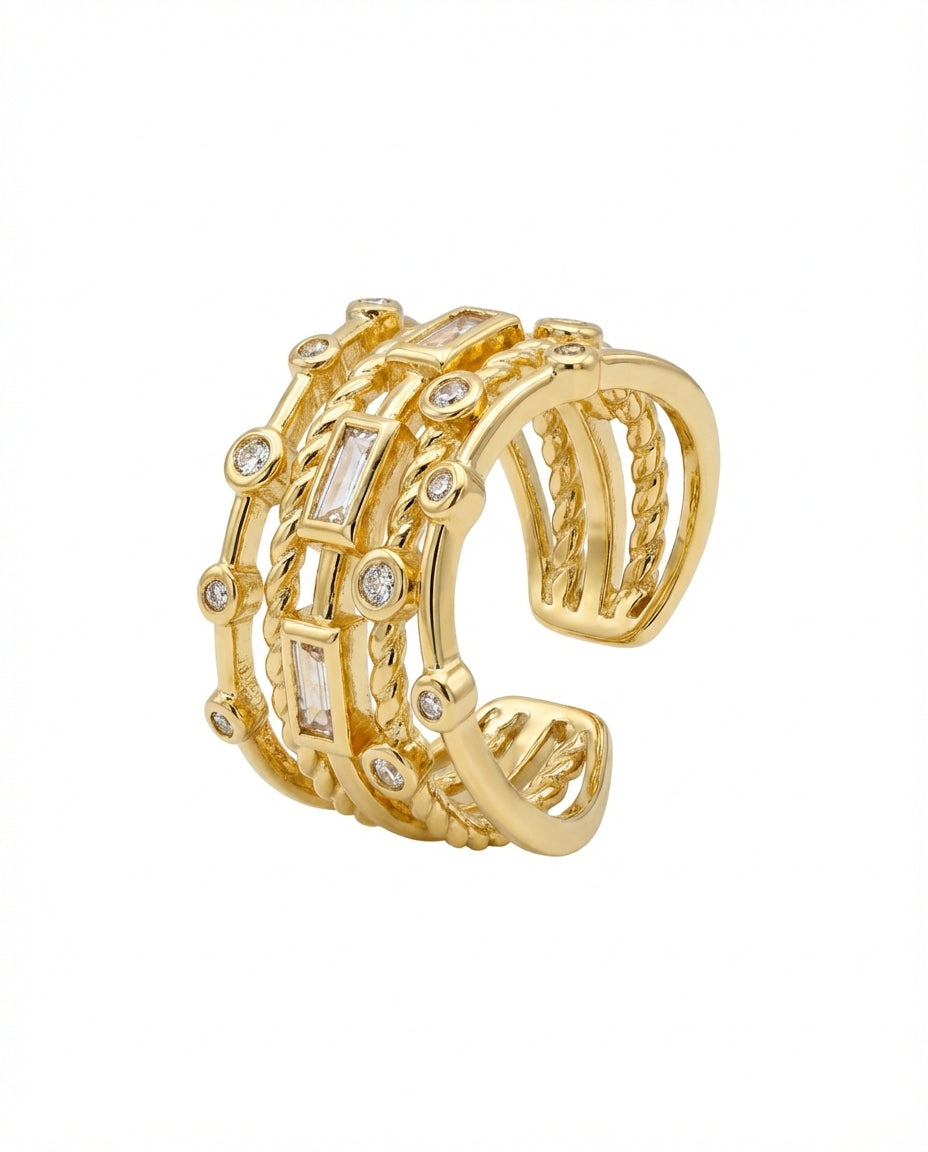 טבעת מיוחדת המורכבת מ-5 טבעות מחוברות בצורות ובטקסטורות מגוונות ובשיבוץ זירקונים המדמה שילוב של 5 טבעות יחד. בסיס הטבעת מתכוונן לכל מידה. הטבעת בציפוי ישראלי איכותי והיפואלרגני של זהב 24 קראט. הפריט מגיע ארוז למתנה ועם אחריות לשנה. ניתן להוסיף ברכה אישית ופתק החלפה.