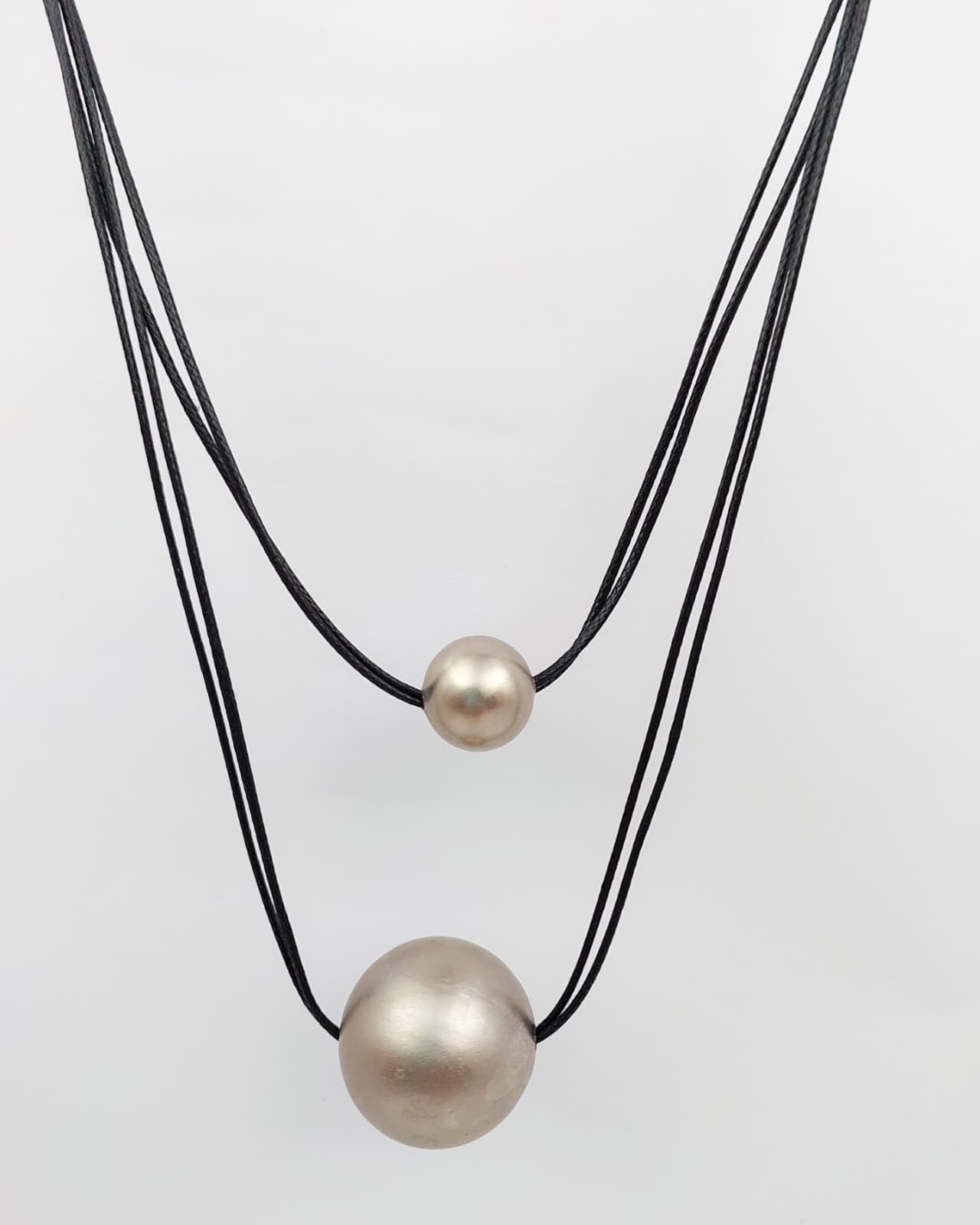 שרשרת כפולה קצרה המורכבת מחוטי כותנה שחורים ואלמנטים כדוריים בגדלים שונים בציפוי ישראלי איכותי של כסף.