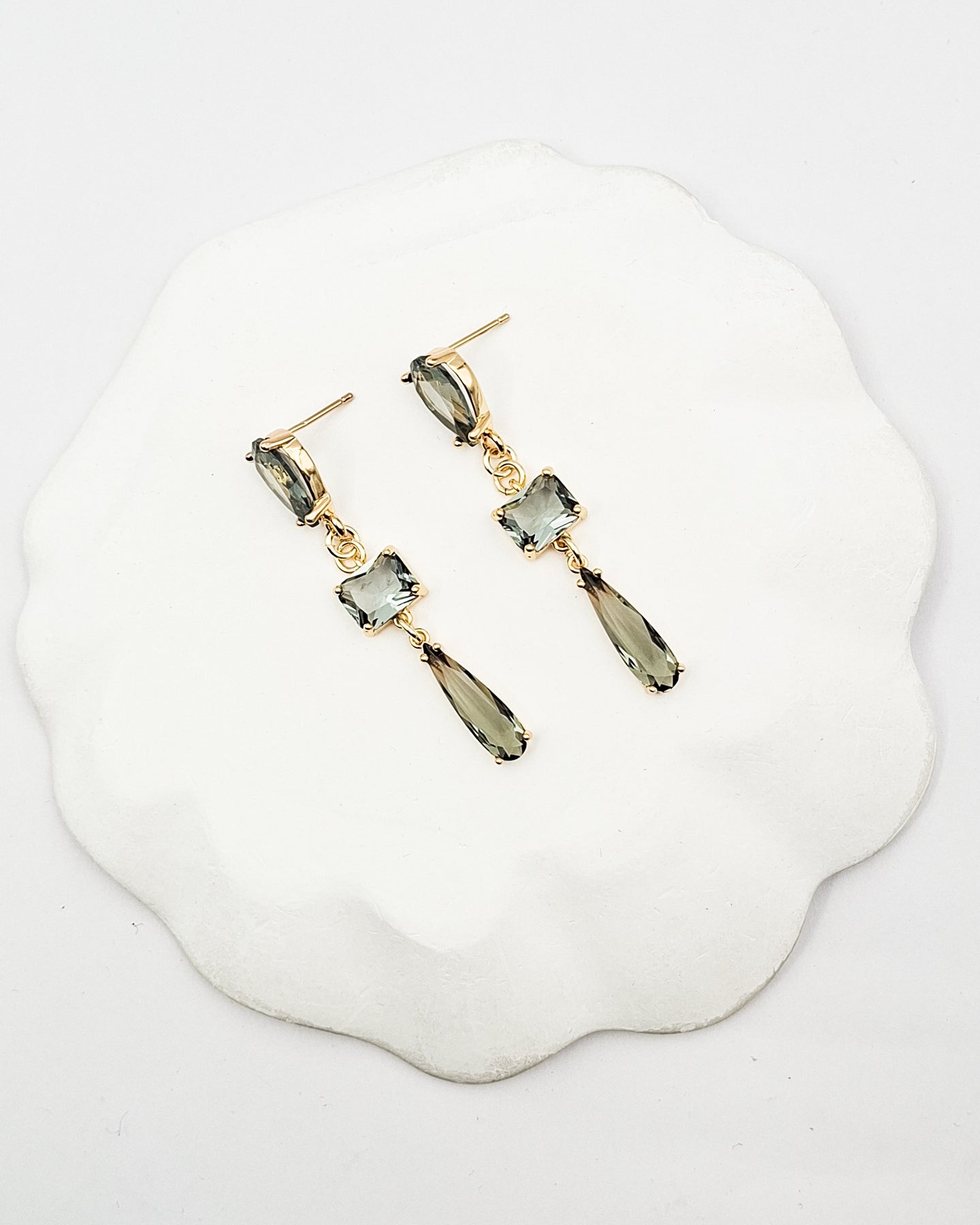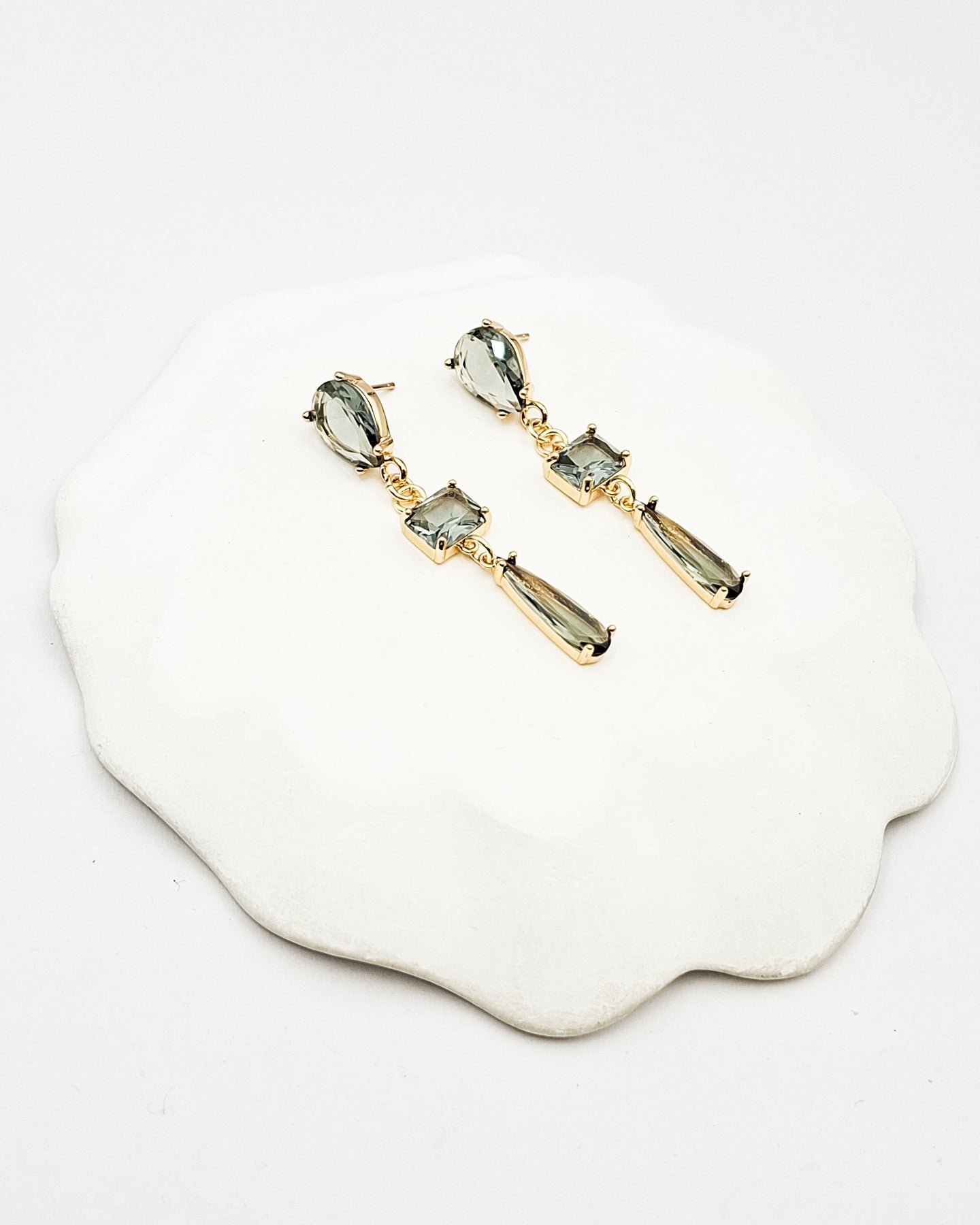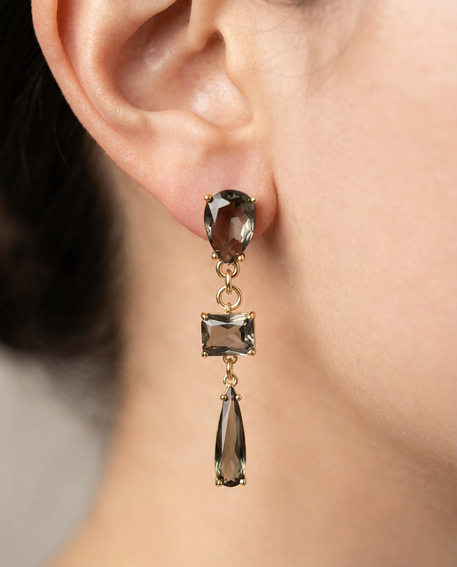 עגילים תלויים בעלי בסיס צמוד עם תליון של קריסטלים בצורות שונות בגוון אפרפר מעושן. העגילים בציפוי ישראלי איכותי והיפואלרגני של זהב 24 קראט. הפריט מגיע ארוז למתנה ועם אחריות לשנה. ניתן להוסיף ברכה אישית ופתק החלפה
