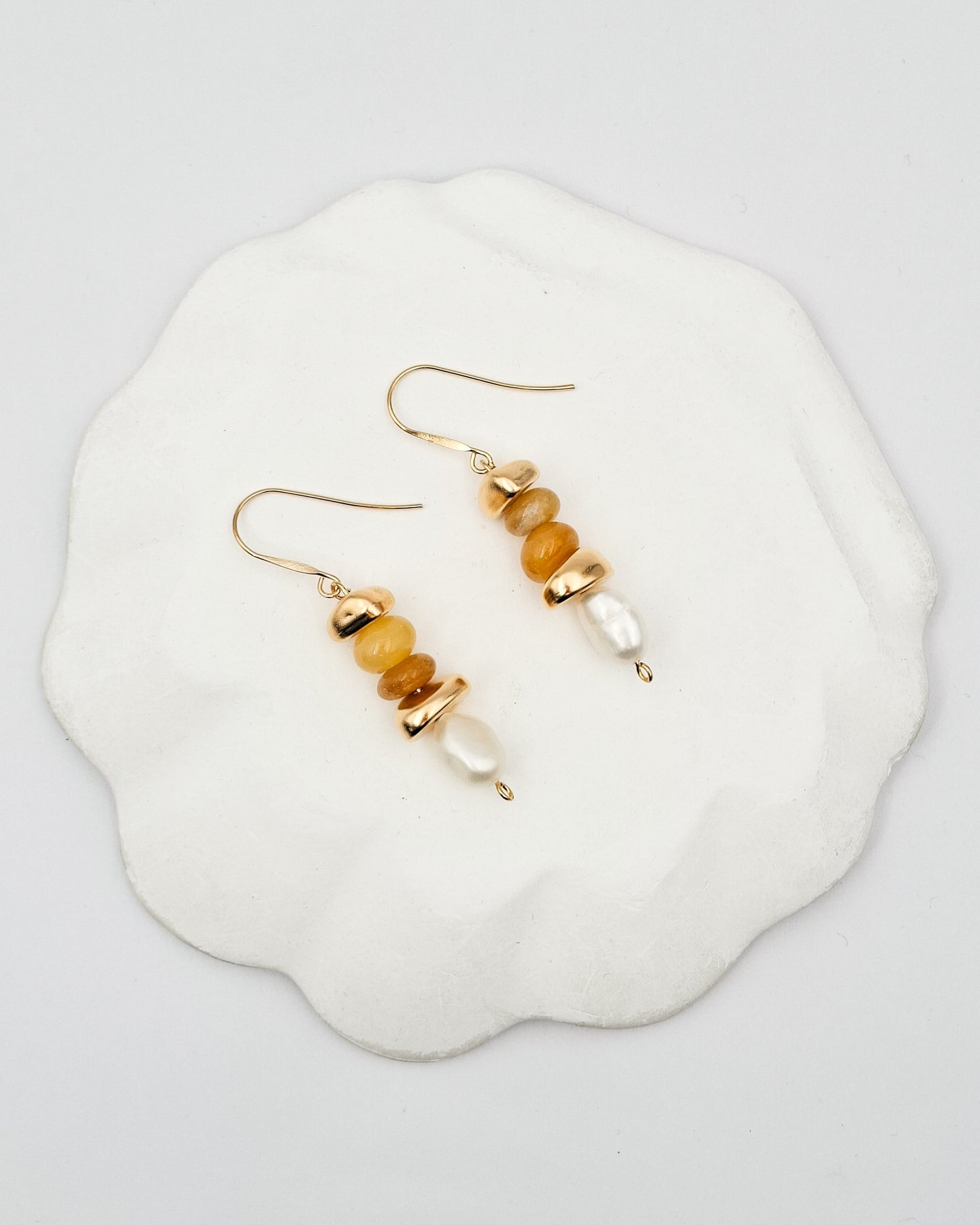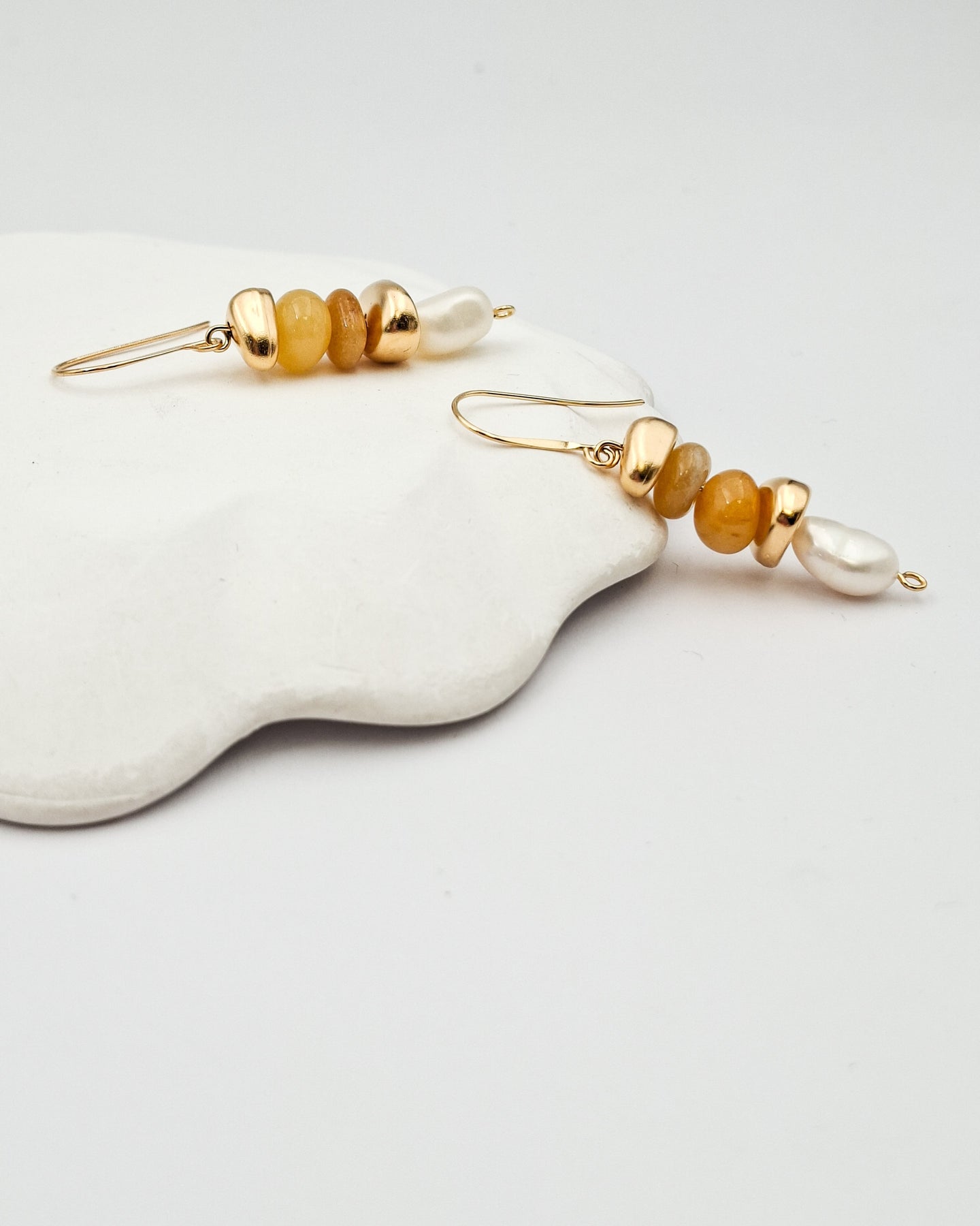 עגילים תלויים המורכבים מאבנים אמיתיות, אלמנטים א-סימטרים בציפוי זהב ופנינה אמיתית בתחתית. העגילים בציפוי ישראלי איכותי של זהב 24 קראט, תולה העגיל בציפוי היפואלרגני. הפריט מגיע ארוז למתנה ועם אחריות לשנה. ניתן להוסיף ברכה אישית ופתק החלפה.