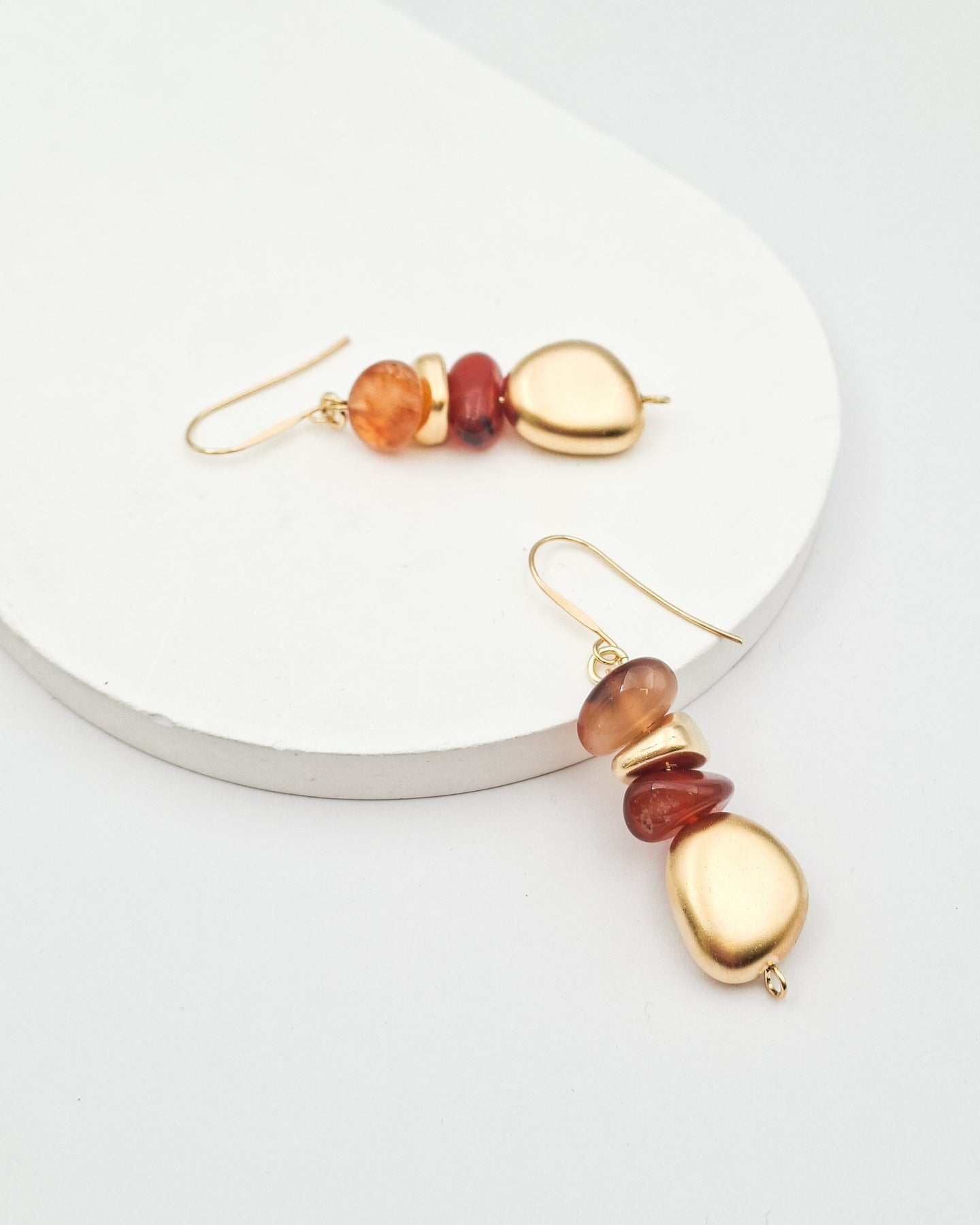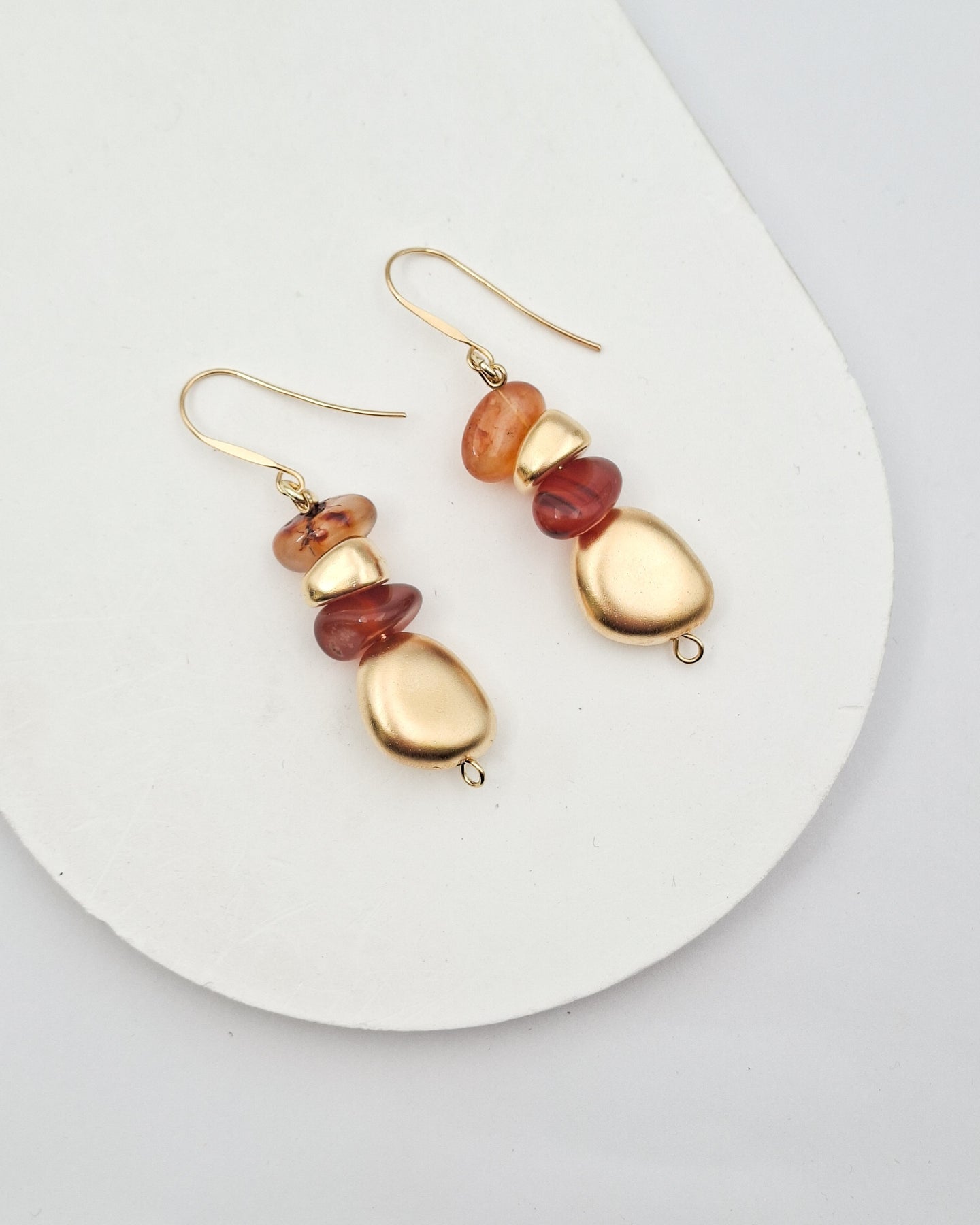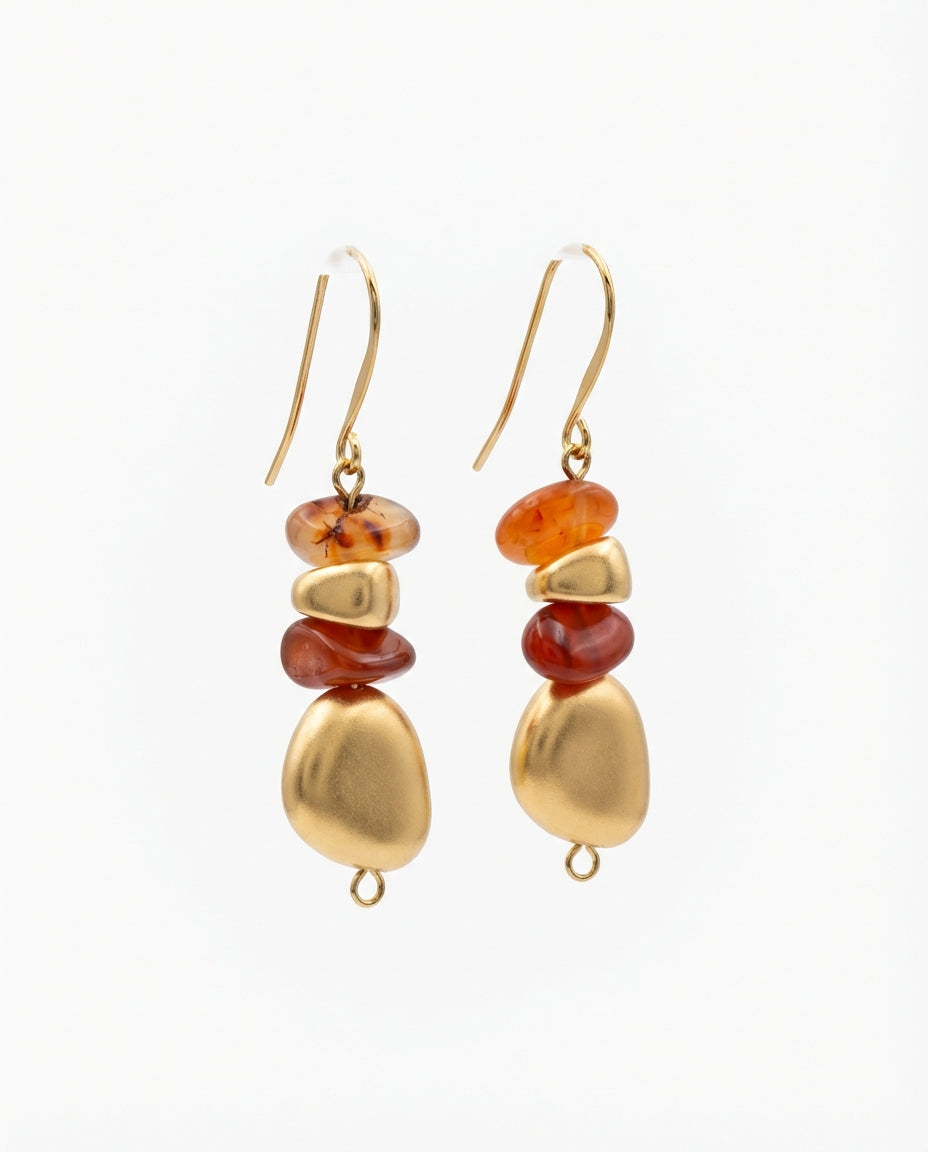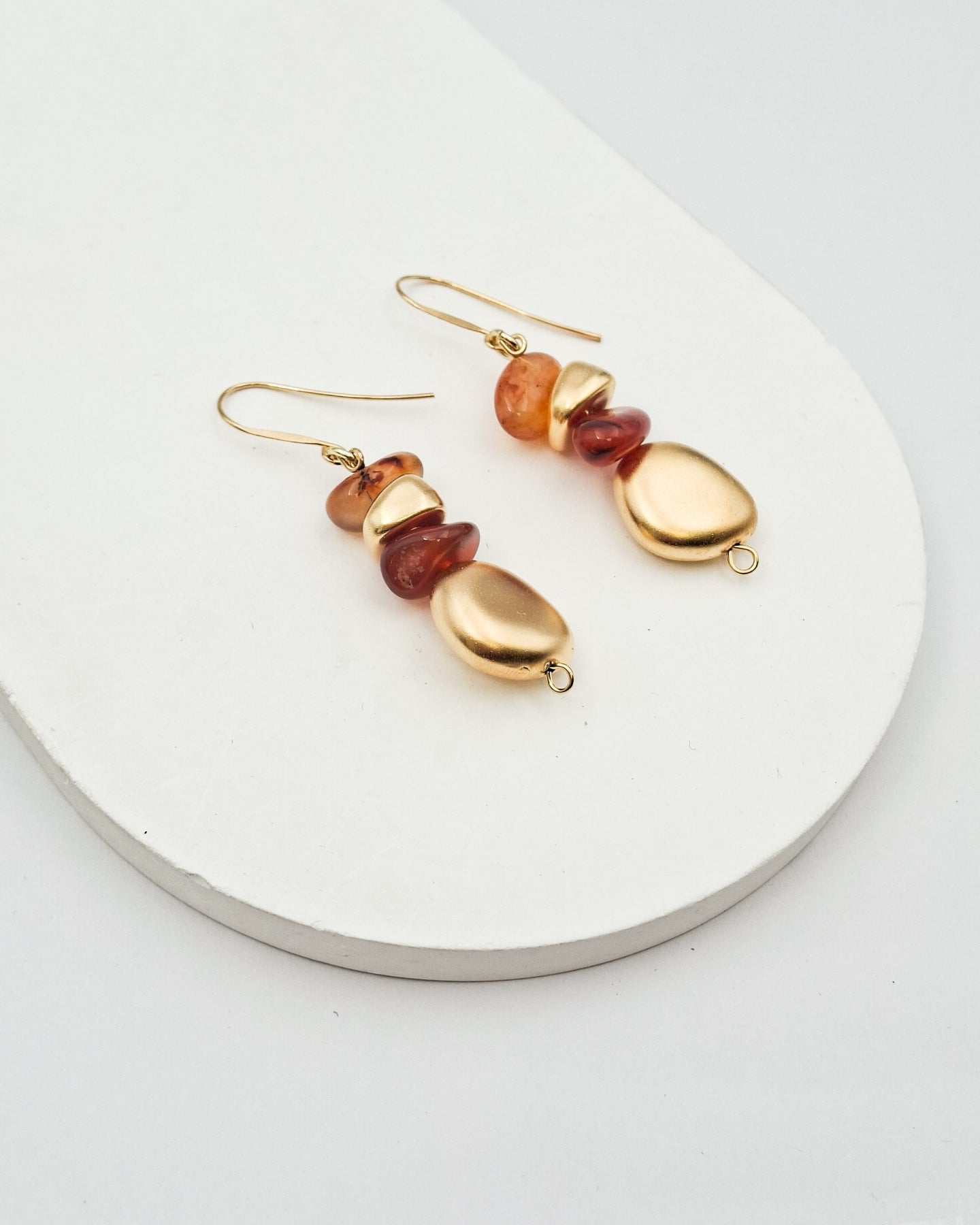 עגילים תלויים המורכבים ממספר אלמנטים א-סימטרים בציפוי זהב בשילוב אבנים אמתיות בגווני אדמה כתמתמים. העגילים בציפוי ישראלי איכותי של זהב 24 קראט. תולה העגיל הינו היפואלרגני. הפריט מגיע ארוז למתנה ועם אחריות לשנה. ניתן להוסיף ברכה אישית ופתק החלפה.