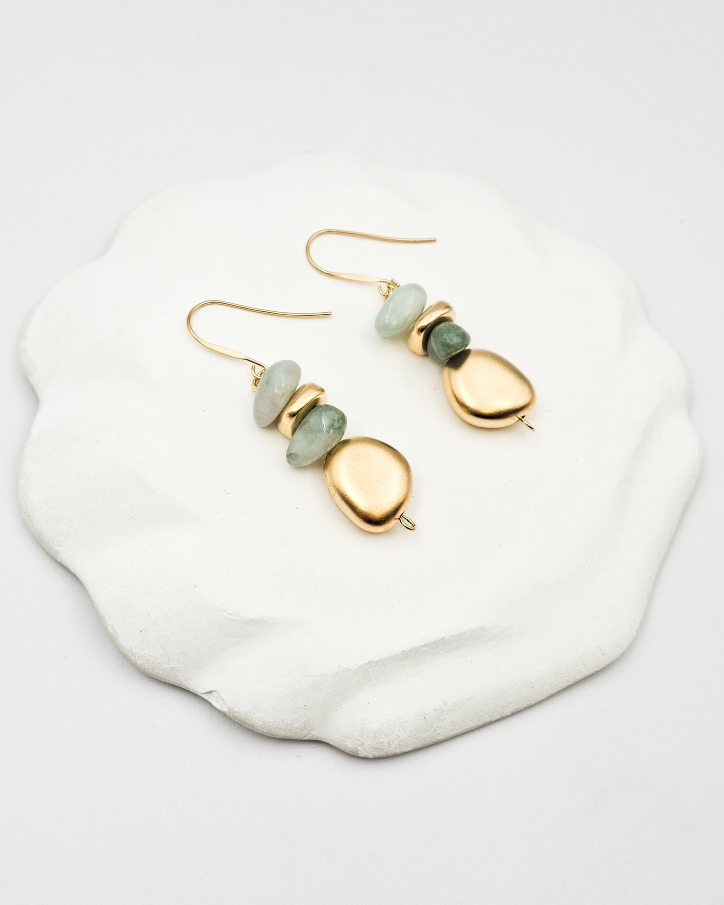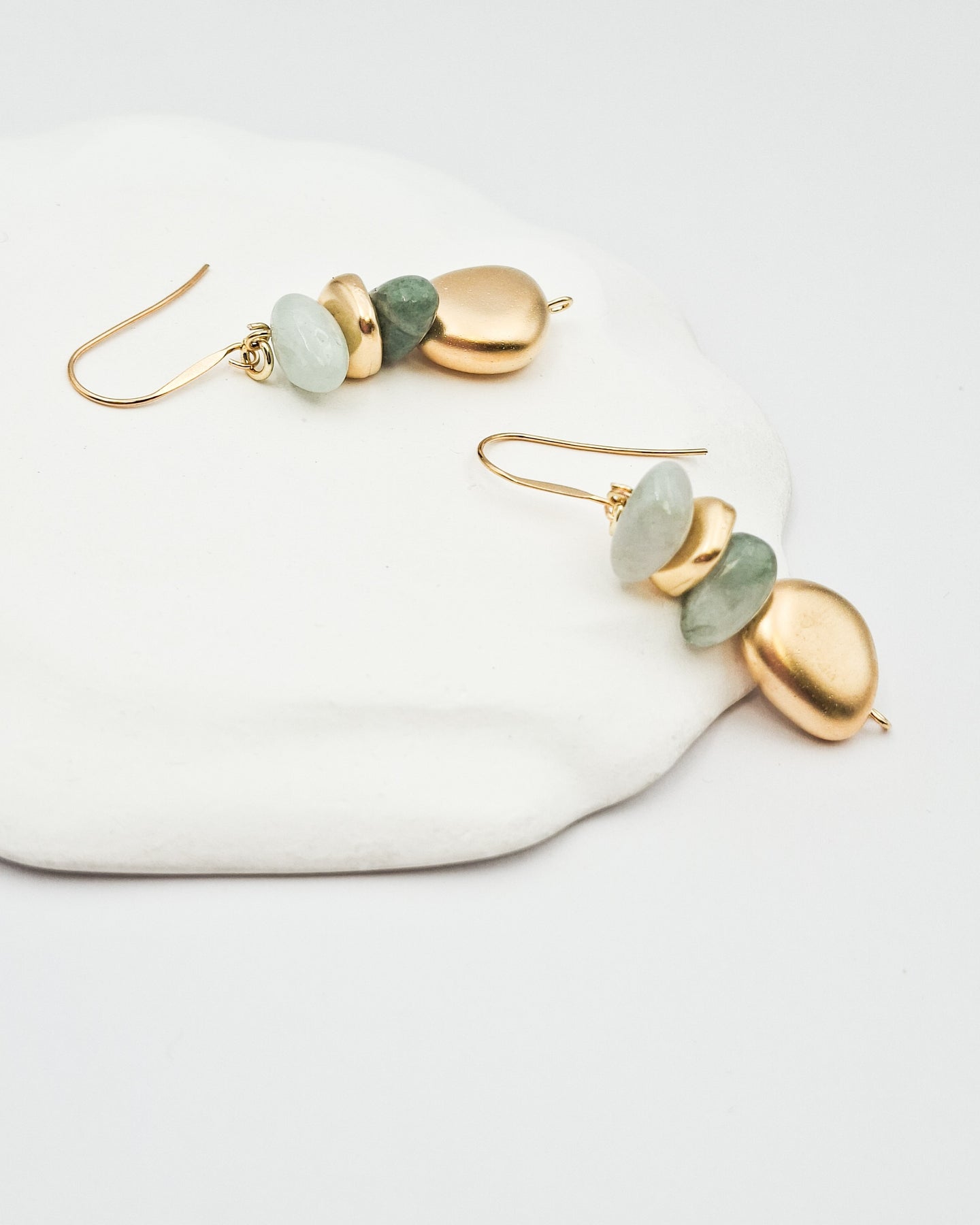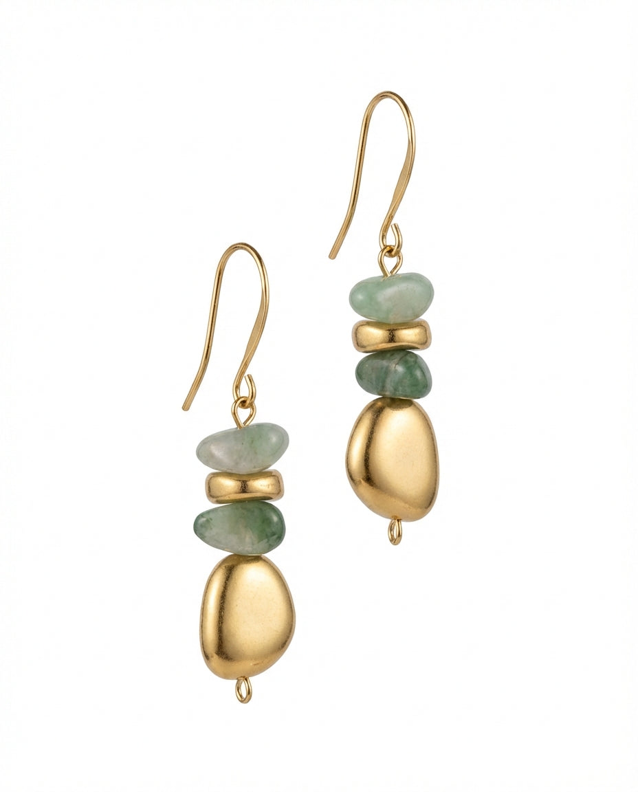 עגילים תלויים המורכבים ממספר אלמנטים א-סימטרים בציפוי זהב בשילוב אבנים אמתיות בגווני ירקרק אבן. העגילים בציפוי ישראלי איכותי של זהב 24 קראט. תולה העגיל הינו היפואלרגני. הפריט מגיע ארוז למתנה ועם אחריות לשנה. ניתן להוסיף ברכה אישית ופתק החלפה.