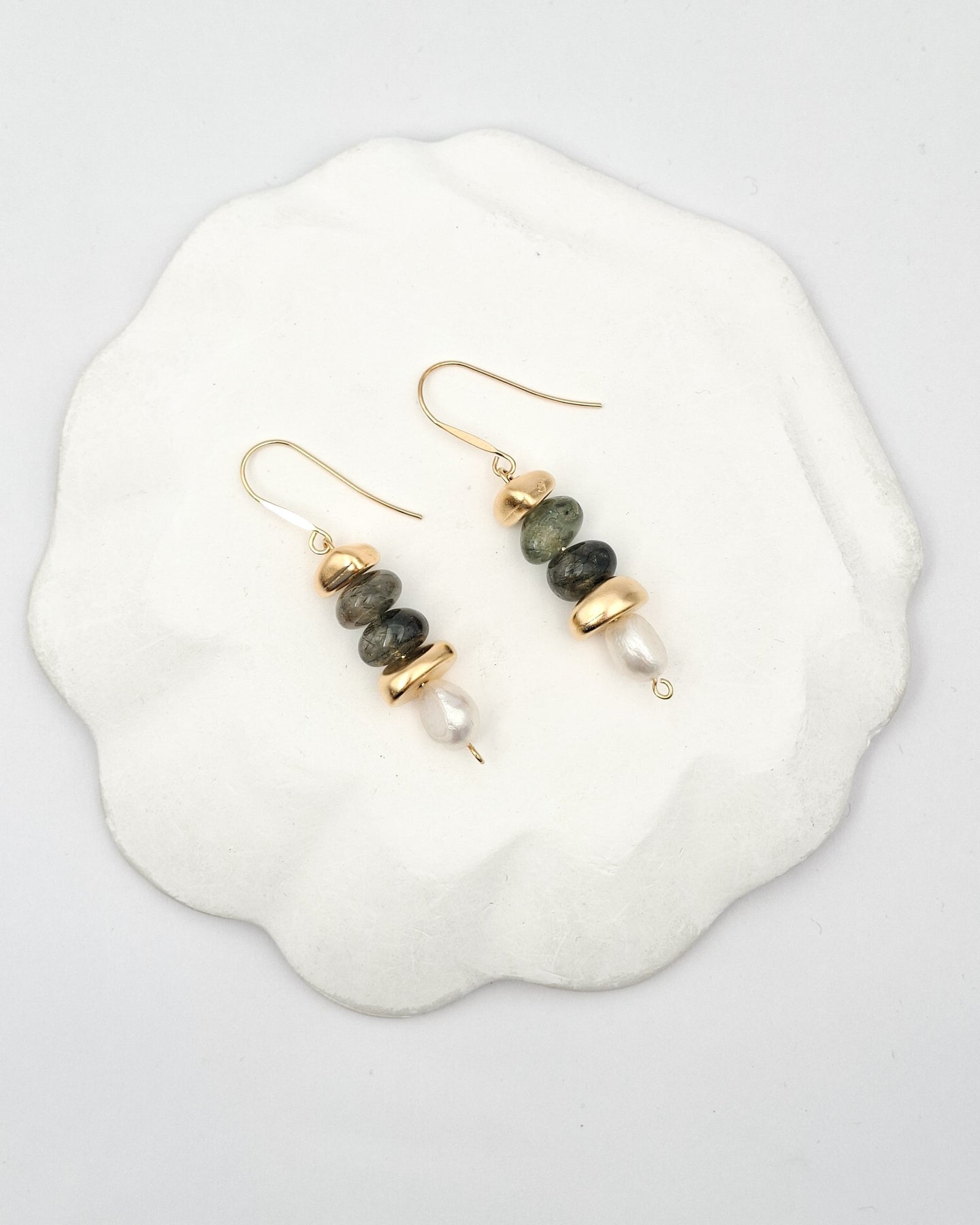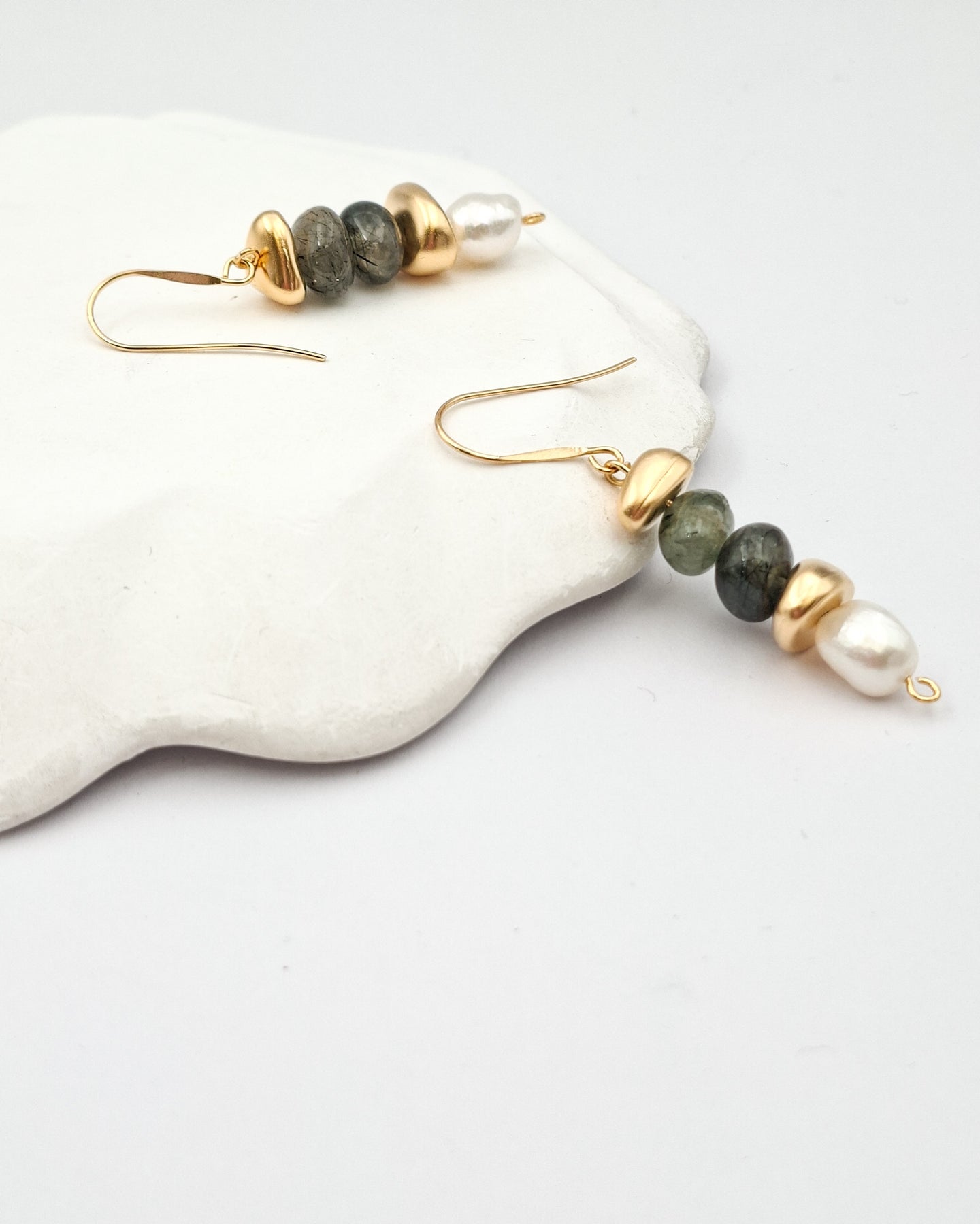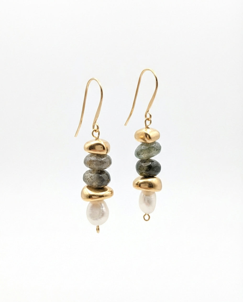 עגילים תלויים המורכבים מאבנים אמיתיות, אלמנטים א-סימטרים בציפוי זהב ופנינה אמיתית בתחתית. העגילים בציפוי ישראלי איכותי של זהב 24 קראט, תולה העגיל בציפוי היפואלרגני. הפריט מגיע ארוז למתנה ועם אחריות לשנה. ניתן להוסיף ברכה אישית ופתק החלפה.