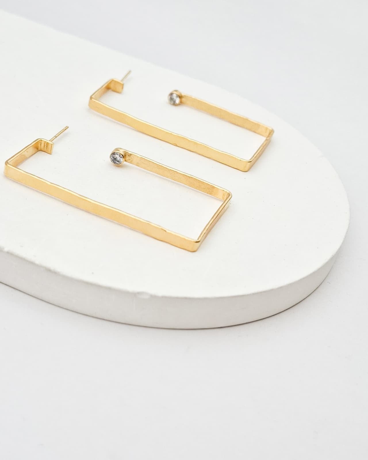 עגילים צמודים בעבודת יד בצורת חישוק מלבני משובץ זירקון. העגילים בציפוי ישראלי איכותי של זהב 24 קראט ובגימור מט. הפריט מגיע ארוז למתנה ועם אחריות לשנה. ניתן להוסיף ברכה אישית ופתק החלפה.
