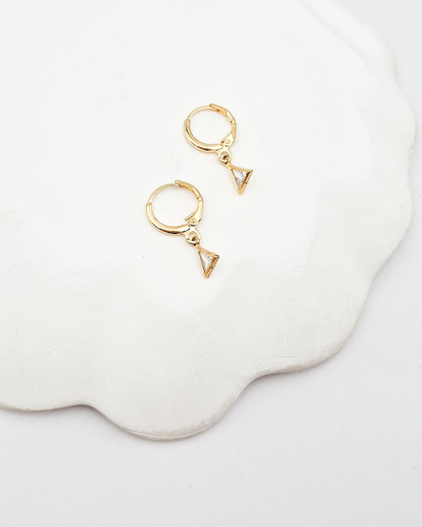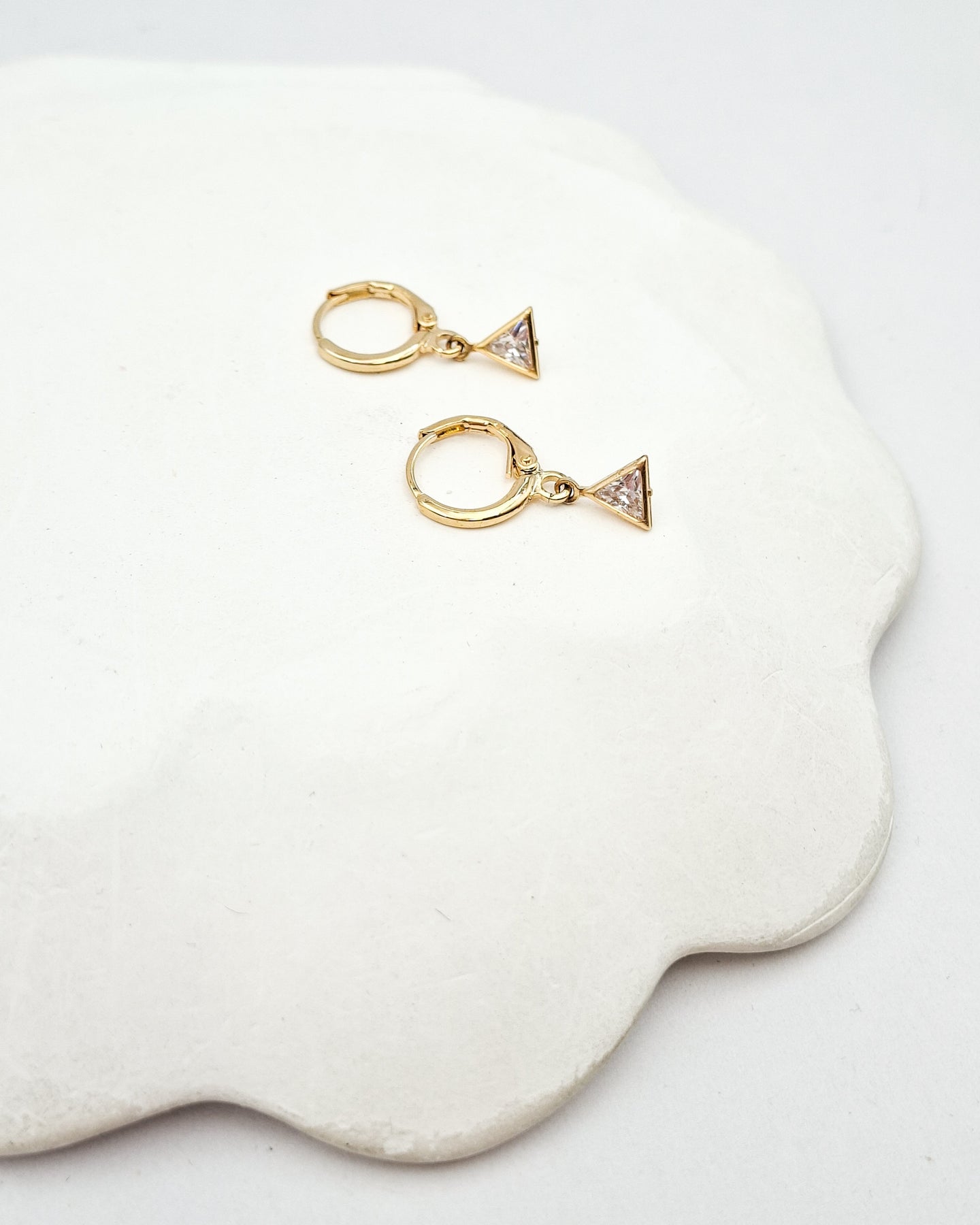 עגילי חישוק קטנים ועדינים במיוחד המשלבים תליון מקסים של זירקון ממוסגר בצורת משולש. העגילים בציפוי ישראלי איכותי והיפואלרגני של זהב 24 קראט. הפריט מגיע ארוז למתנה ועם אחריות לשנה. ניתן להוסיף ברכה אישית ופתק החלפה.