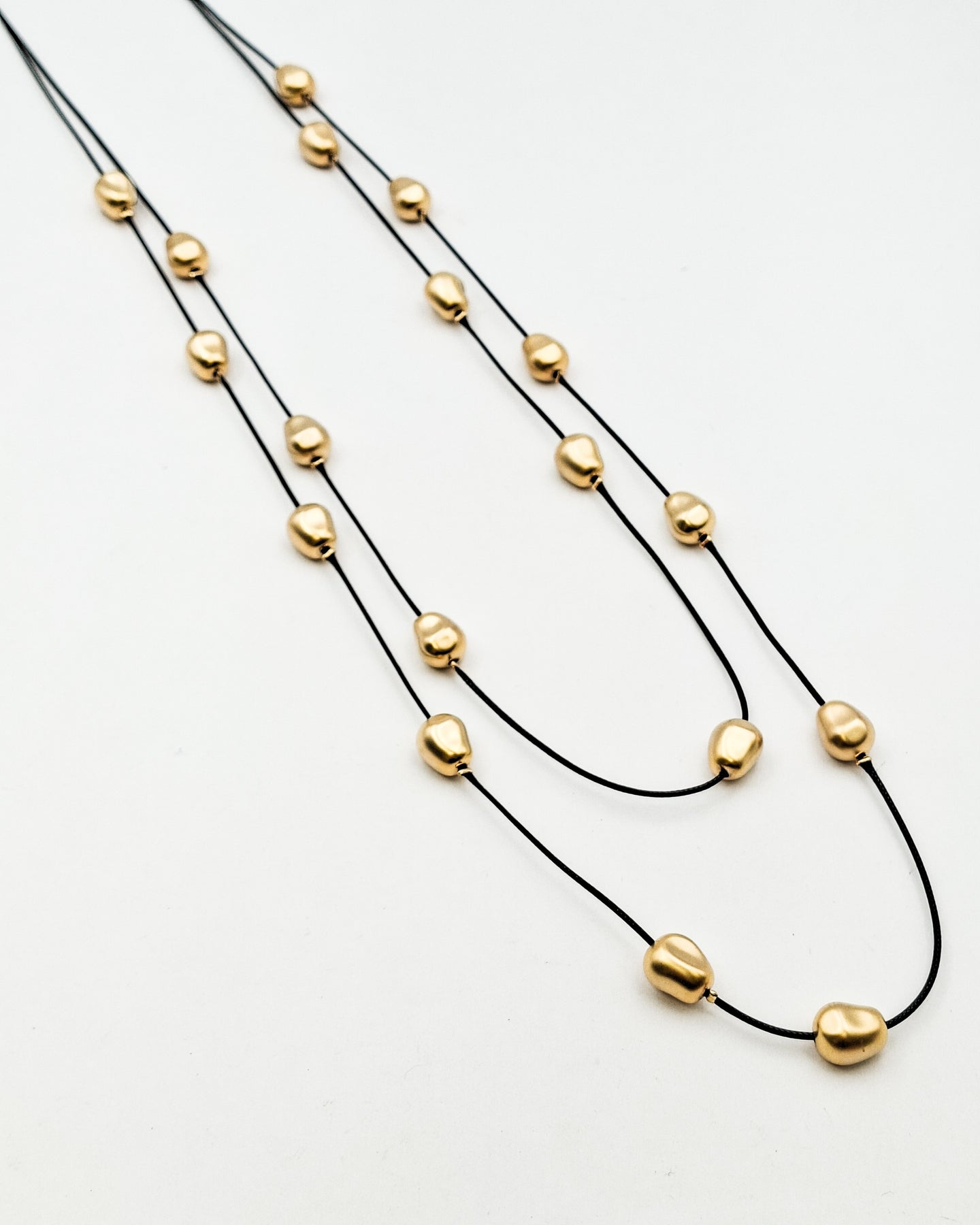 שרשרת ארוכה כפולה ומלאת נוכחות עשויה חוט כותנה בגוון שחור/ ירוק זית שלאורכה פזורים אלמנטים אמורפיים בציפוי איכותי ישראלי של זהב 24 קראט או כסף.