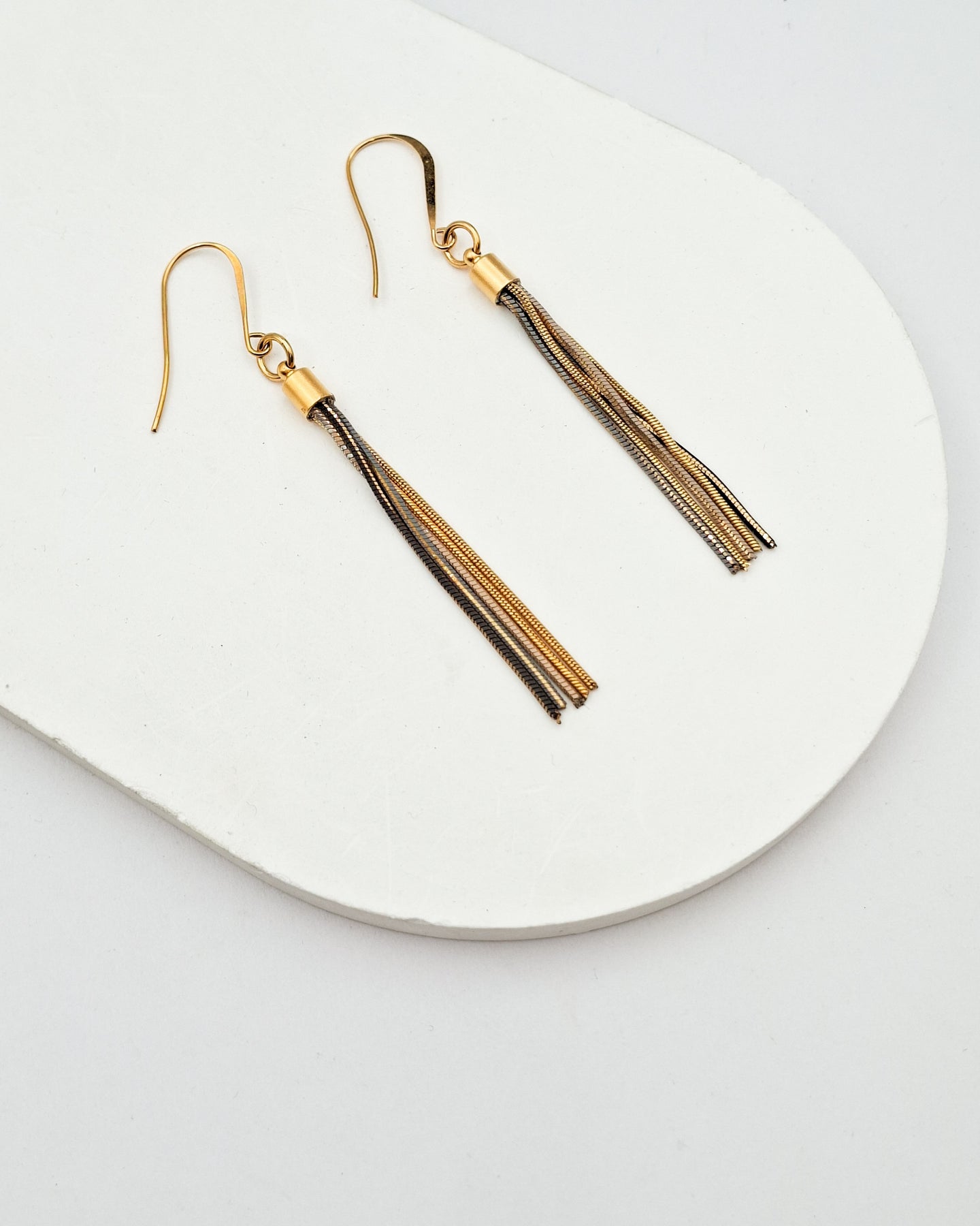 עגילים תלויים עשויים ממקבץ שרשראות במגוון ציפויים בעבודת יד. תולה העגיל הינו היפו אלרגני. הפריט מגיע ארוז למתנה ועם אחריות לשנה. ניתן להוסיף ברכה אישית ופתק החלפה.