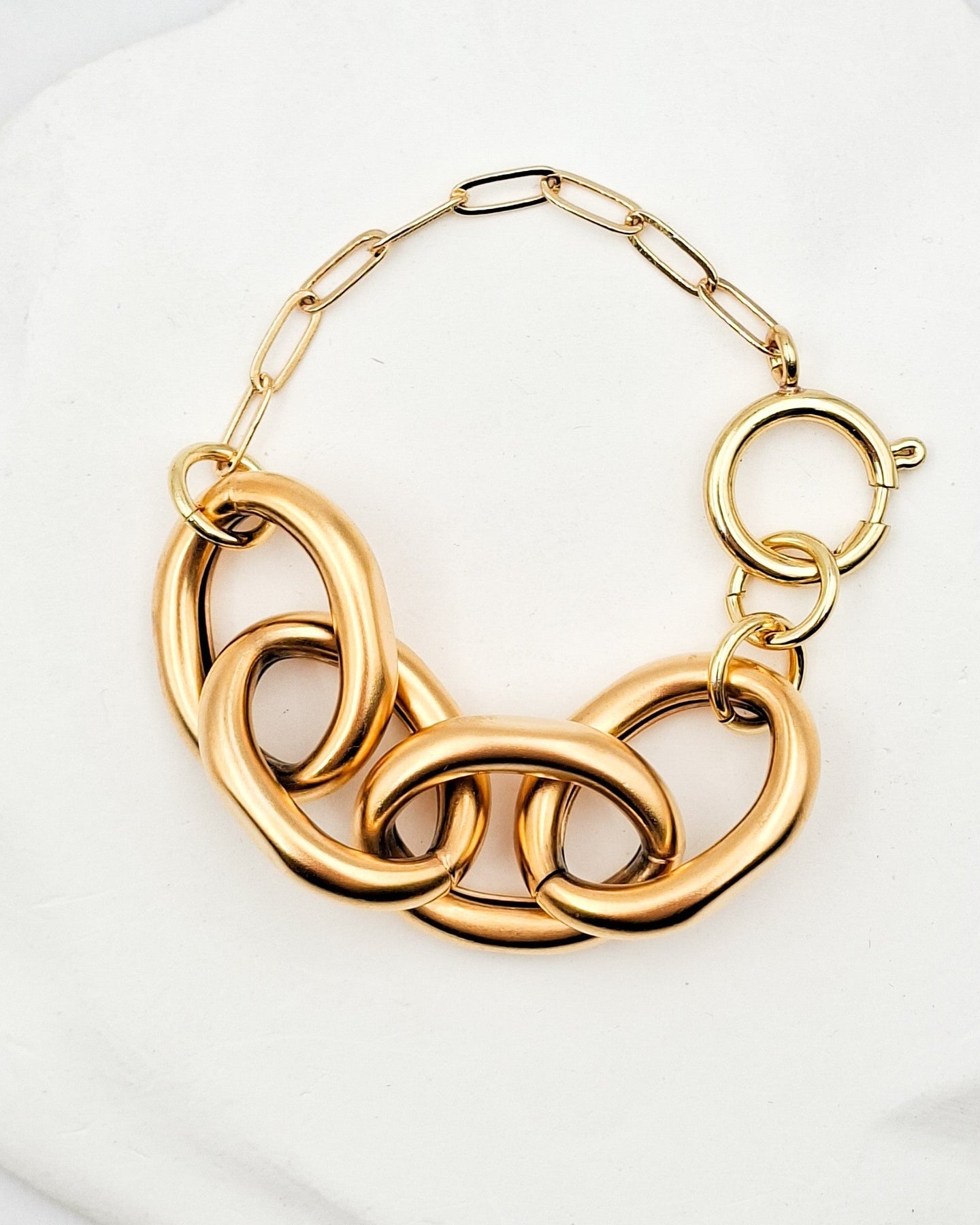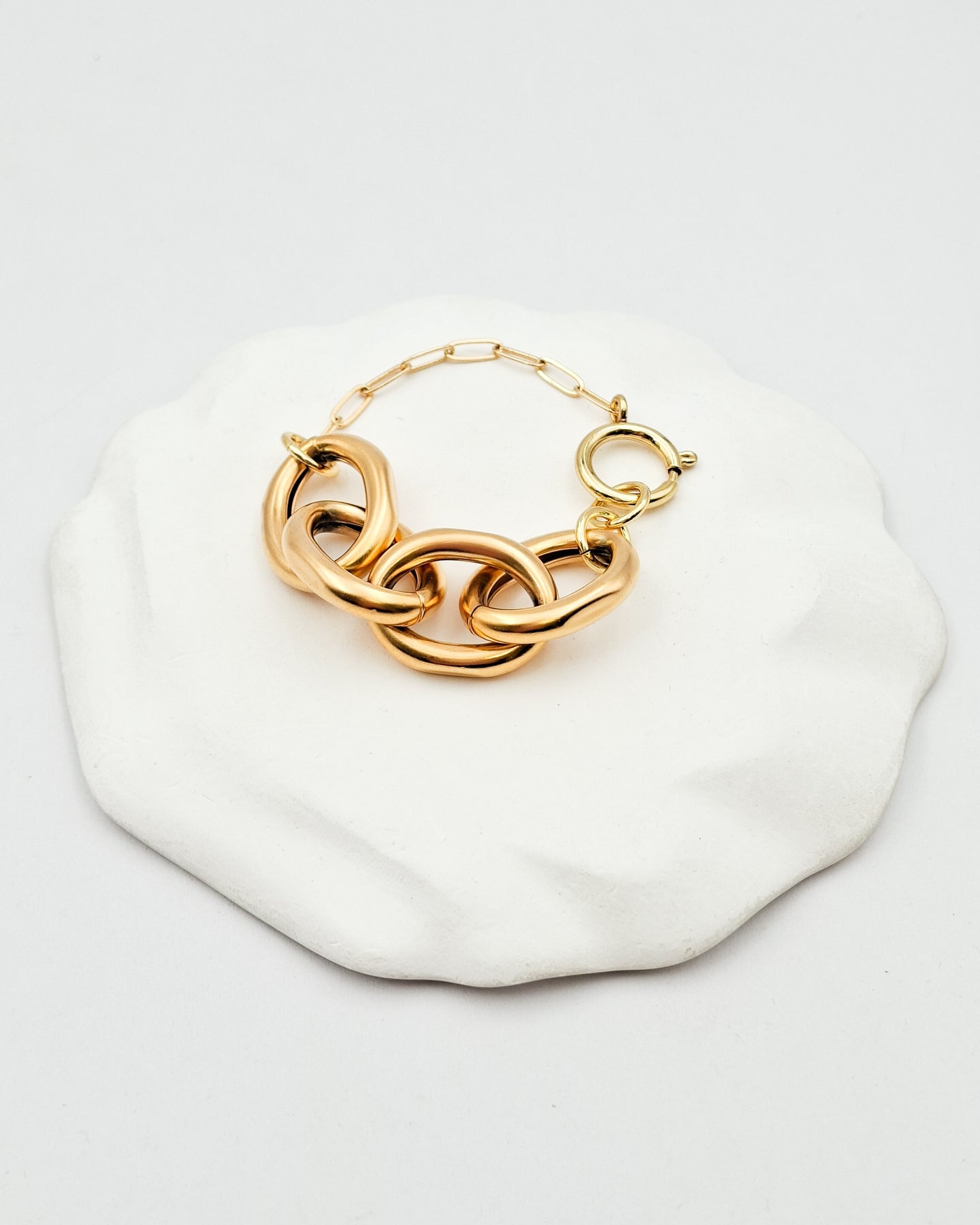 צמיד עשוי חוליות משני סוגים מדהים בעל משקל קל ונוכחות מרשימה ביותר. הצמיד בציפוי ישראלי איכותי של זהב 24 קראט. הפריט מגיע ארוז למתנה ועם אחריות לשנה. ניתן להוסיף ברכה אישית ופתק החלפה.