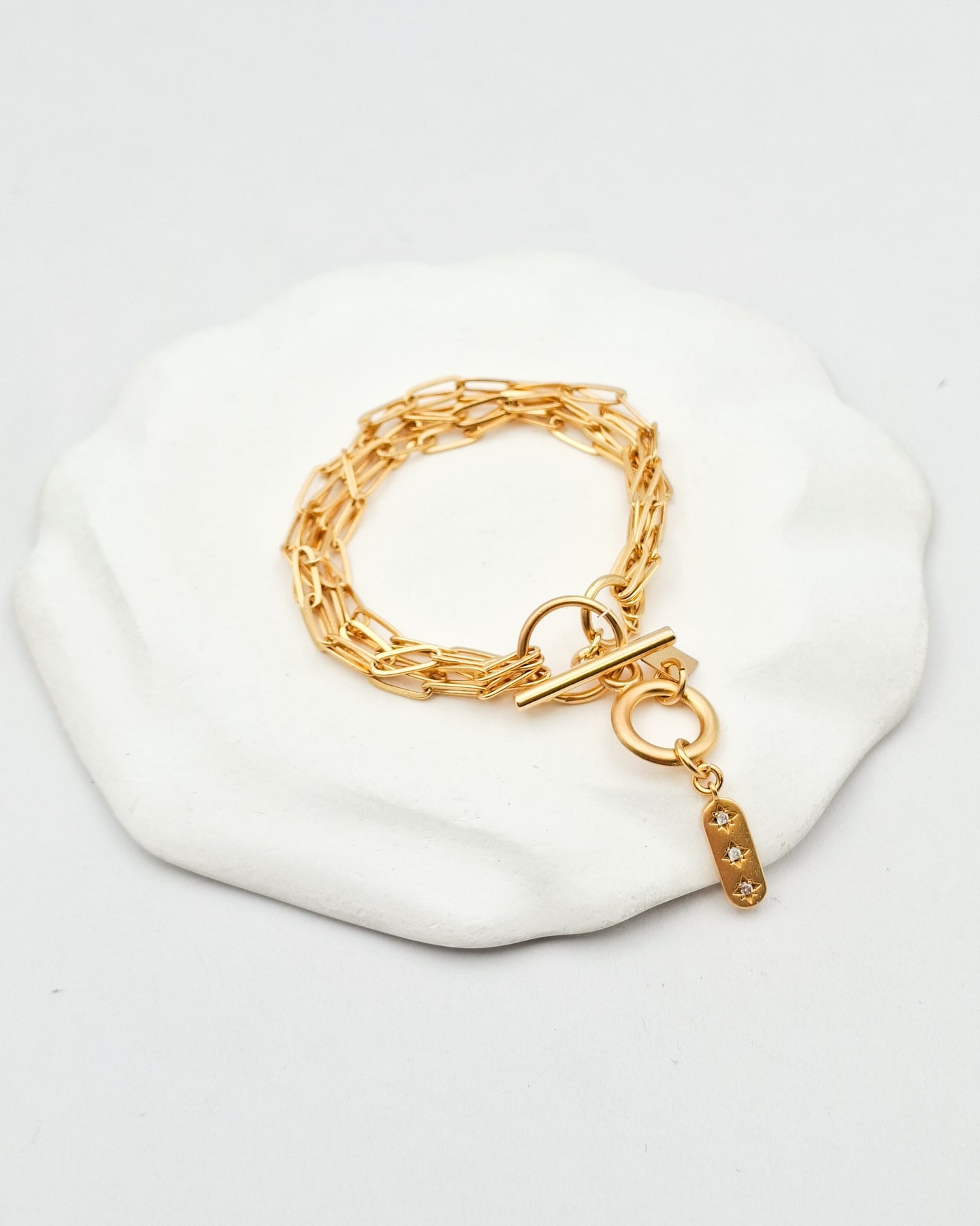 צמיד המורכב מ-5 שרשראות חוליות מלבניות ונסגר בסוגר T נוח וקל לענידה בתוספת תליון אובלי משובץ 3 זירקונים שקופים ותליון מלבני קטן. צמיד עדין אך בעל נוכחות רבה ומרשימה. הצמיד בציפוי ישראלי איכותי של זהב 24 קראט או כסף ובגימור מט, לבחירתך. הפריט מגיע ארוז למתנה ועם אחריות לשנה. ניתן להוסיף ברכה אישית ופתק החלפה.