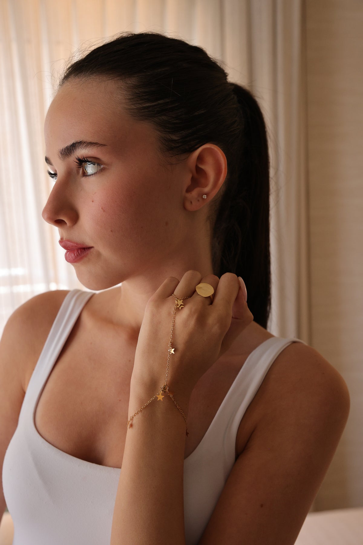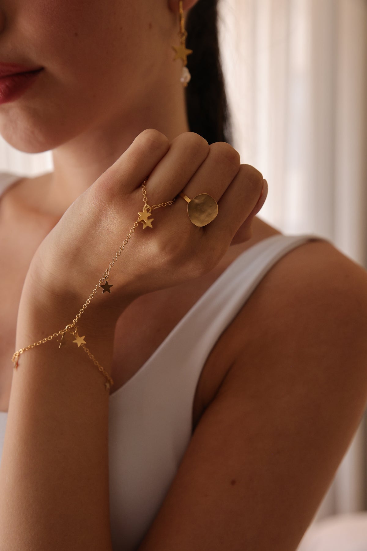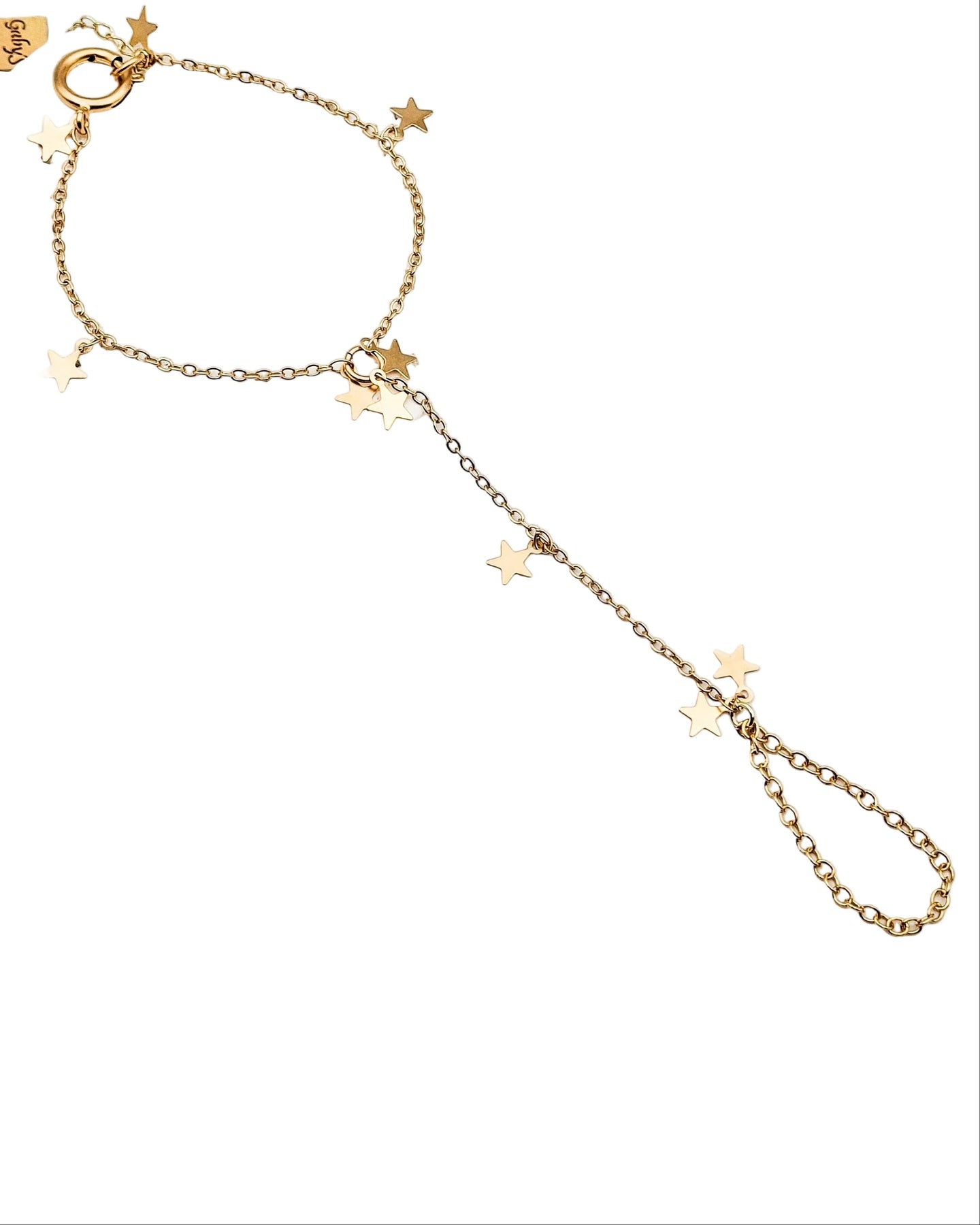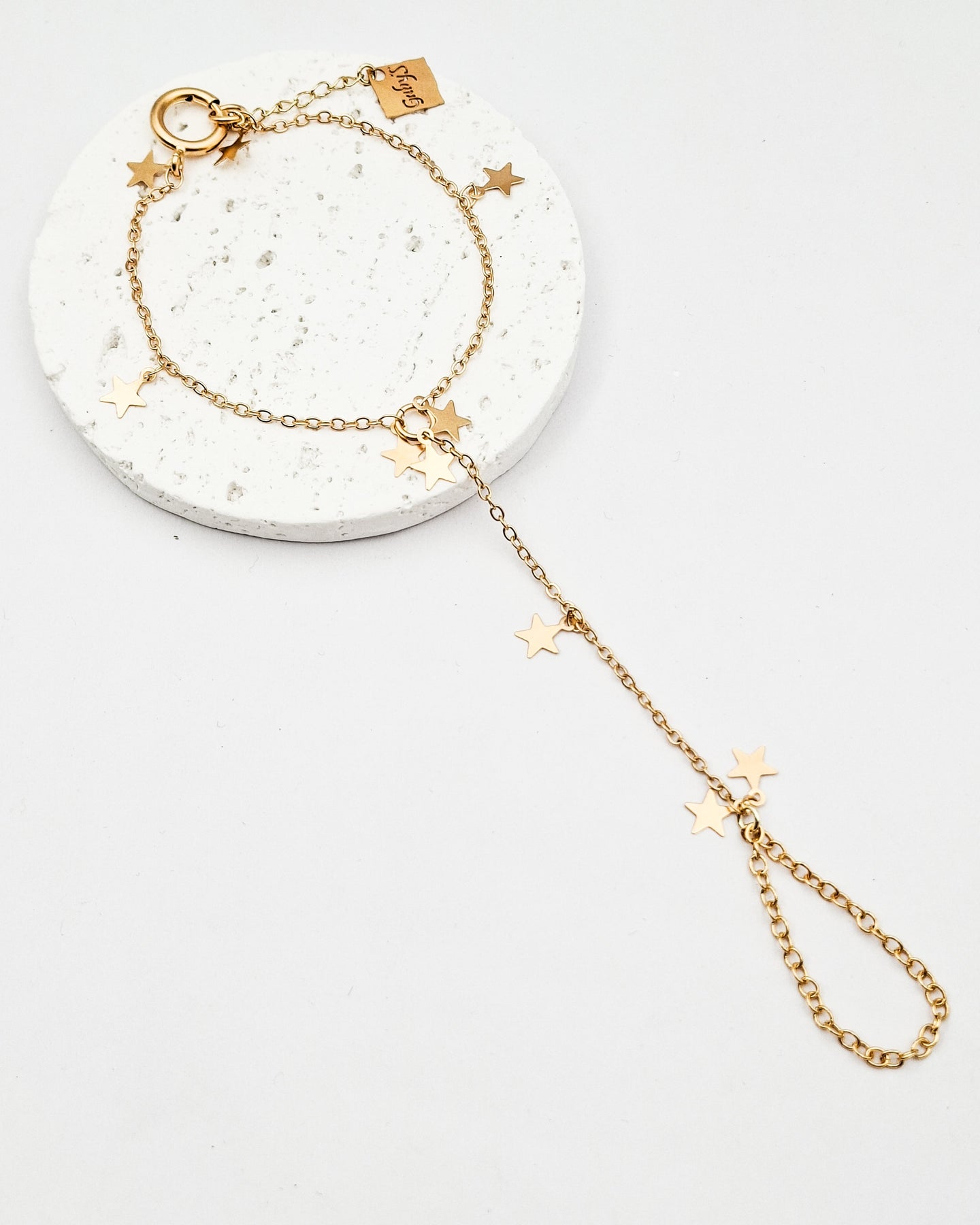 צמיד אצבע מקסים ועדין המיוצר בעבודת יד ומורכב משרשרת לולאות עדינות עם תליוני כוכבים מרווחים ומחובר לאצבע. הצמיד בציפוי ישראלי איכותי של זהב 24 קראט. הפריט מגיע ארוז למתנה ועם אחריות לשנה. ניתן להוסיף ברכה אישית ופתק החלפה.