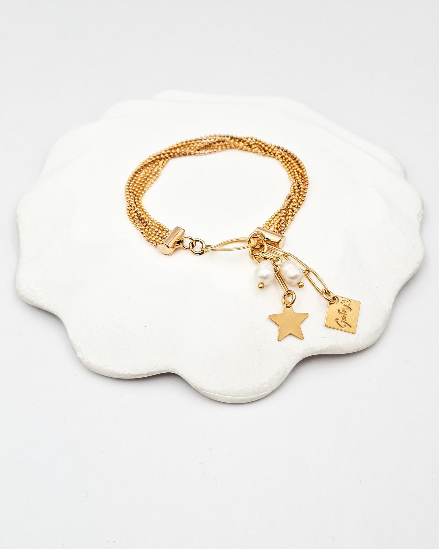 צמיד העשוי מ-7 שורות שרשראות כדוריות, בתוספת תליון בצורת כוכב ושני תליוני פנינים אמיתיות. הצמיד בציפוי ישראלי איכותי של זהב 24 קראט. הפריט מגיע ארוז למתנה ועם אחריות לשנה. ניתן להוסיף ברכה אישית ופתק החלפה.