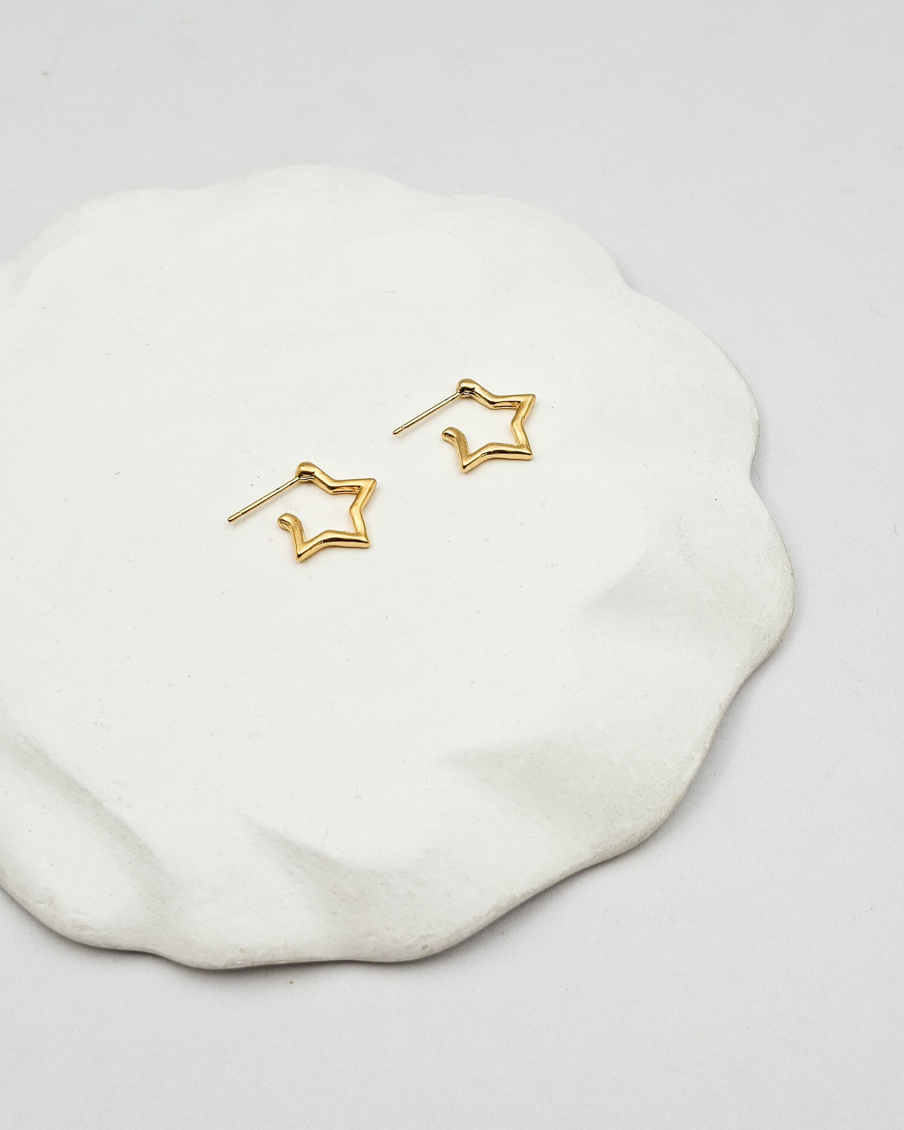 עגילי חישוק קטנים בצורת כוכבים בעלי בסיס צמוד לאוזן. העגילים בציפוי ישראלי איכותי של זהב 24 קראט. הפריט מגיע ארוז למתנה ועם אחריות לשנה. ניתן להוסיף ברכה אישית ופתק החלפה.