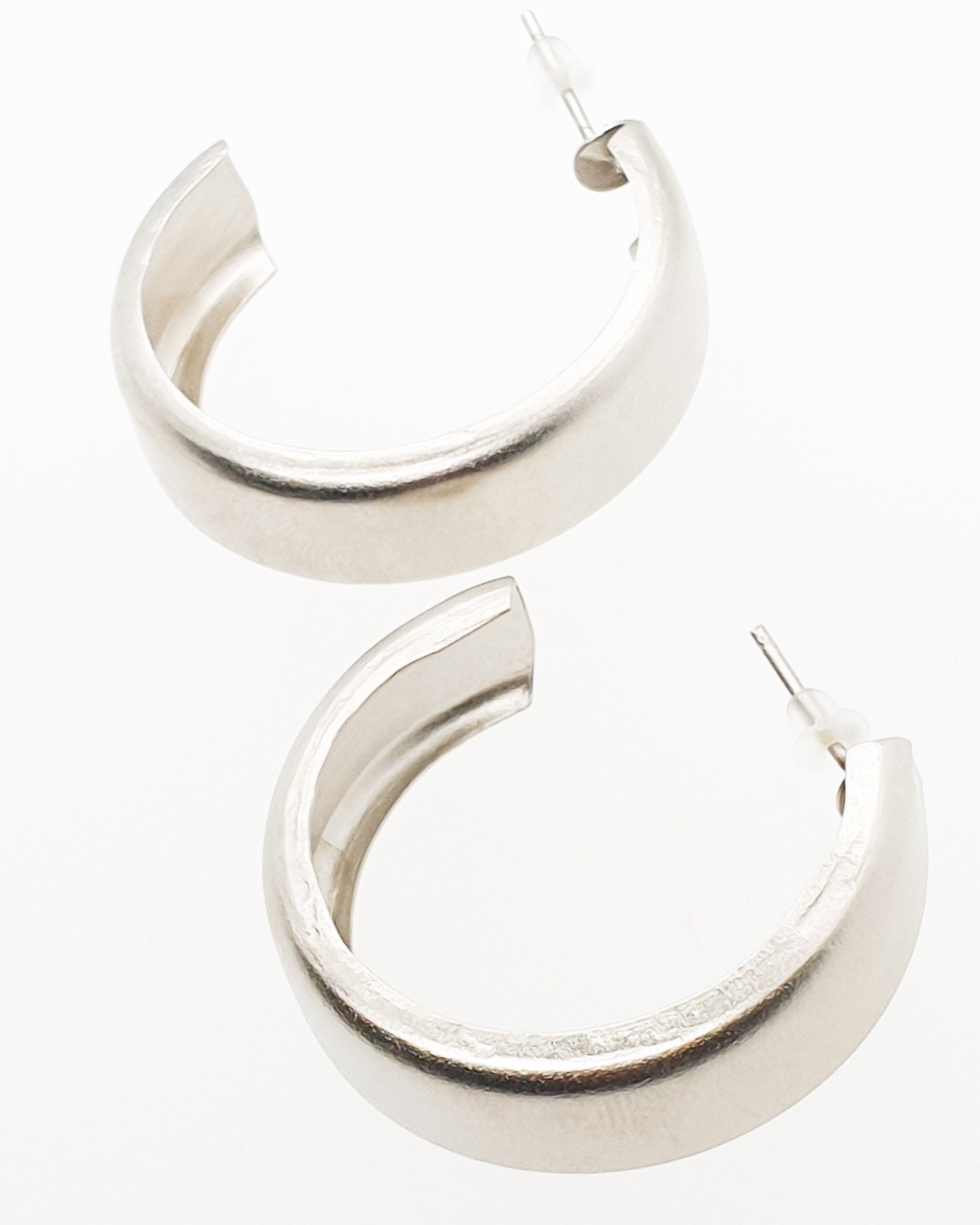 עגילי חישוק צמודים ופתוחים מאחור, בעלי נוכחות מרשימה ביותר וקלי משקל. קוטר העגילים 3.3 ס"מ, רוחב -1 ס"מ. ציפוי ישראלי איכותי של כסף ובגימור מט. הפריט מגיע ארוז למתנה ועם אחריות לשנה. ניתן להוסיף ברכה אישית ופתק החלפה.