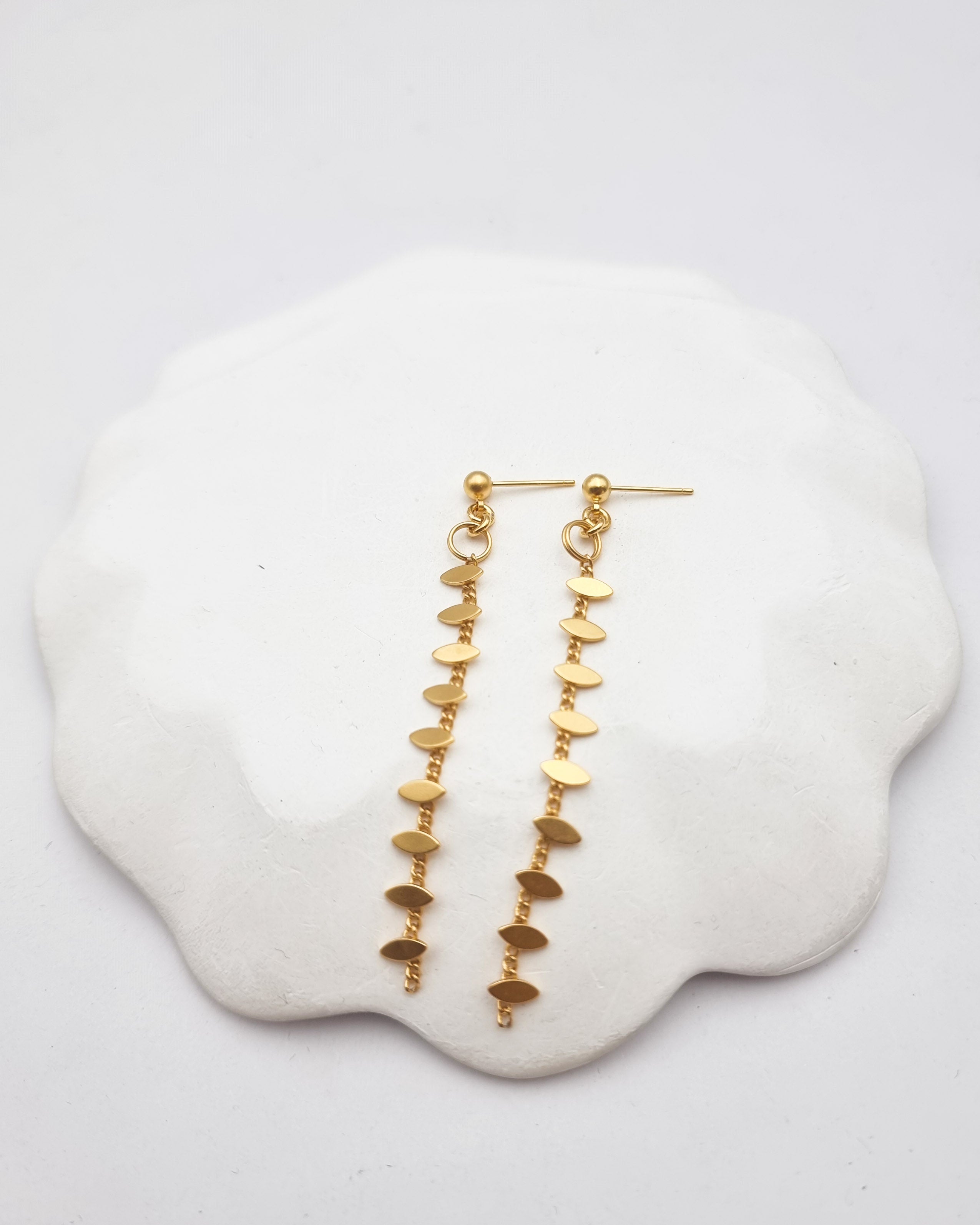 עגילי חוליות צמודים בצורת רצף עיניים קטנות, עגילים עדינים ובעלי תנועתיות. העגילים בציפוי ישראלי איכותי של זהב 24 קראט. הפריט מגיע ארוז למתנה ועם אחריות לשנה. ניתן להוסיף ברכה אישית ופתק החלפה.