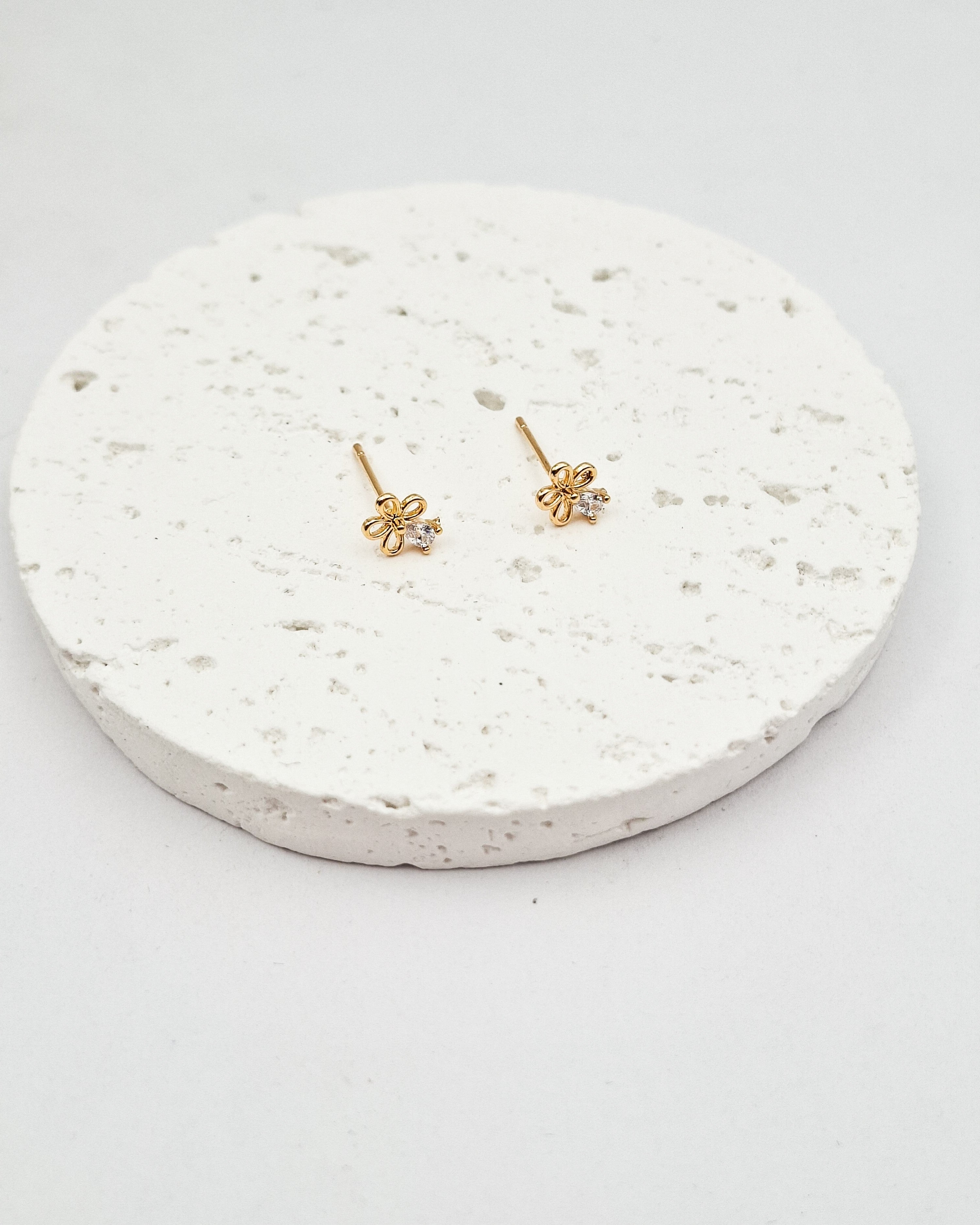 עגילים צמודים קטנטנים בצורת פרחים משובצים זירקונים. העגילים בציפוי ישראלי איכותי והיפואלרגני של זהב 24 קראט. הפריט מגיע ארוז למתנה ועם אחריות לשנה. ניתן להוסיף ברכה אישית ופתק החלפה.