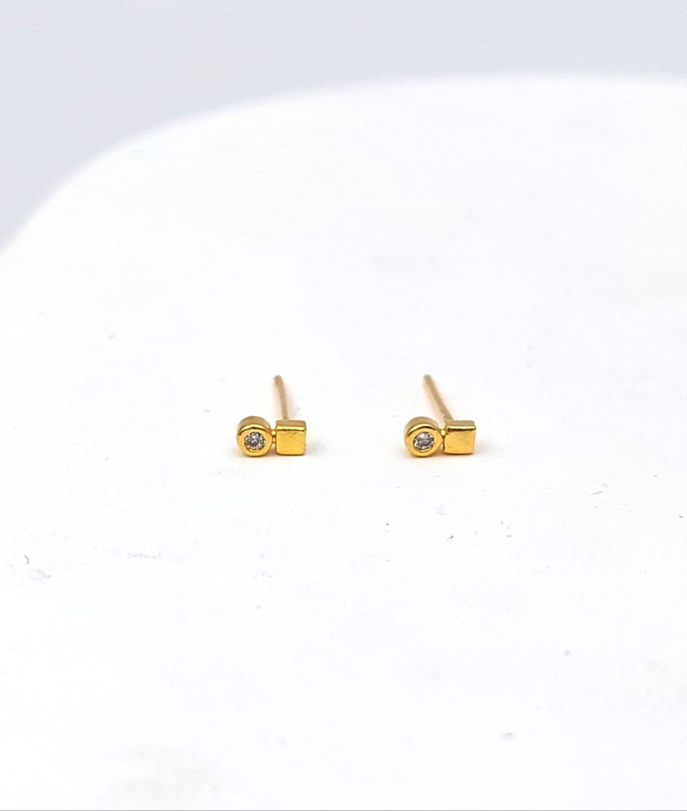 עגילים צמודים קטנטנים בצורת קוביה וליידה זירקון שקוף עגול. העגילים בציפוי ישראלי איכותי של זהב 24 קראט ובגימור מט. הפריט מגיע ארוז למתנה ועם אחריות לשנה. ניתן להוסיף ברכה אישית ופתק החלפה.