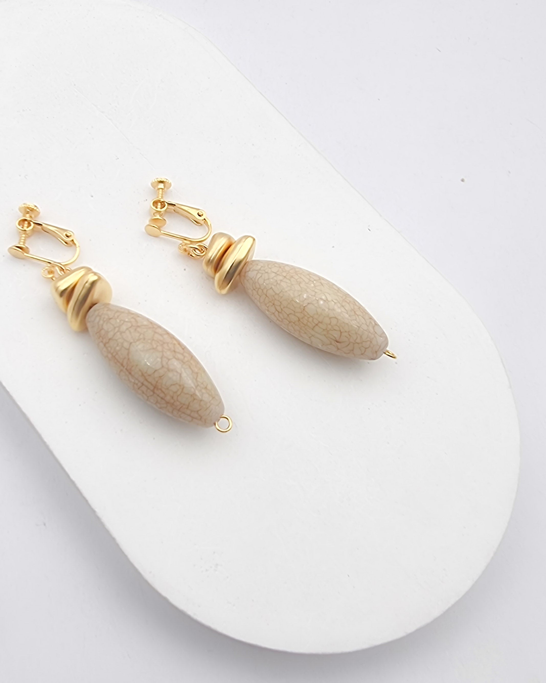 עגילי קליפס תלויים המורכבים מאלמנט דמוי שייש ומעליו אלמנט בצורת א-סימטרי מצופה זהב. העגילים בציפוי ישראלי איכותי של זהב 24 קראט. הפריט מגיע ארוז למתנה ועם אחריות לשנה. ניתן להוסיף ברכה אישית ופתק החלפה.