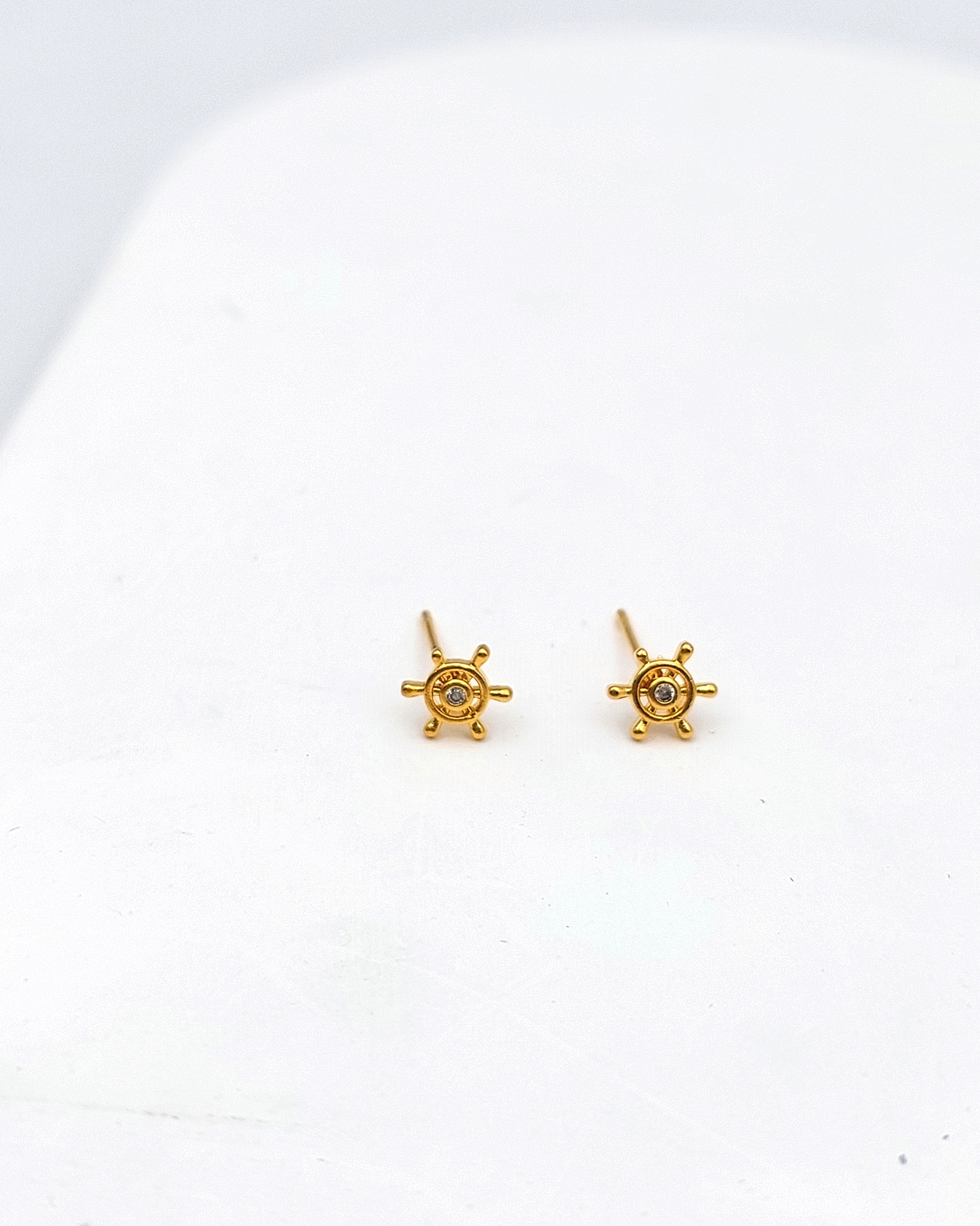 עגילים צמודים קטנים בצורת הגה של ספינה עם זירקון משובץ במרכז. העגילים בציפוי ישראלי איכותי של זהב 24 קראט ובגימור מט. הפריט מגיע ארוז למתנה ועם אחריות לשנה. ניתן להוסיף ברכה אישית ופתק החלפה.