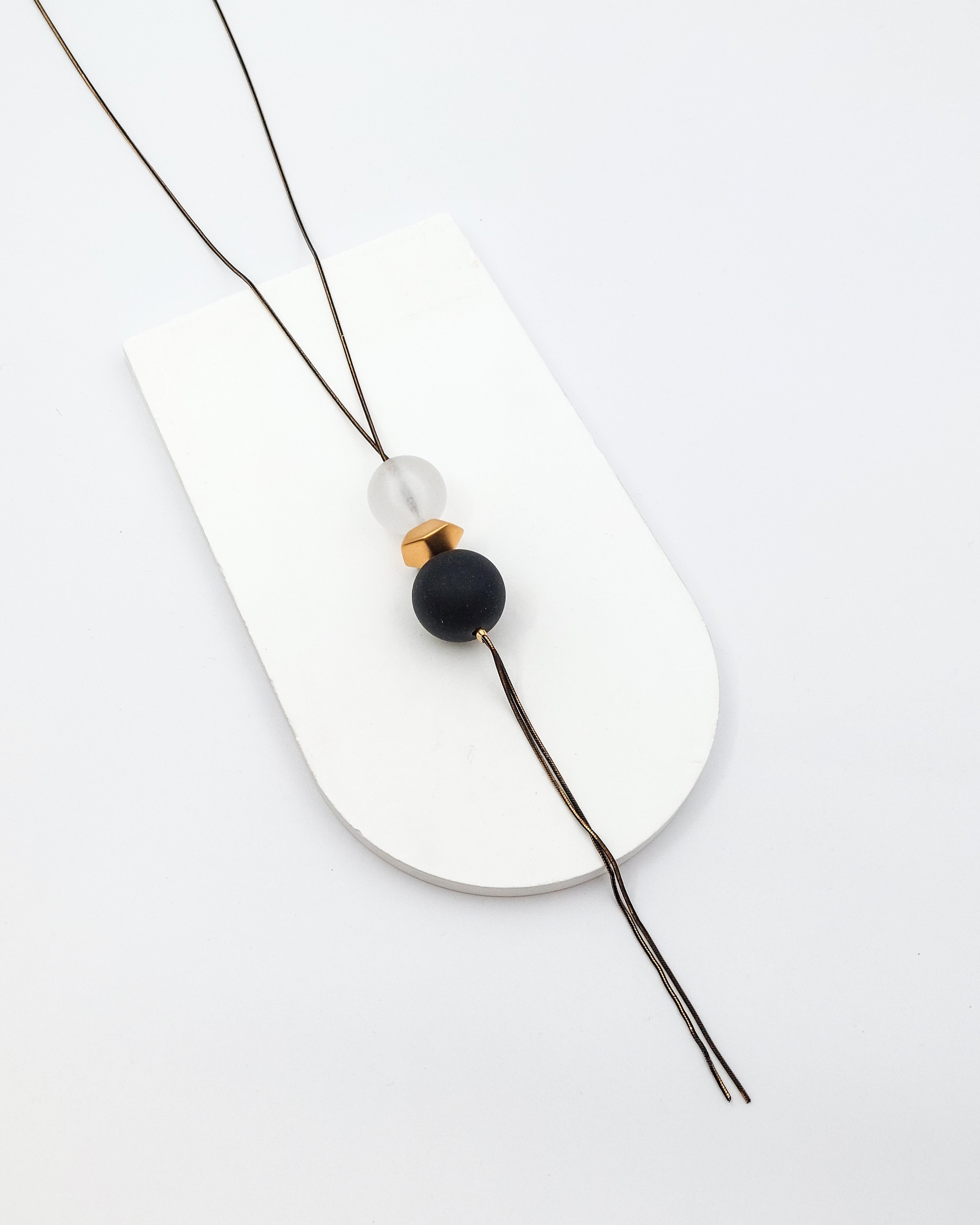 שרשרת עניבה דקיקה בציפוי שחור מנצנץ עם תליון המורכב מאלמנטים כדוריים- אחד שקוף חלבי והשני בציפוי סיליקון שחור, ואלמנט נוסף בצורת יהלום בציפוי ישראלי איכותי של זהב 24 קראט.