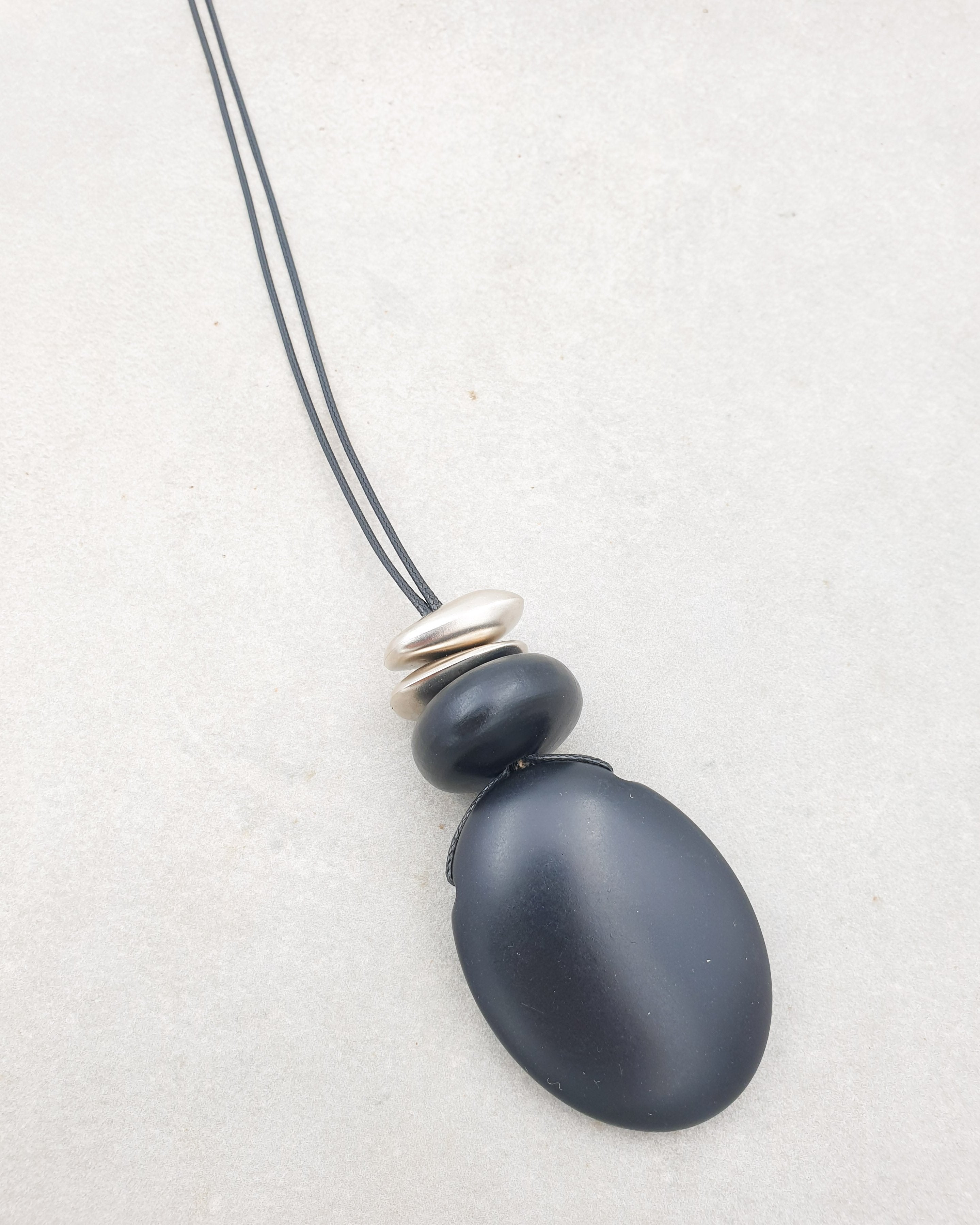 שרשרת דומיננטית בצורת עניבה עם תליון מורכב משילוב אלמנטים מעץ שחור ואלמנטים אסימטריים בציפוי כסף ובגימור מט. השרשרת עשויה חוט כותנה שחור והאלמנטים בציפוי ישראלי איכותי. הפריט מגיע ארוז למתנה ועם אחריות לשנה. ניתן להוסיף ברכה אישית ופתק החלפה.