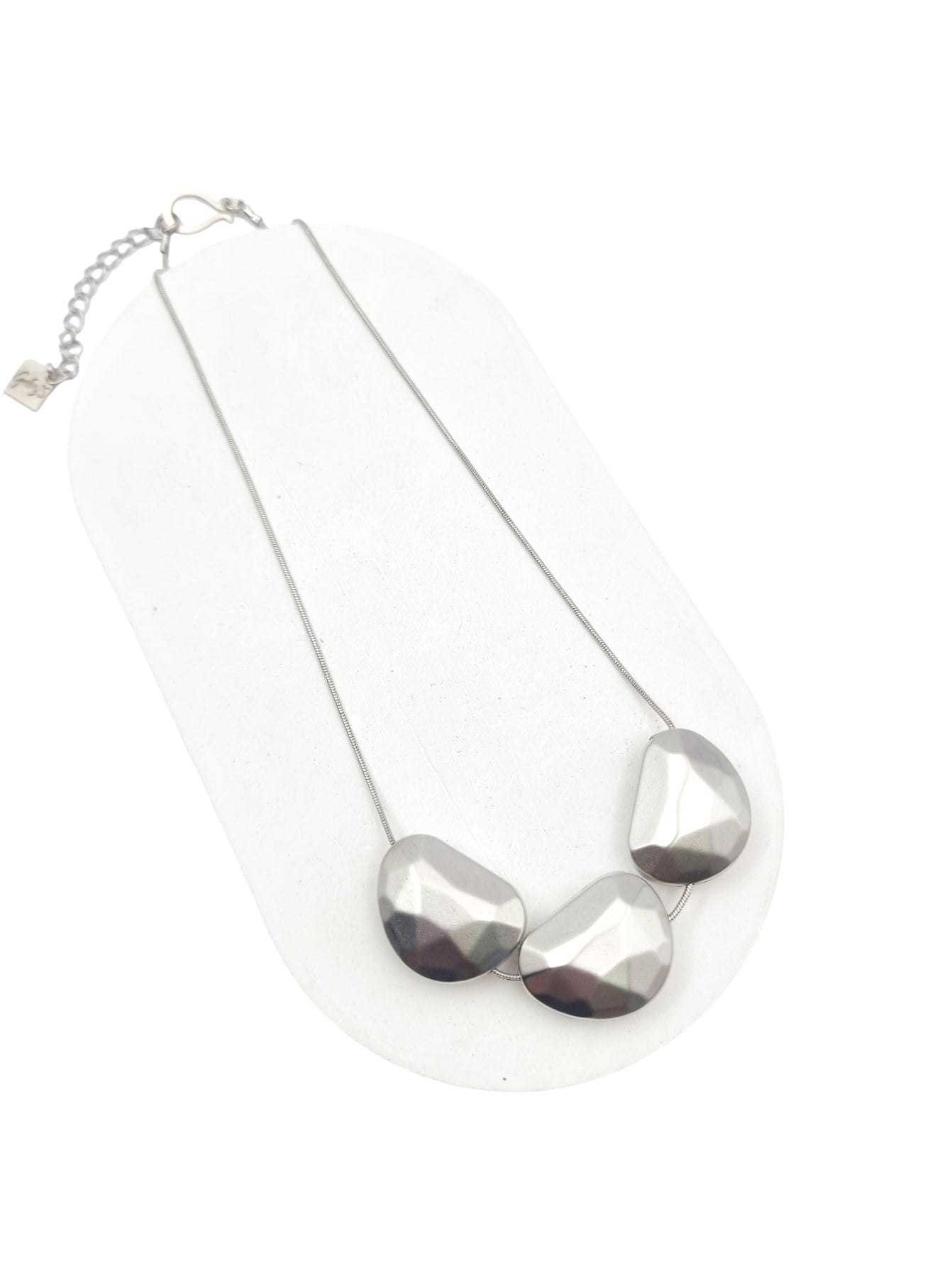 שרשרת קצרה אלגנטית שעליה שלושה אלמנטים סלעיים מסותתים. השרשרת בציפוי איכותי ישראלי של כסף מט.