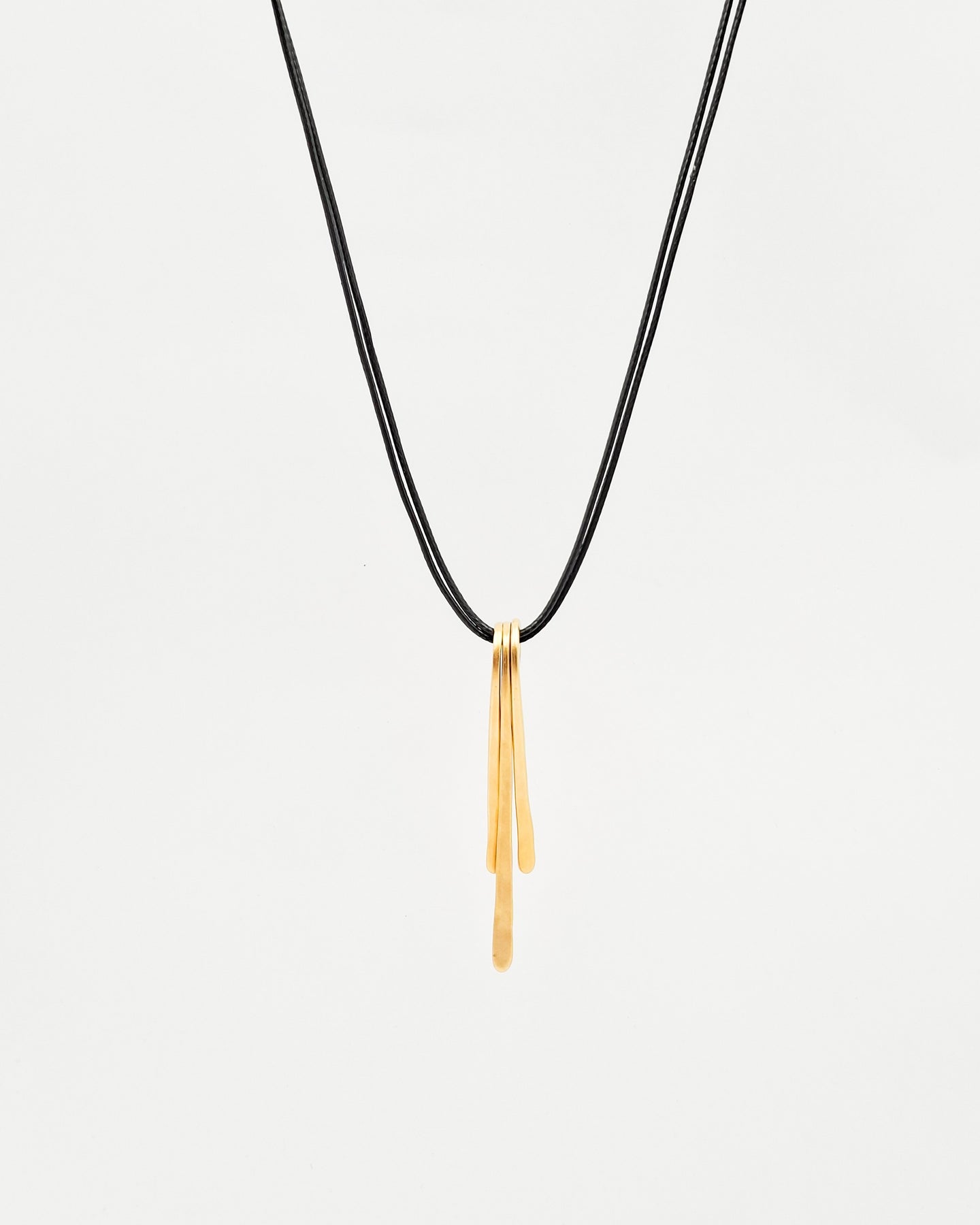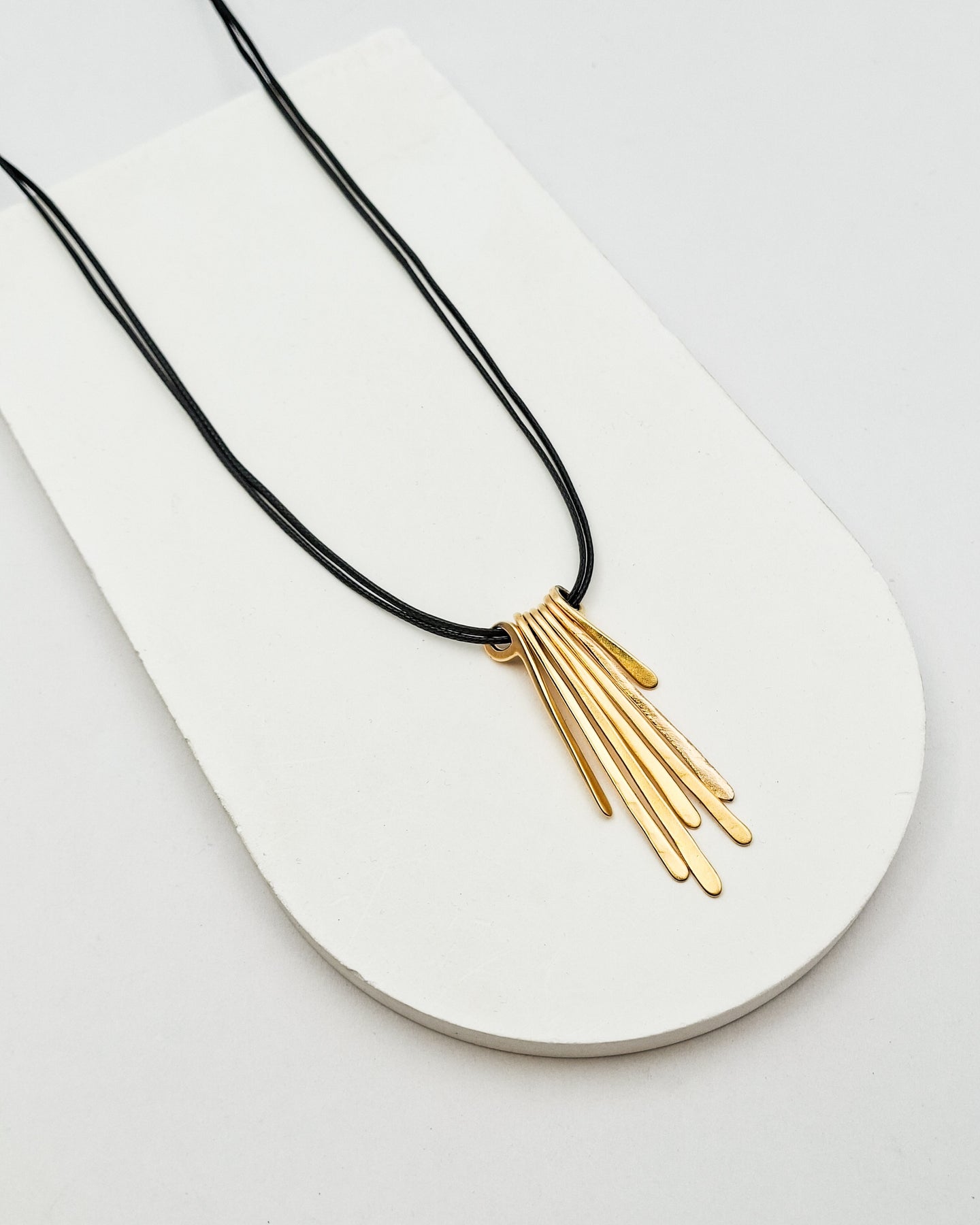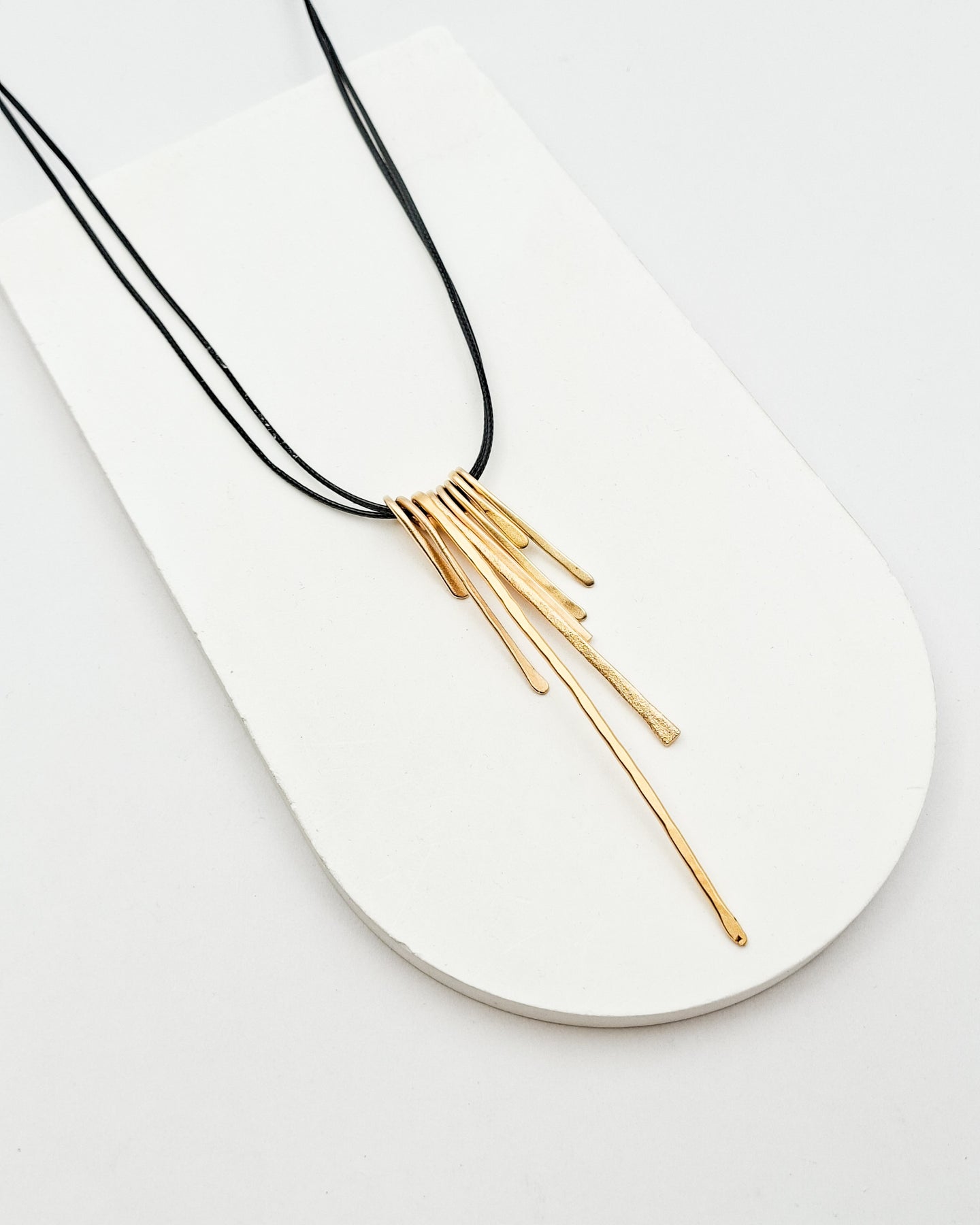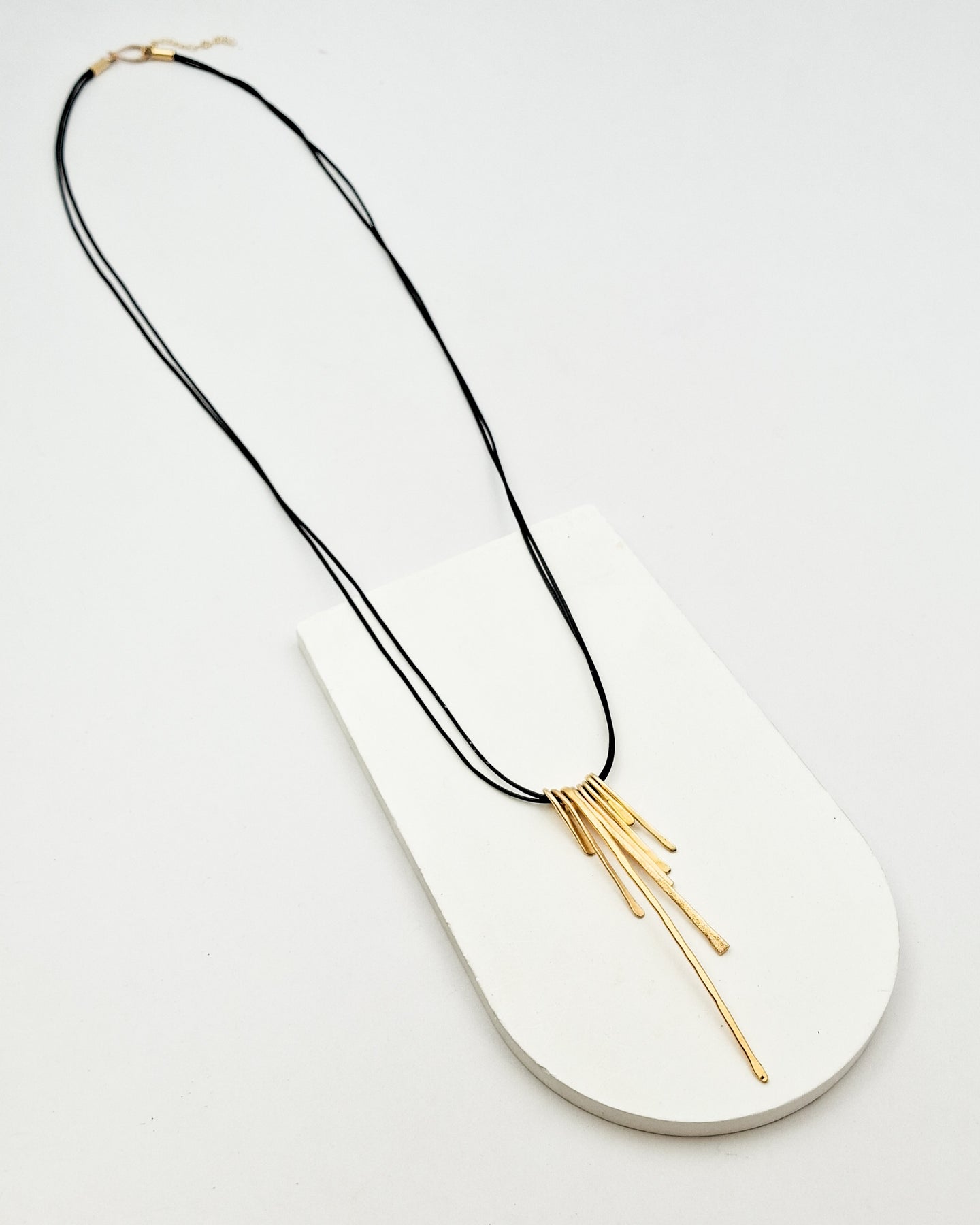 שרשרת ארוכה מהממת מחוט כותנה שחור ותליון עשוי מוטות מרוקעים בעבודת יד באורכים משתנים בציפוי זהב 24 קראט. לבחירתך השרשרת קיימת במבחר גדלים ואורכים של התליון. הפריט מגיע ארוז למתנה ועם אחריות לשנה. ניתן להוסיף ברכה אישית ופתק החלפה.