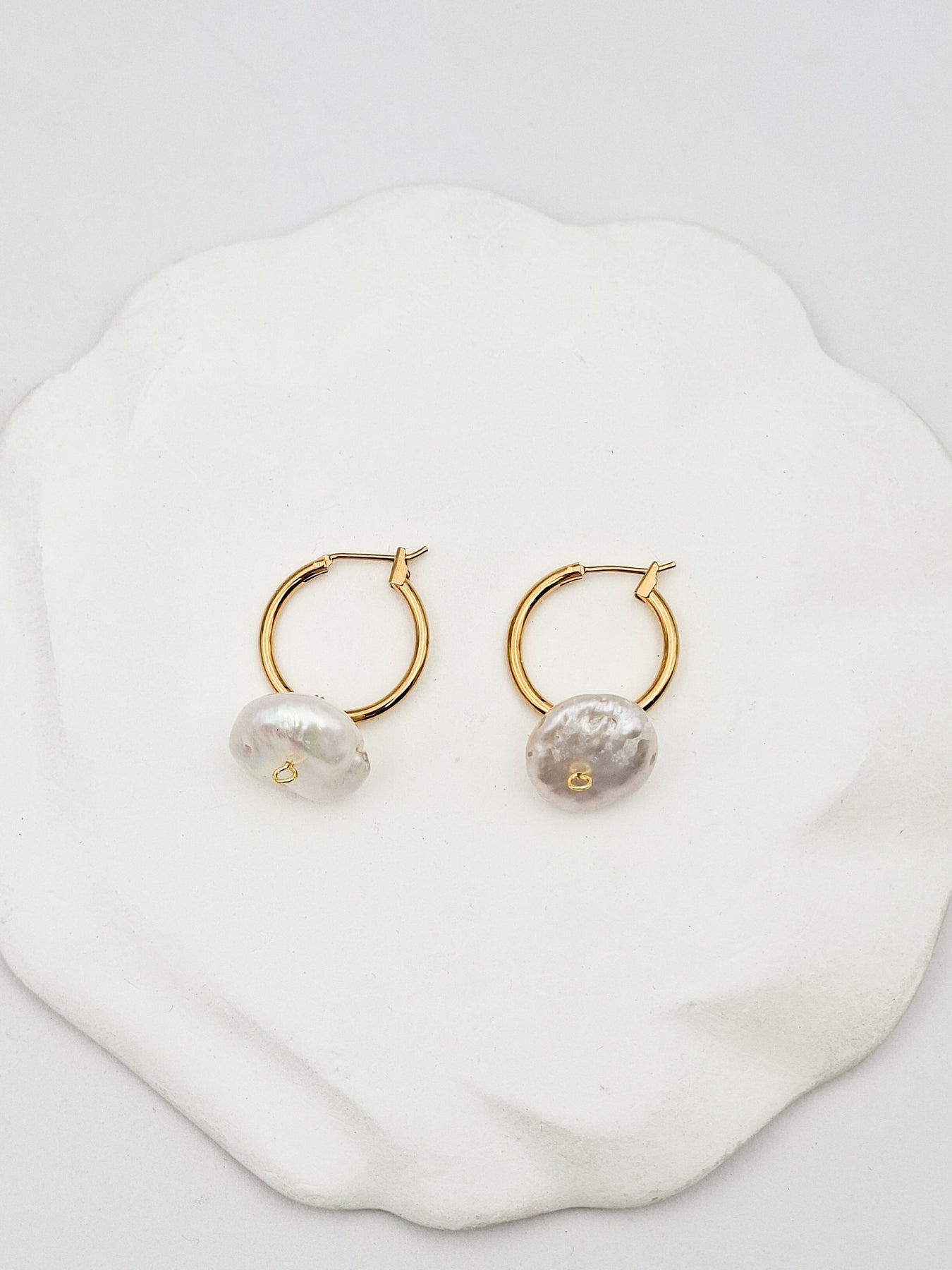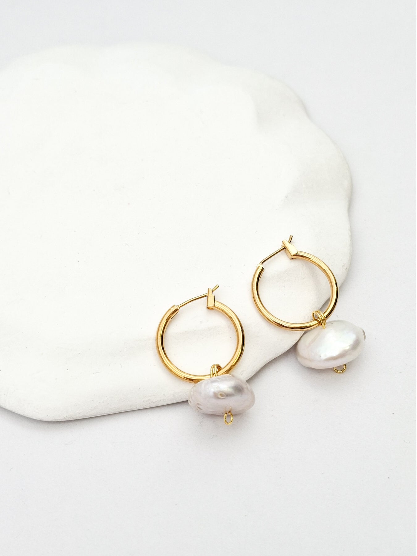 "עגילי חישוק עם תליון פנינה אמיתית פראית ומשוטחת. ניתן לענוד גם ללא הפנינה כחישוק "נקי.