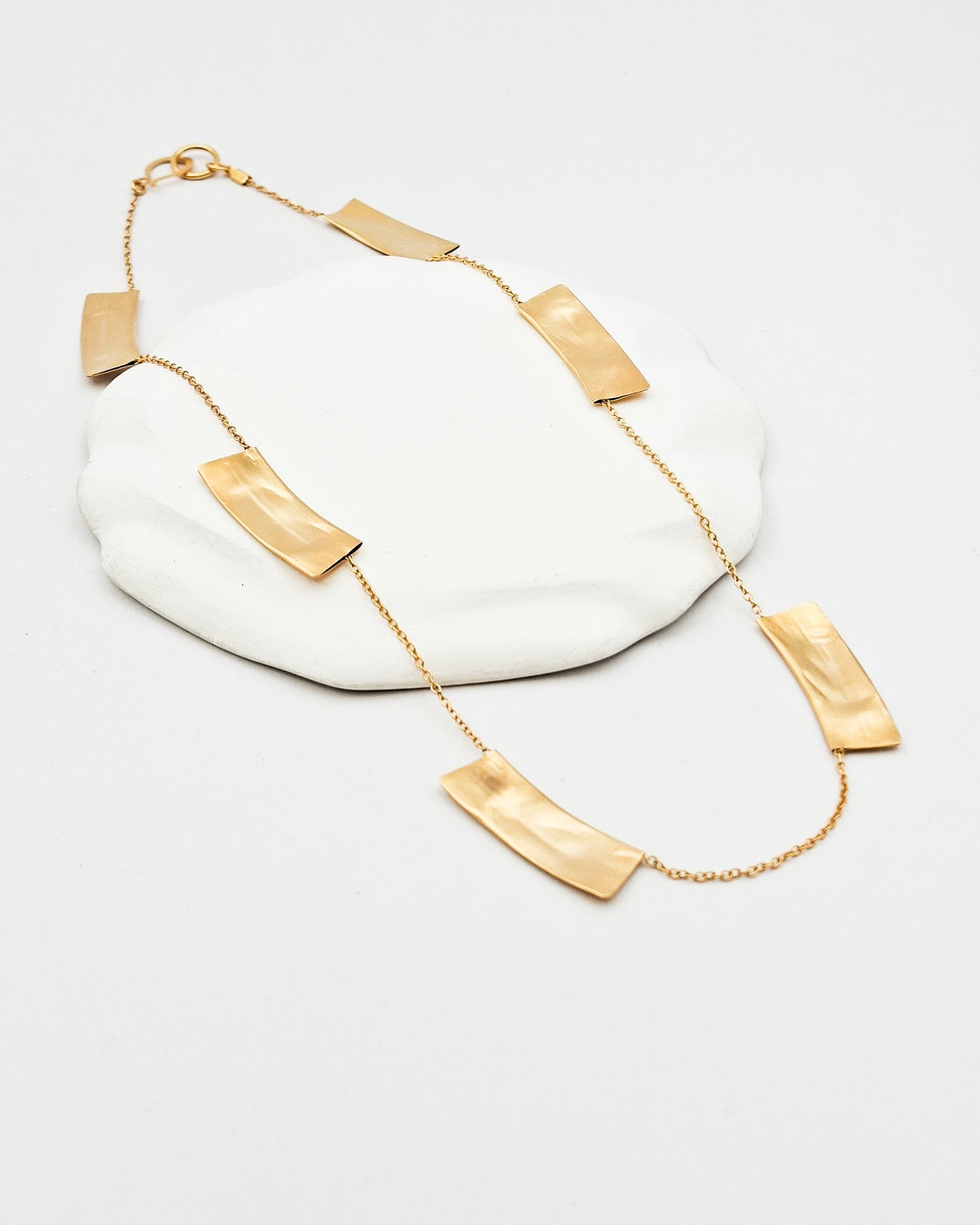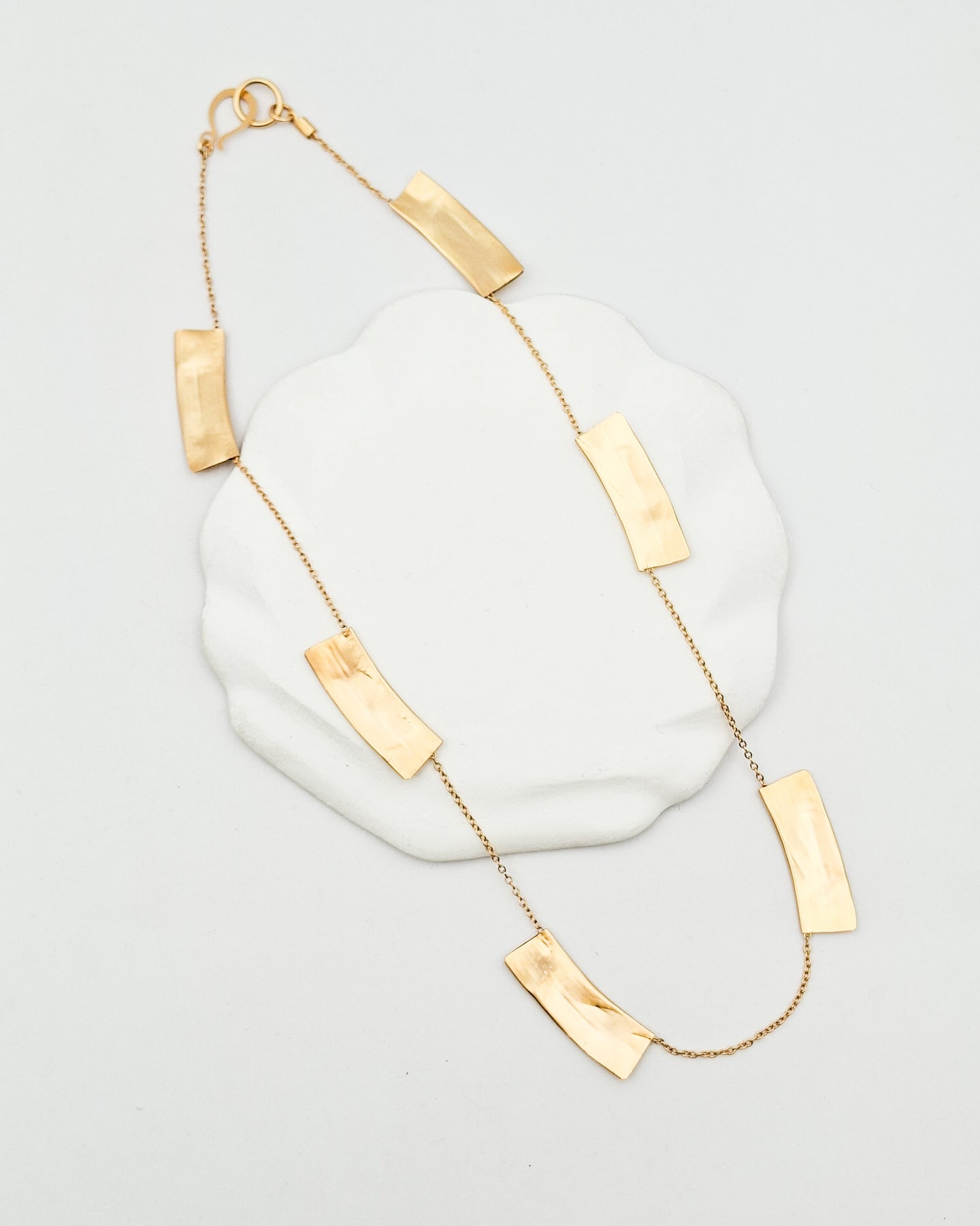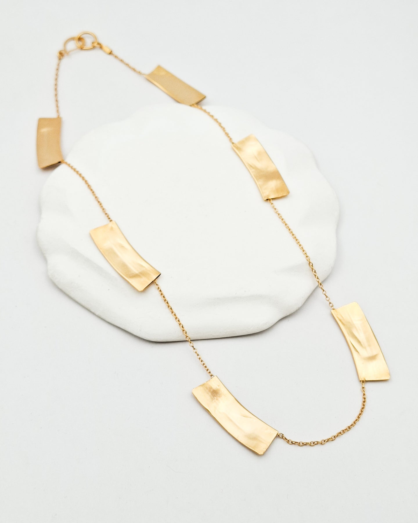 שרשרת חוליות קצרה ועליה פזורים אלמנטים מלבניים עשויים בעבודת מלאה בטקסטורה מרוקעת קלות. השרשרת והאלמנטים בציפוי ישראלי איכותי של זהב 24 קראט. הפריט מגיע ארוז למתנה ועם אחריות לשנה. ניתן להוסיף ברכה אישית ופתק החלפה.