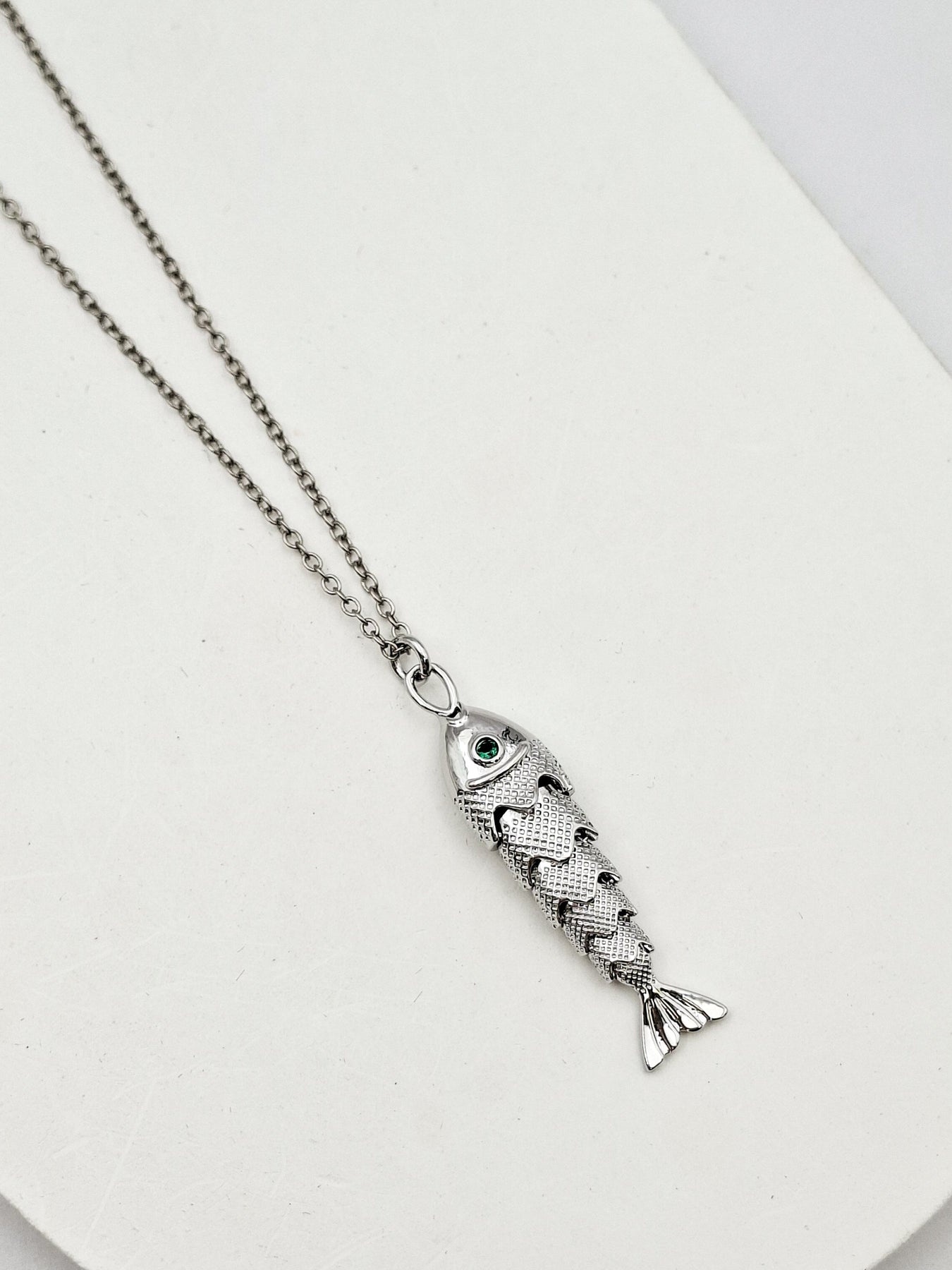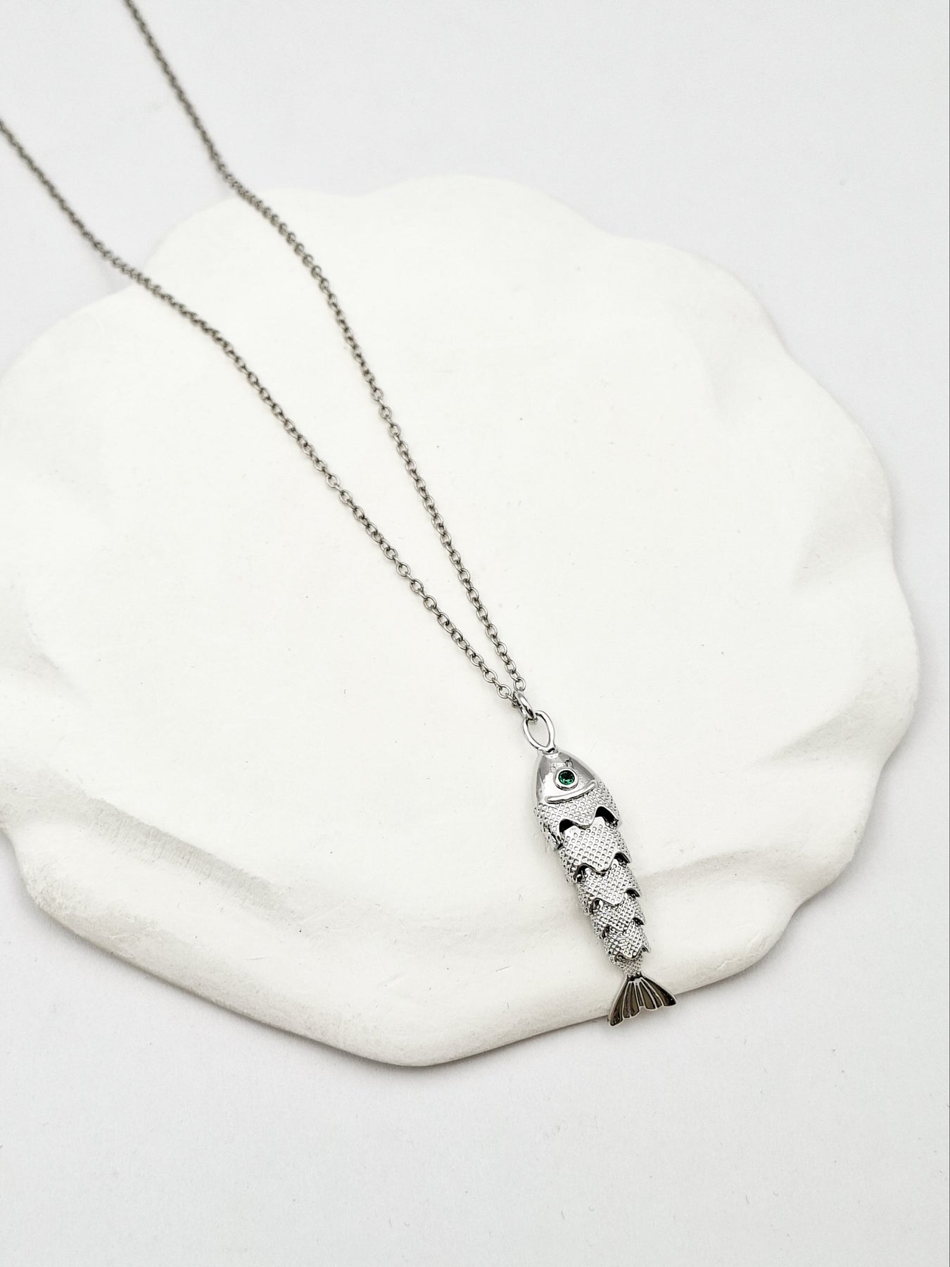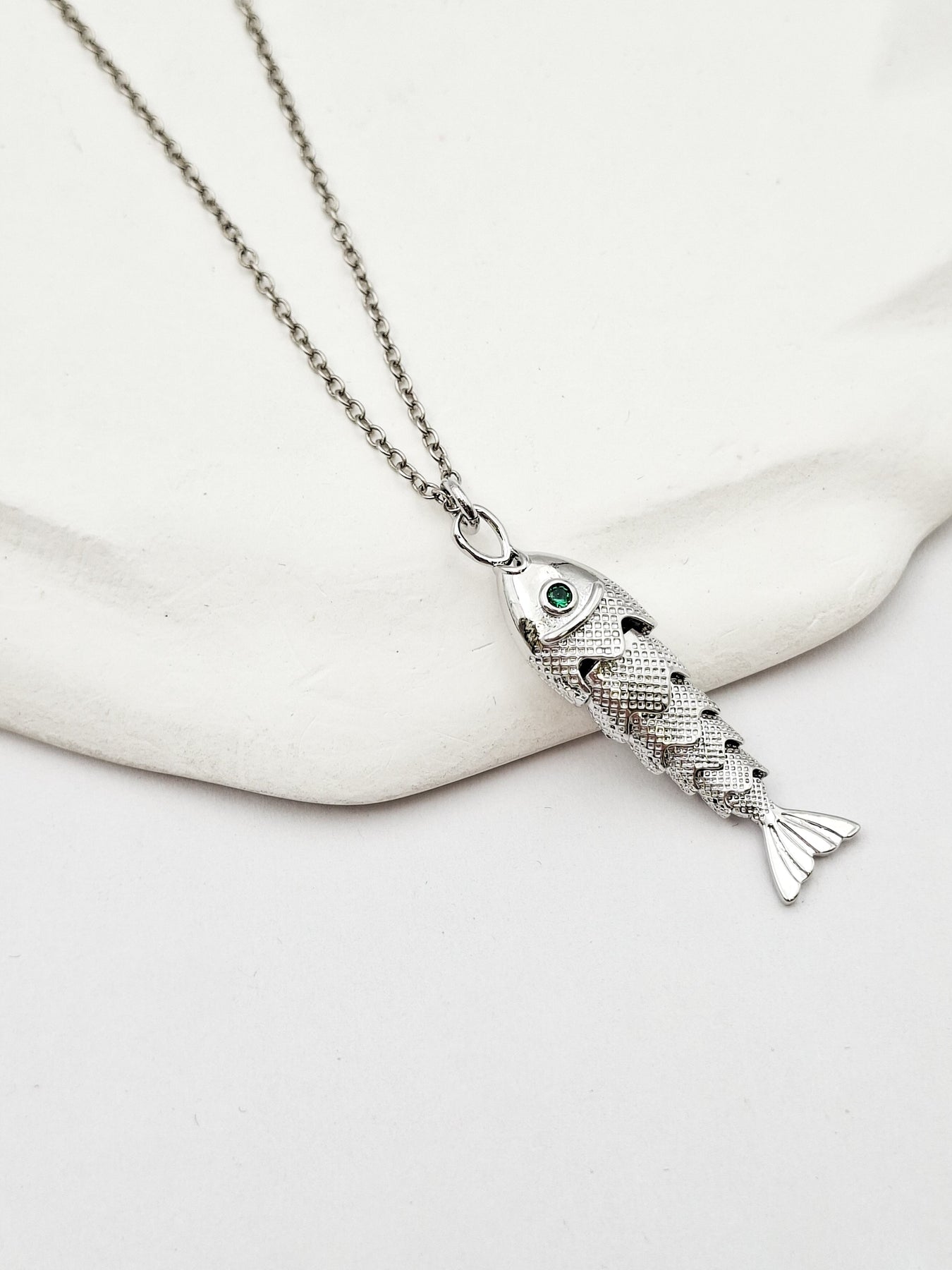 שרשרת חוליות קטנות ארוכה עם תליון של דג בעל תנועתיות משובץ קריסטל ירוק. השרשרת בציפוי ישראלי איכותי של כסף. הפריט מגיע ארוז למתנה ועם אחריות לשנה. ניתן להוסיף ברכה אישית ופתק החלפה.