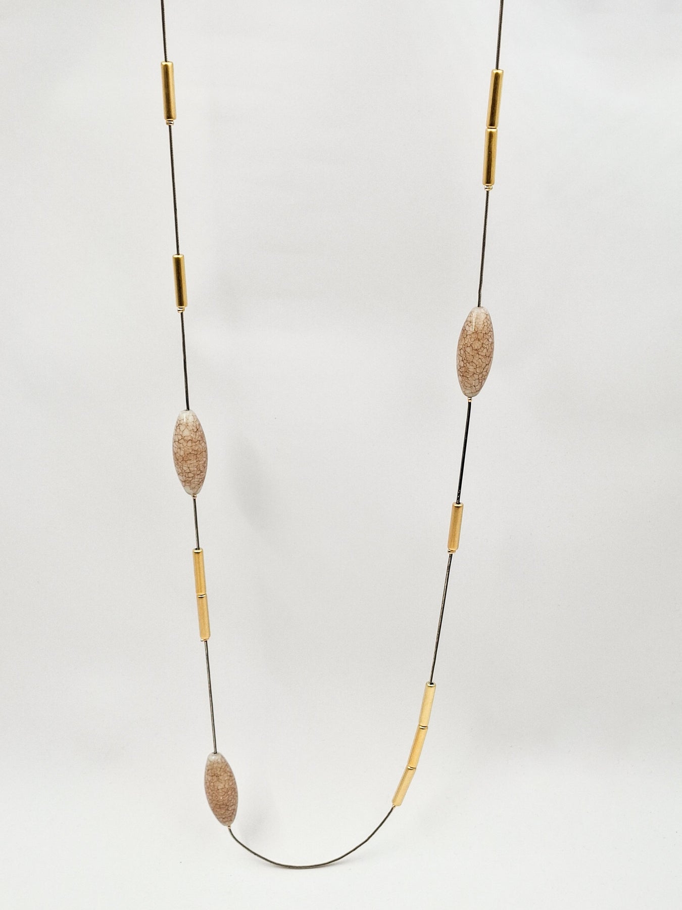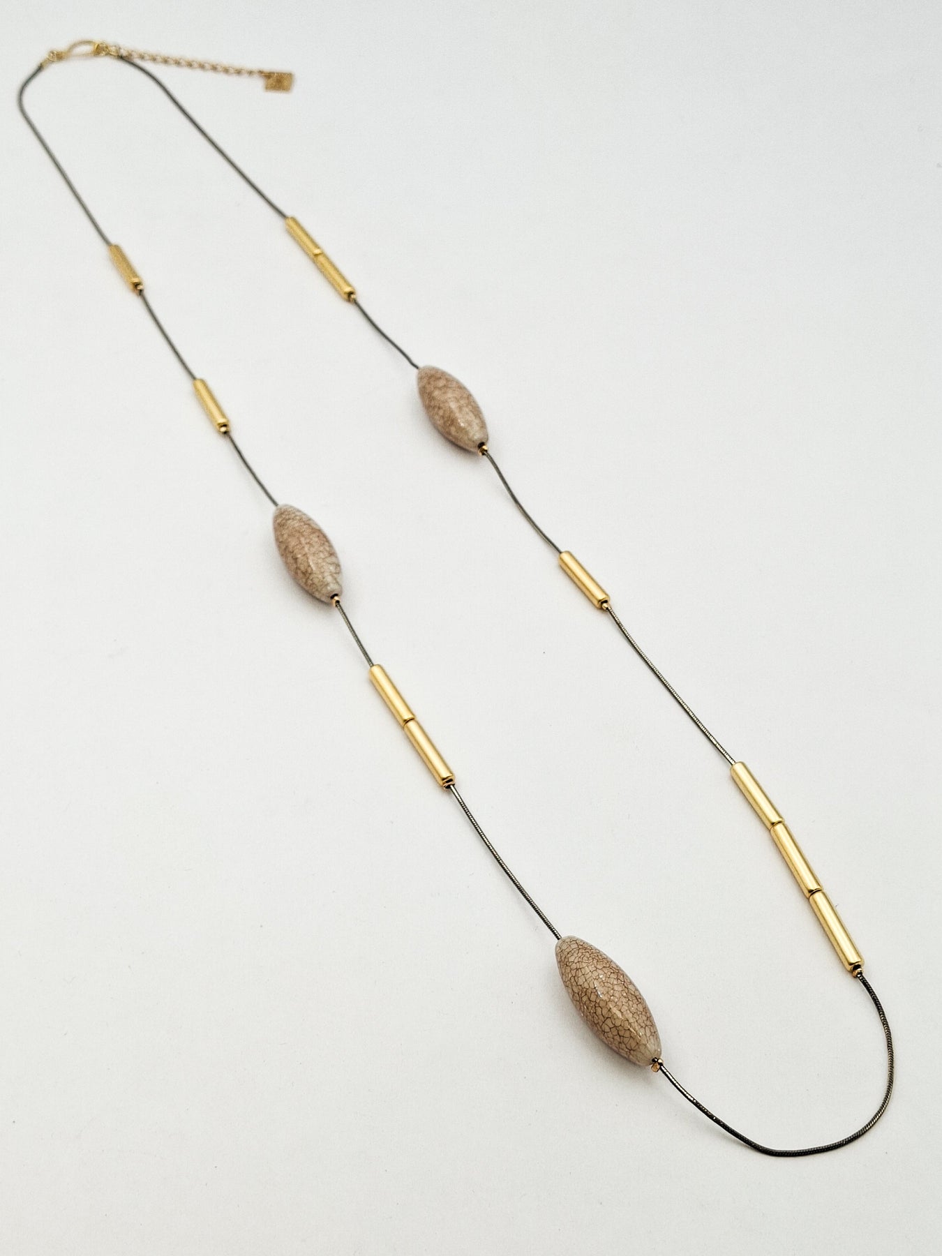 שרשרת ארוכה ומרשימה בגוון אפור מנצנץ עם אלמנטים דמויי שיש אובאלים בשילוב אלמנטים גליליים בציפוי ישראלי איכותי של זהב 24 קראט. הפריט מגיע ארוז למתנה ועם אחריות לשנה. ניתן להוסיף ברכה אישית ופתק החלפה.