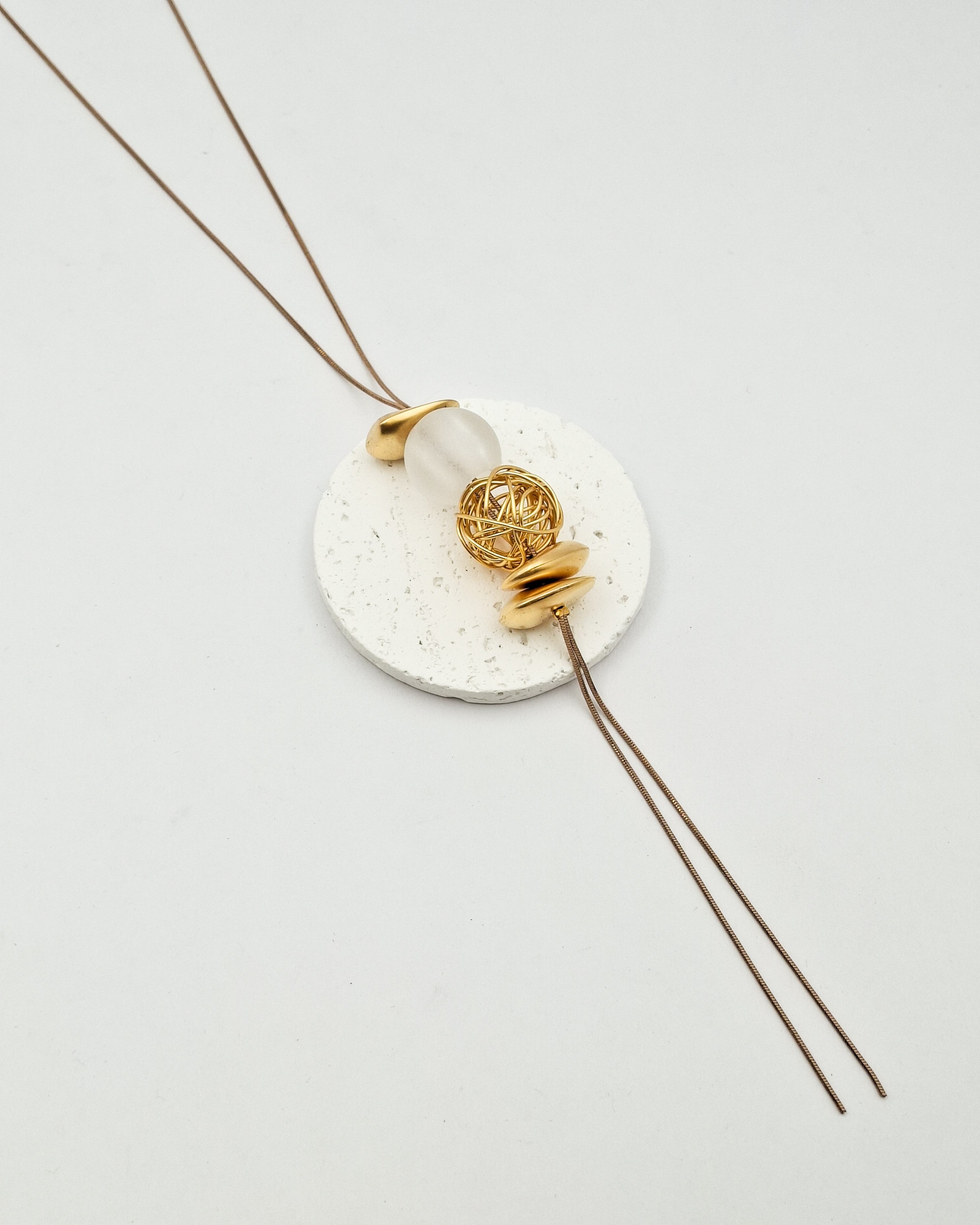 שרשרת ארוכה בצורת עניבה עם אלמנט כדורי עשוי אקריל חלבי, אלמנטים אסימטריים בעלי נפח וכדור סבך חוטים עשוי בעבודת יד. השרשרת בציפוי אופווייט מנצנת והאלמנטים בציפוי ישראלי איכותי של זהב 24 קראט. הפריט מגיע ארוז למתנה ועם אחריות לשנה. ניתן להוסיף ברכה אישית ופתק החלפה.