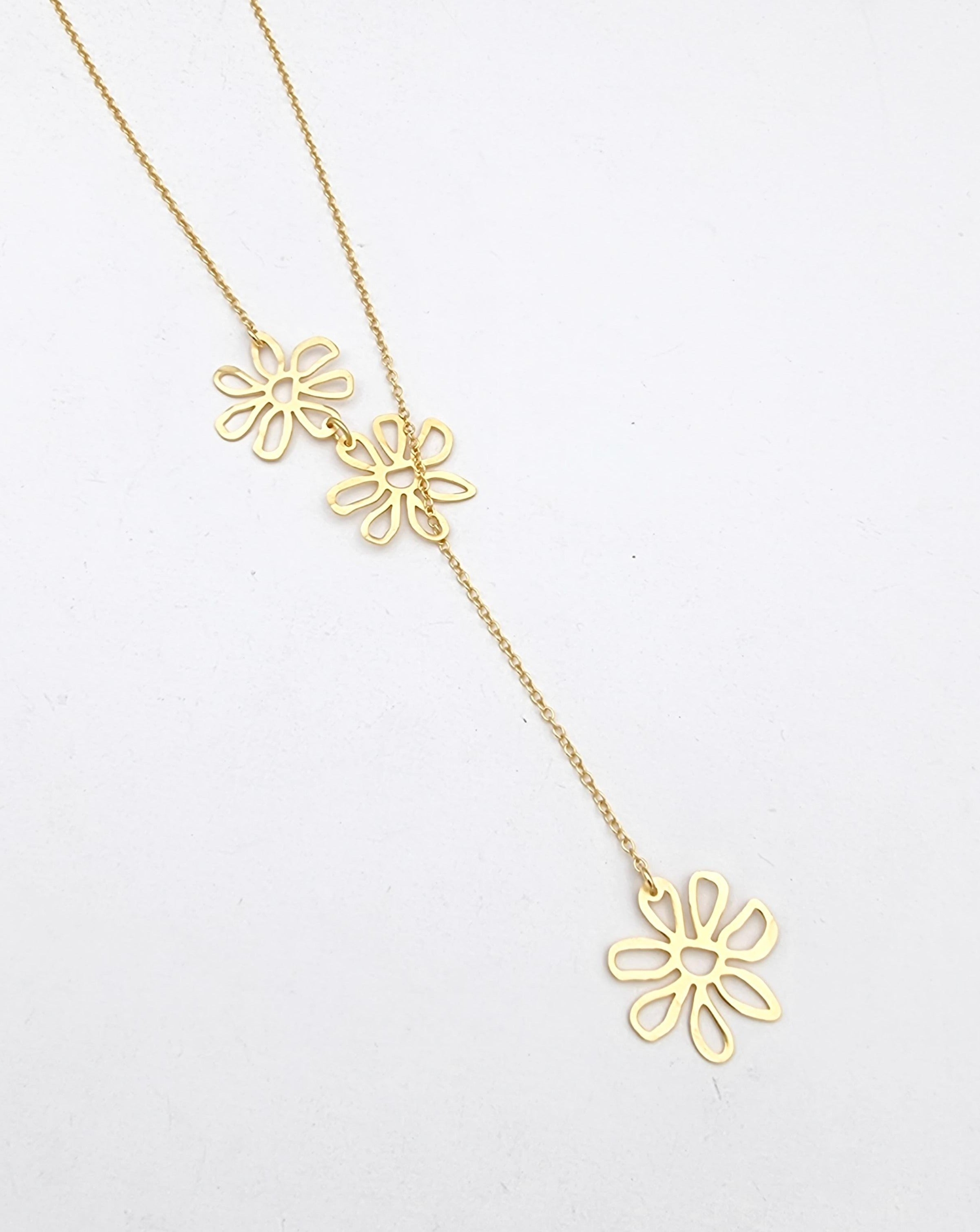 שרשרת בצורת עניבה, עשויה חוליות קטנות ומשלבת תליונים בצורת פרחים חלולים וא-סימטריים עשויים בעבודת יד. השרשרת בציפוי ישראלי איכותי של זהב 24 קראט.