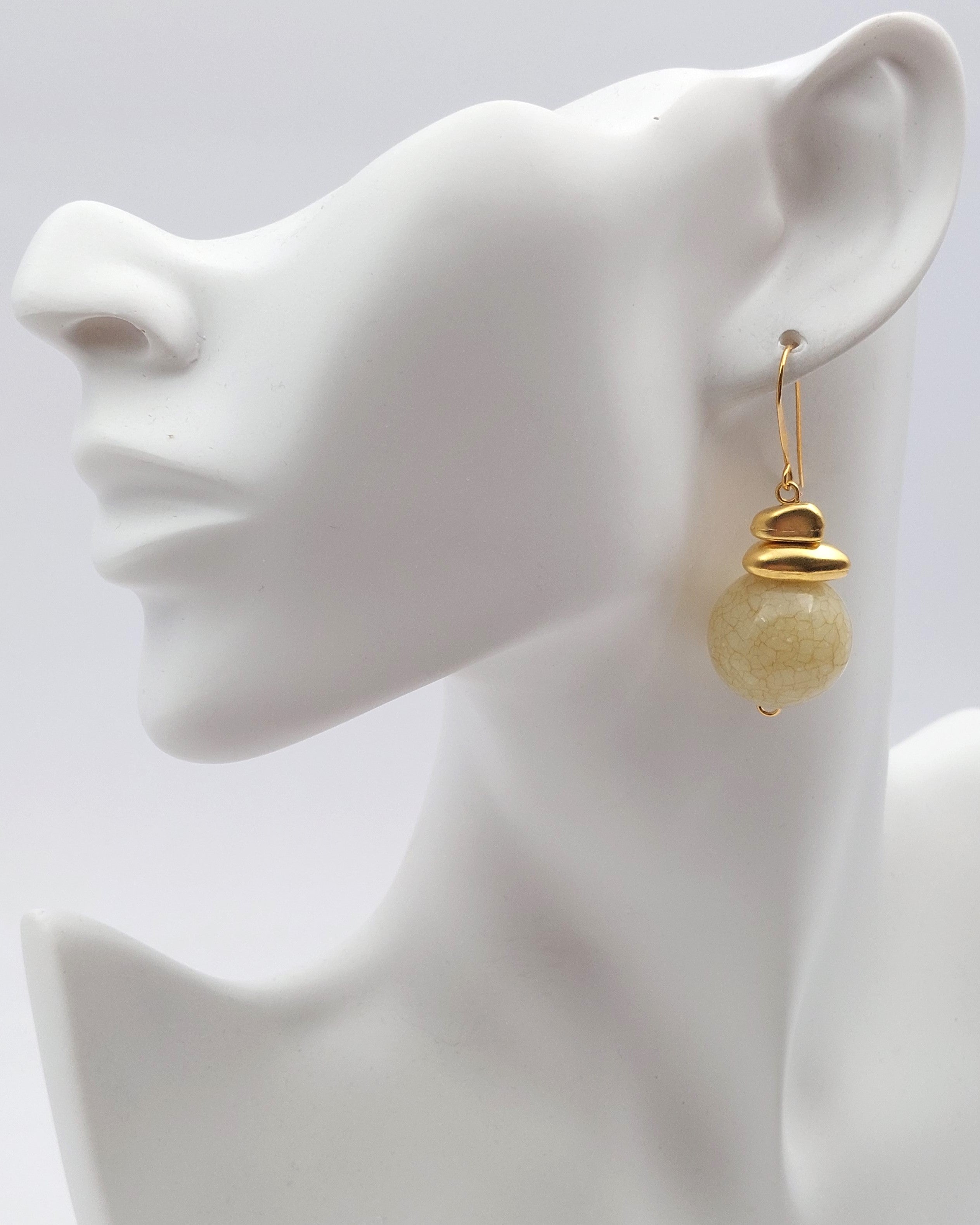 עגילים תלויים גדולים המורכבים מאלמנט כדורי דמוי שייש ואלמנטים א-סימטריים בעלי נפח בציפוי זהב 24 קראט. העגילים בציפוי ישראלי איכותי של זהב 24 קראט. תולה העגיל הינו היפואלרגני הפריט מגיע ארוז למתנה ועם אחריות לשנה. ניתן להוסיף ברכה אישית ופתק החלפה.