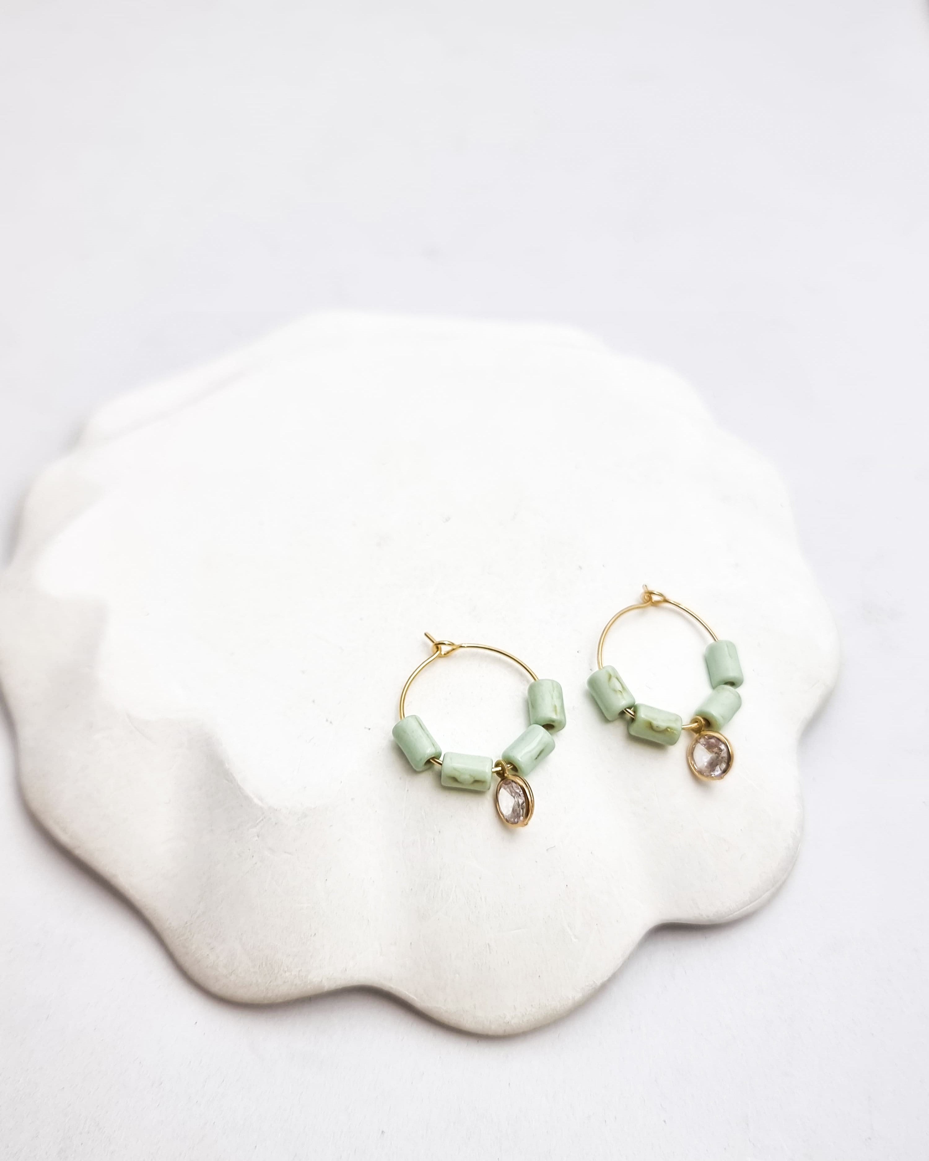 עגילי חישוק עדינים אך בעלי נוכחות המשלבים חרוזי זכוכית דמויי אבן בגוון תכלת ירקרק ותליון מרכזי של זירקון ממוסגר בצורת עיגול. העגילים בציפוי איכותי ישראלי והיפו- אלרגני של זהב 24 קראט.