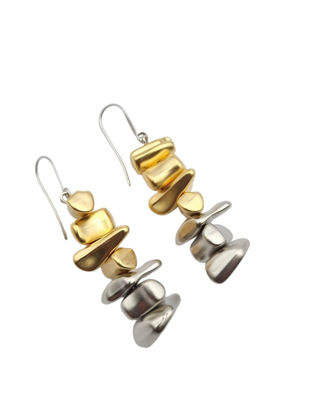 עגילים תלויים עם אלמנטים א-סימטריים, העגילים בציפוי איכותי ישראלי של זהב 24 קראט בשילוב ציפוי כסף. תולה העגיל היפו- אלרגני.