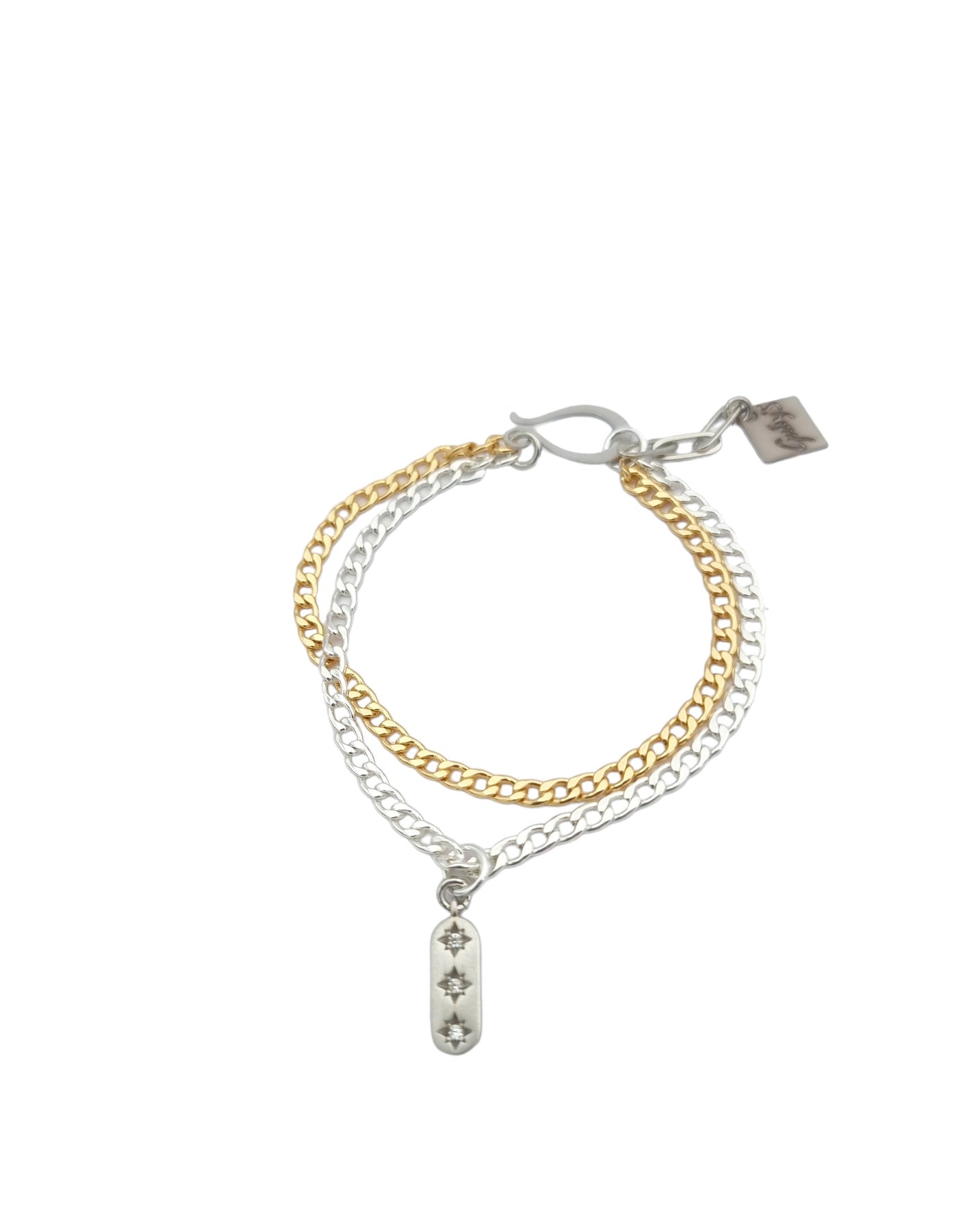 צמיד המורכב מ-2 שרשראות גורמט בציפוי זהב 24 קראט משולב בציפוי כסף  בתוספת תליון אובלי כסוף משובץ 3 זירקונים שקופים . צמיד עדין אך בעל נוכחות רבה ומרשימה. הפריט מגיע ארוז למתנה ועם אחריות לשנה. ניתן להוסיף ברכה אישית ופתק החלפה.