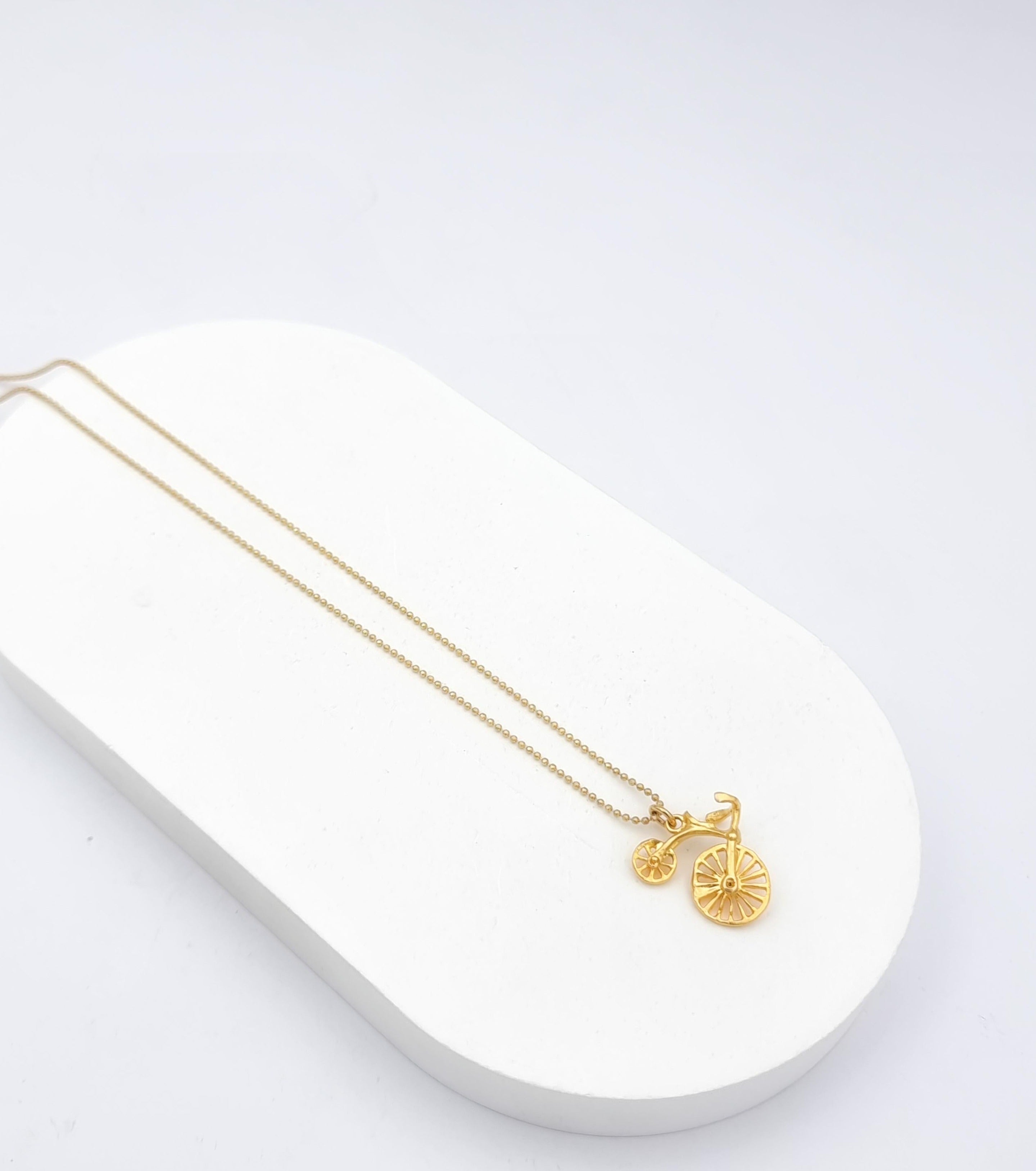 שרשרת כדוריות ארוכה ועדינה עם תליון אופניים סופר מיוחד. השרשרת בציפוי איכותי ישראלי של זהב 24 קראט.