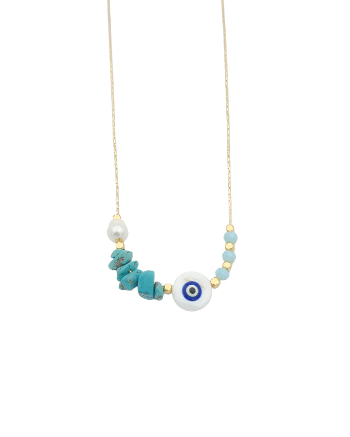 שרשרת עדינה א-סימטרית ותליון בצורת חמסה עשוי מצדף ועליו אמייל בצורת עין, בשילוב קריסטלים בגוון תכלת, אבני טורקיז ופנינה אמיתית.