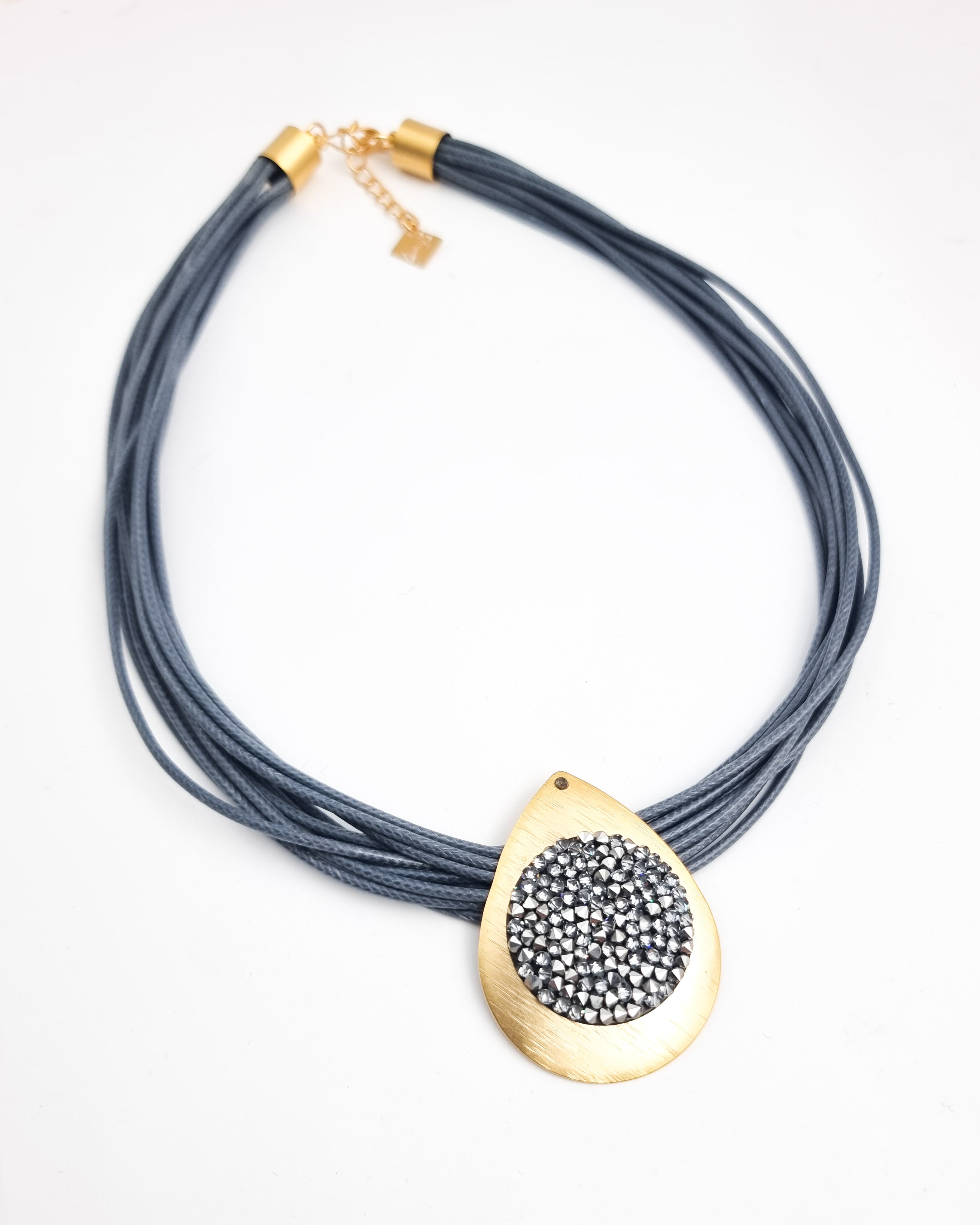 שרשרת קצרה, ומאוד מרשימה המורכבת ממקבץ חוטי כותנה איכותיים בגוון אפור כהה ועליהם תליון בצורת טיפה בטקסטורה מחורצת בשילוב מקבץ עגול של קריסטלי סברובסקי. התליון בציפוי ישראלי איכותי של זהב 24 קראט. השרשרת בעלת נוכחות מרשימה ביותר! הפריט מגיע ארוז למתנה ועם אחריות לשנה. ניתן להוסיף ברכה אישית ופתק החלפה.