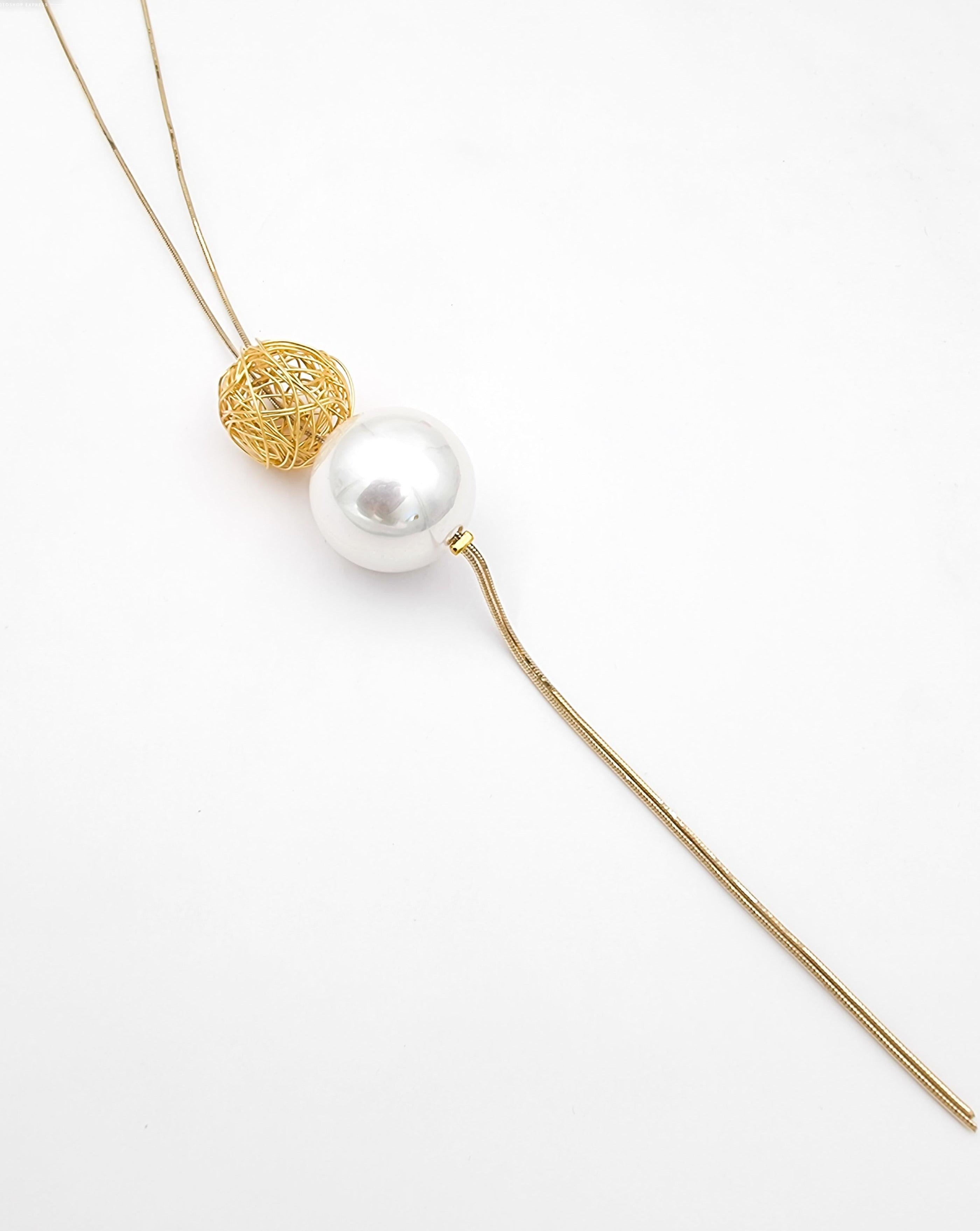 שרשרת עניבה ארוכה בציפוי אופווייט עם נצנוץ זהב עדין, עם אלמנט כדורי גדול דמוי פנינה ומעליו אלמנט כדור סבך עשוי בעבודת יד בציפוי ישראלי איכותי של זהב 24 קראט. שרשרת שמשדרגת כל הופעה וניתן לענוד גם מלופפת כשרשרת קצרה.